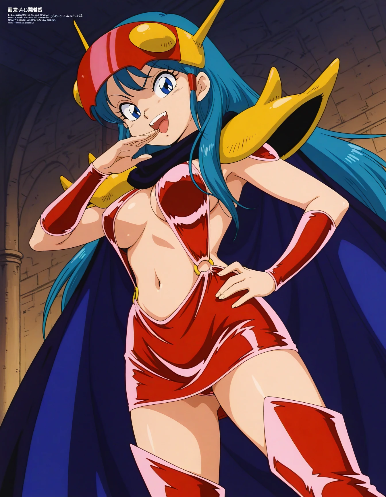 kuki rei, rei_onyomiko, 1girl, solo, long hair, breasts,blue eyes, skirt, thighhighs, navel, blue hair, boots, miniskirt, cape, armor, high heels,