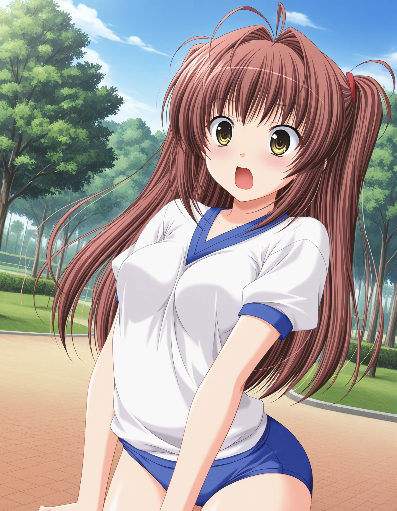 shirakawa anzu, brown hair, long hair, hair intakes, antenna hair, yellow eyes