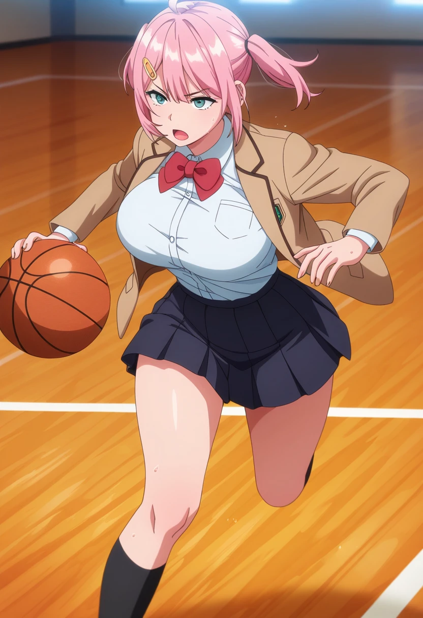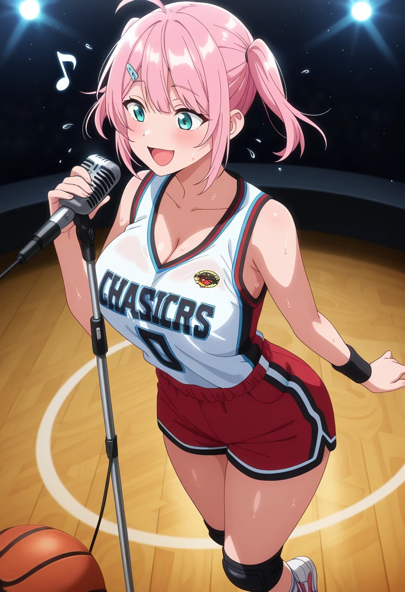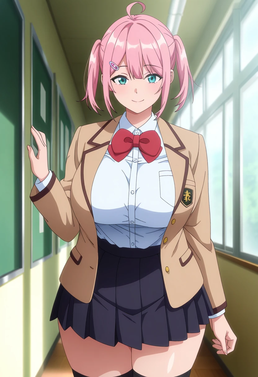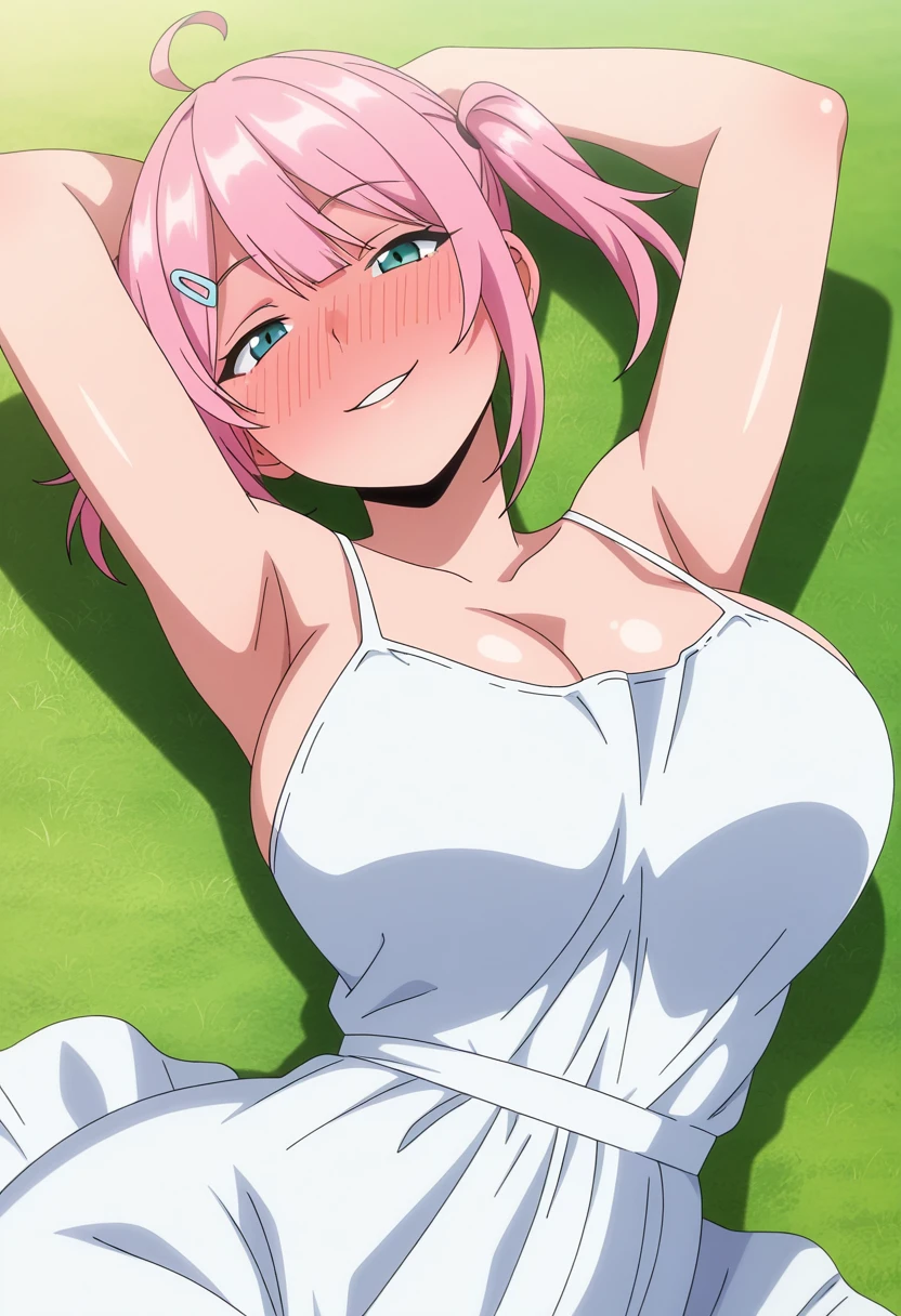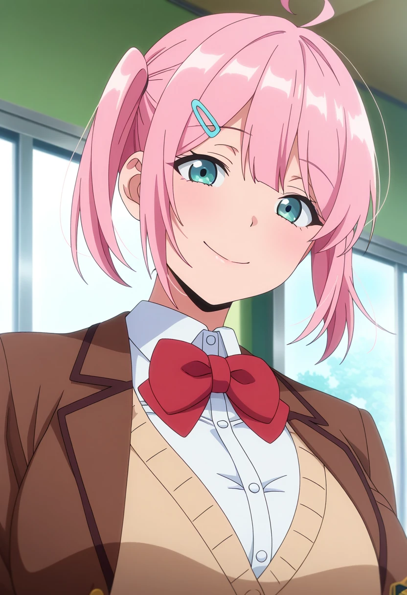 hanaww, mature female, curvy, aqua eyes, pink hair, medium hair, two side up, sidelocks, hairclip, ahoge, ?????????????,