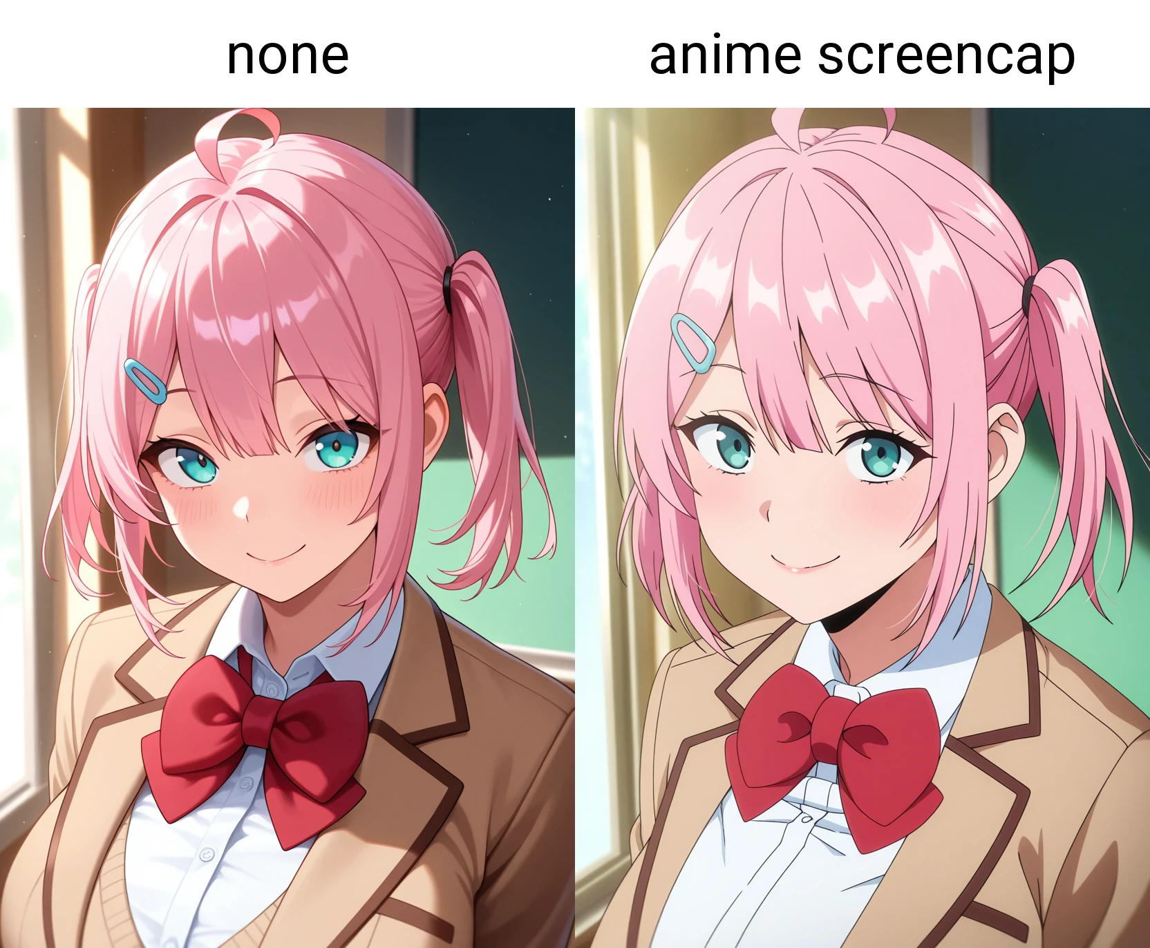 プロンプトに"anime screencap"を使った方が、アニメの雰囲気に近くなります。