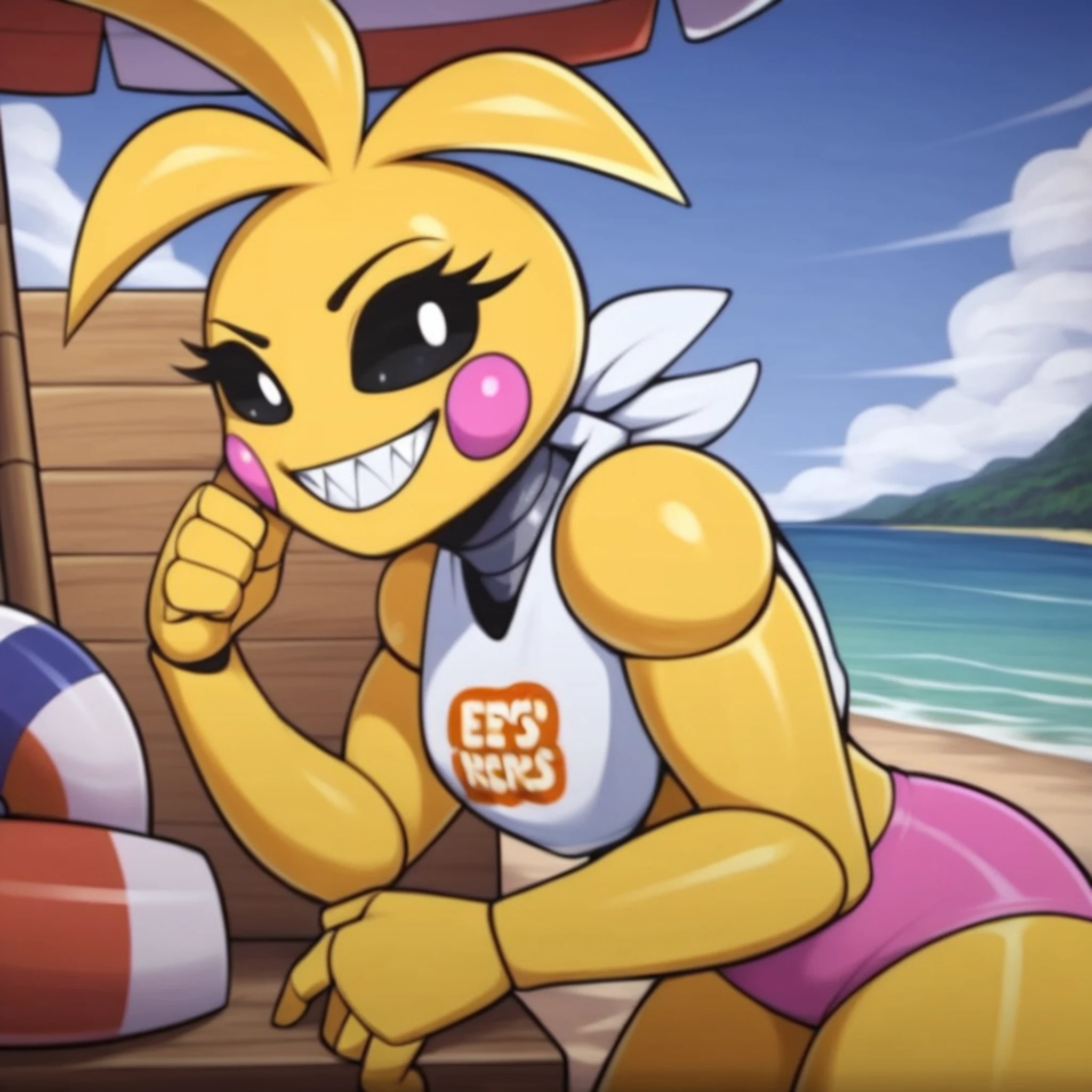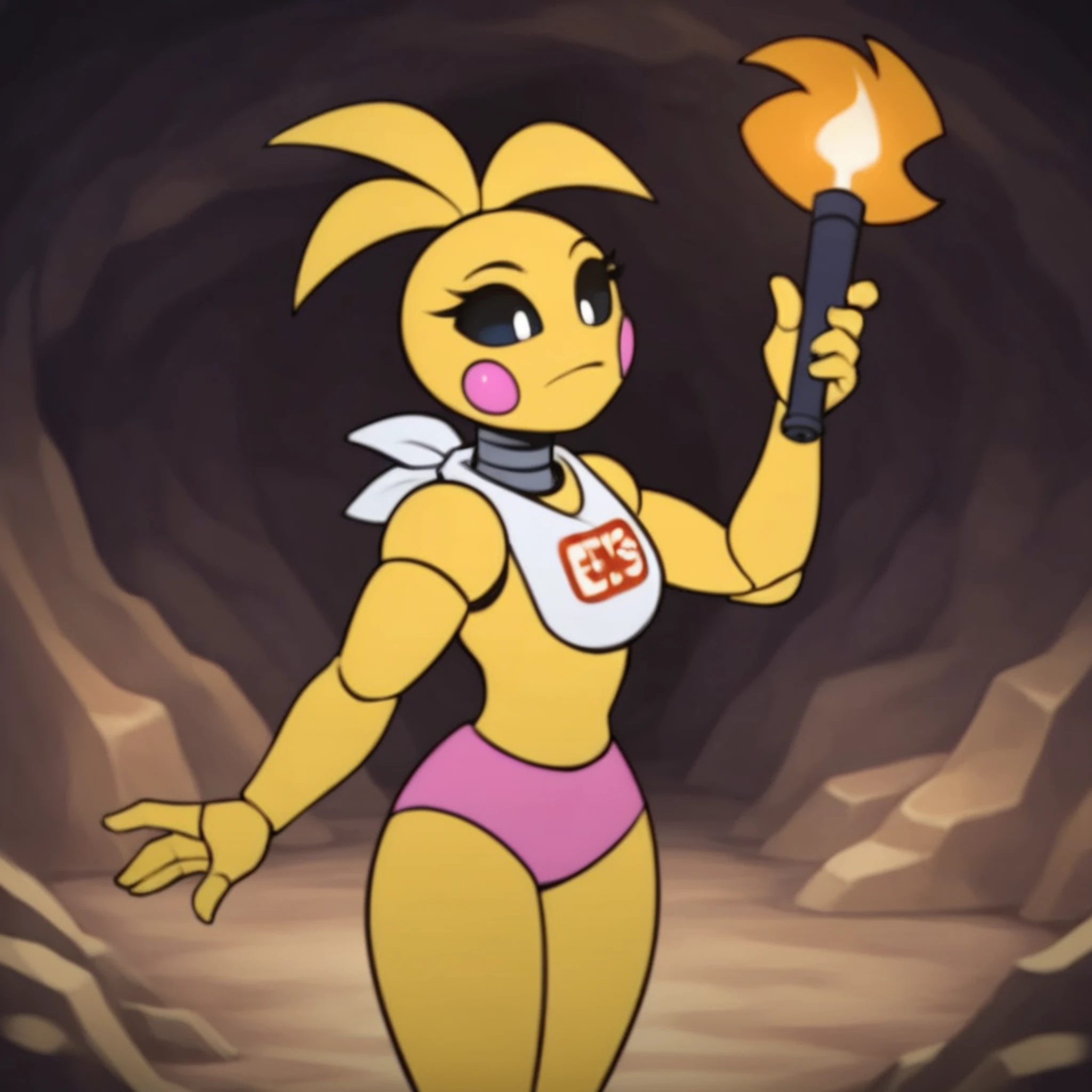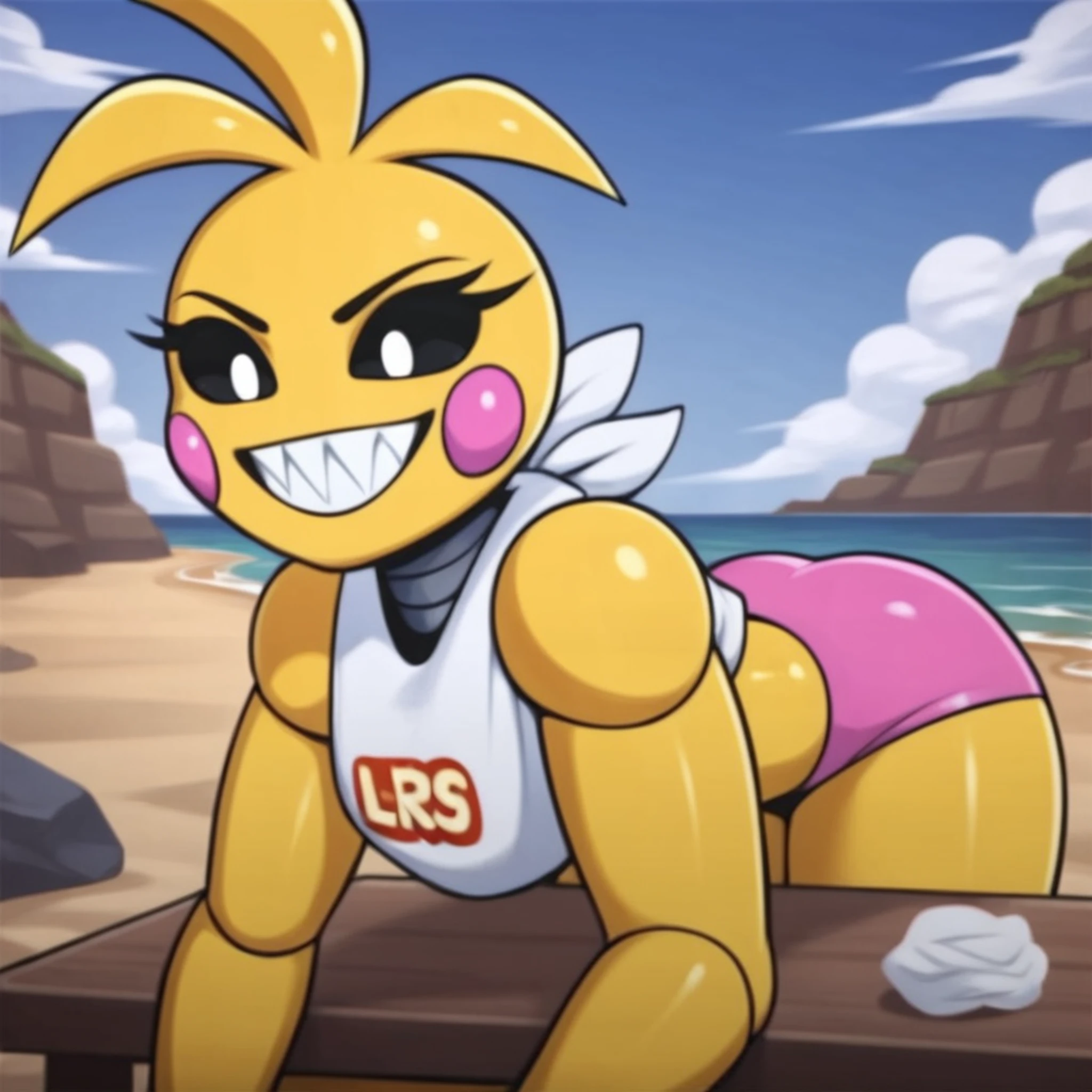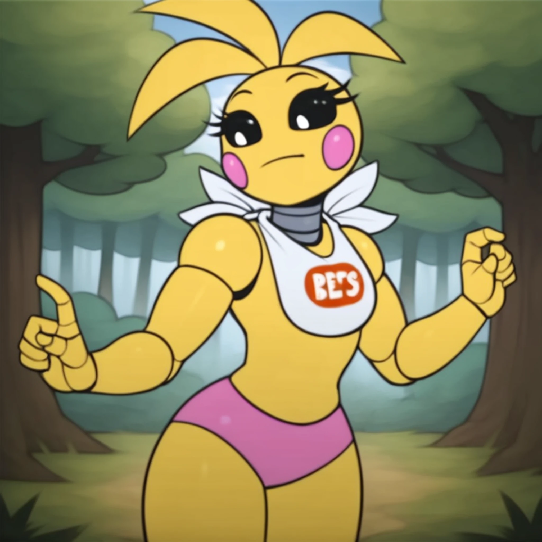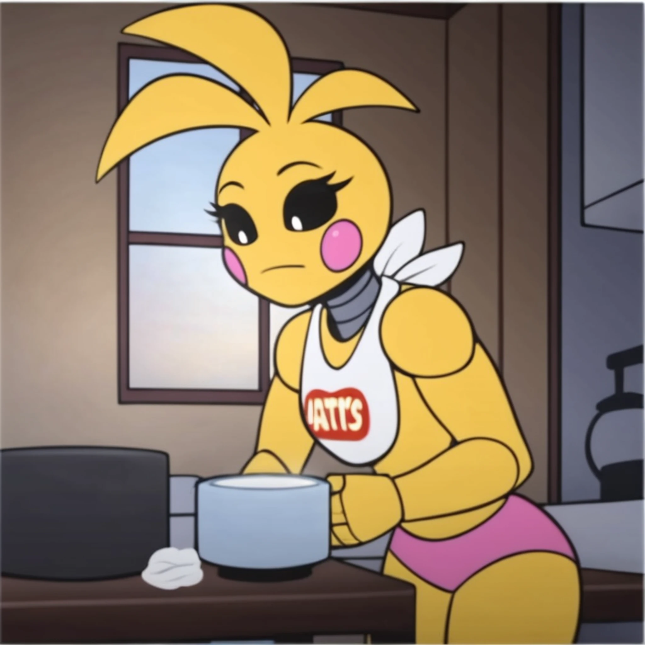 toy_chica, yellow skin, joints, robot, bib, makeup, crop top, pink panties