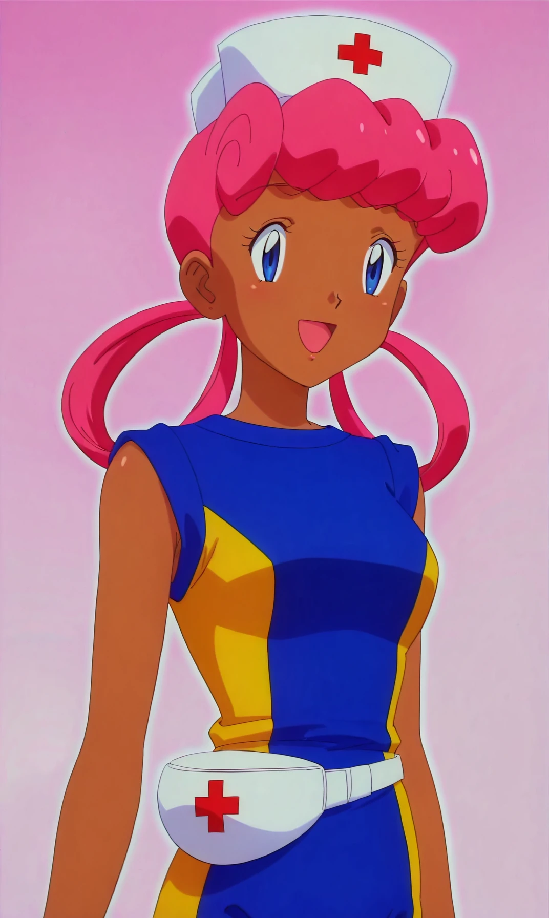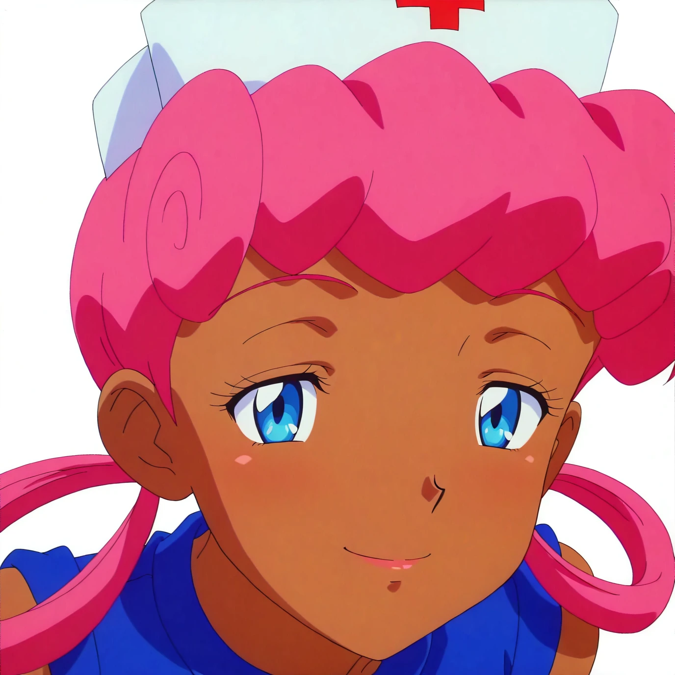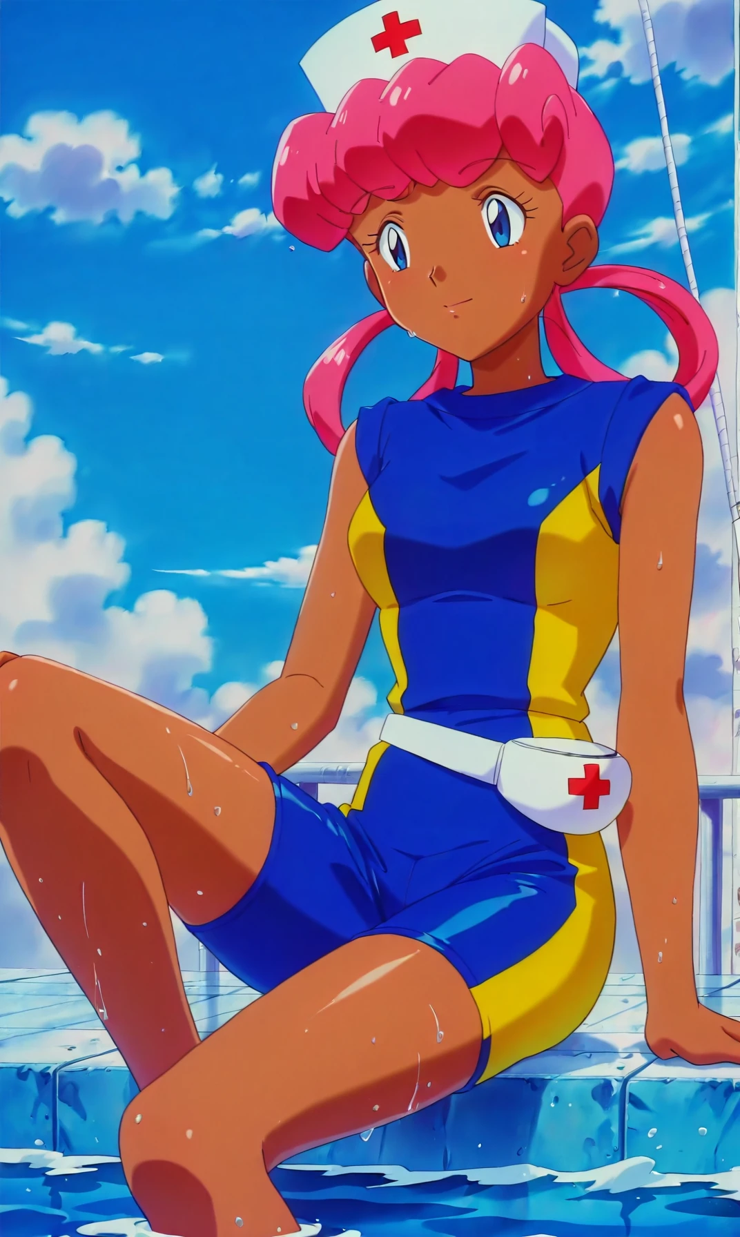 pkmnjoy, hair rings, dark skinned female, wetsuit, sleeveless, nurse cap, blue eyes, pink hair,
