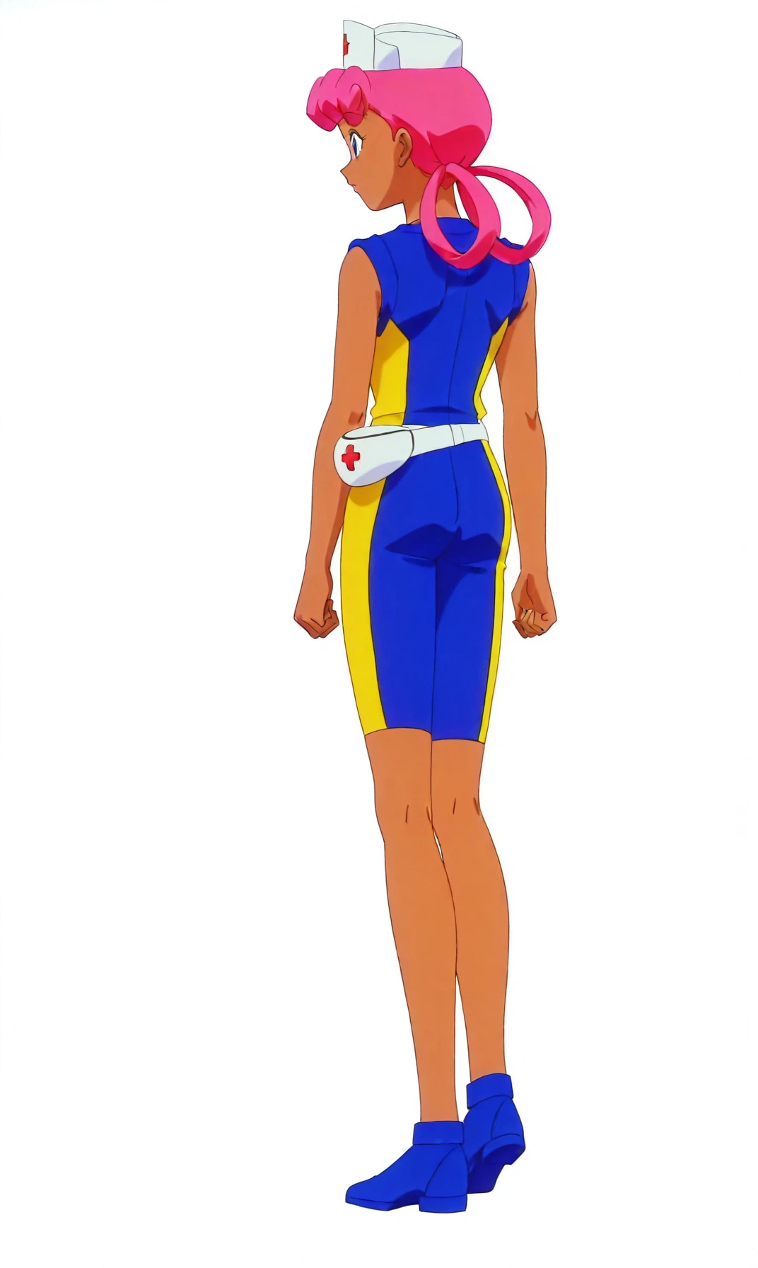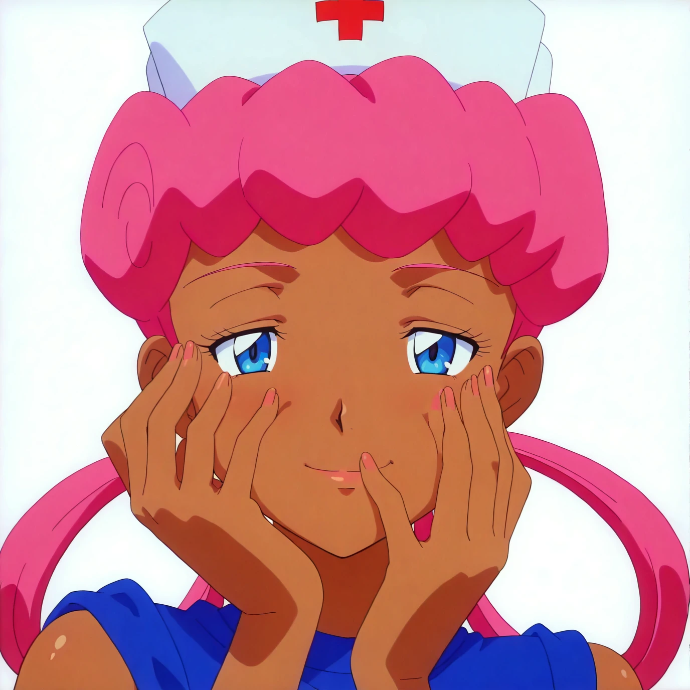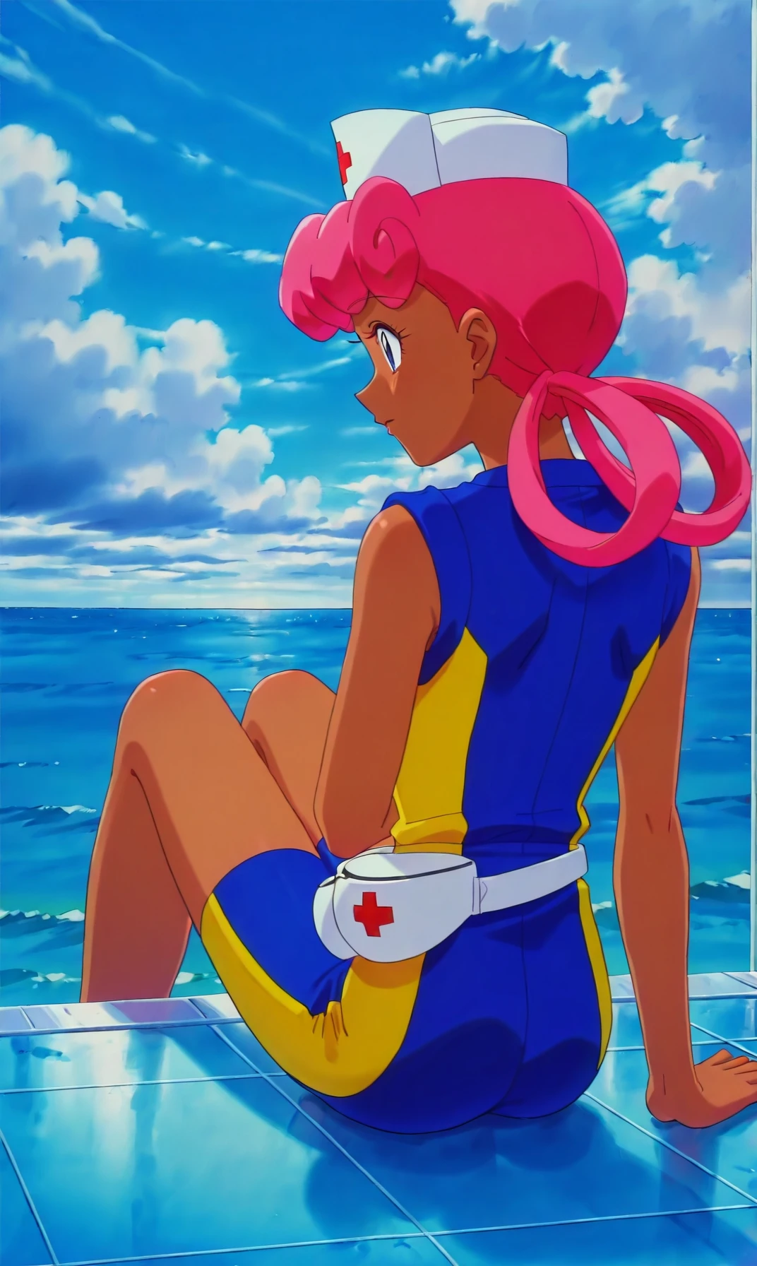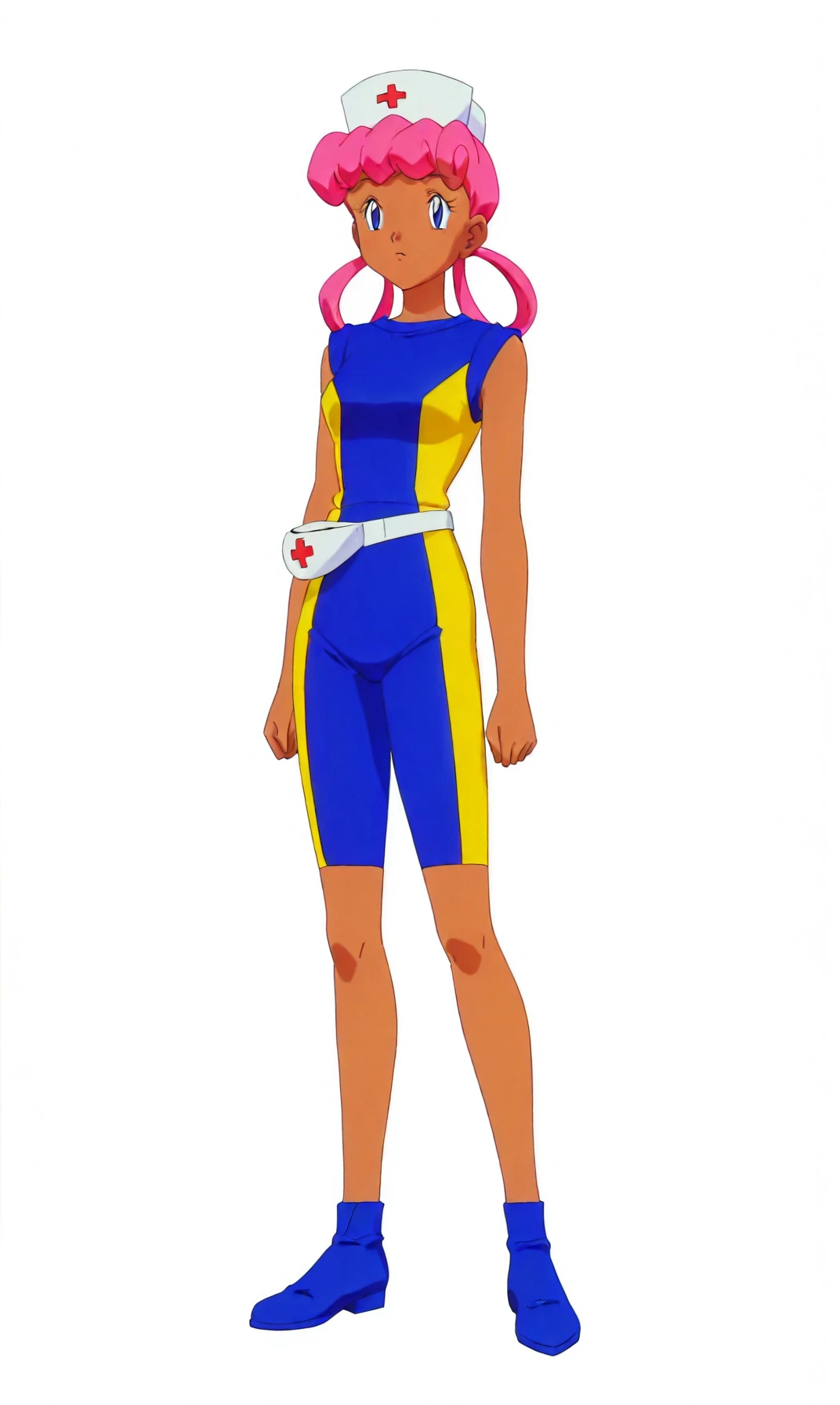 pkmnjoy, hair rings, dark skinned female, wetsuit, sleeveless, nurse cap, blue eyes, pink hair,