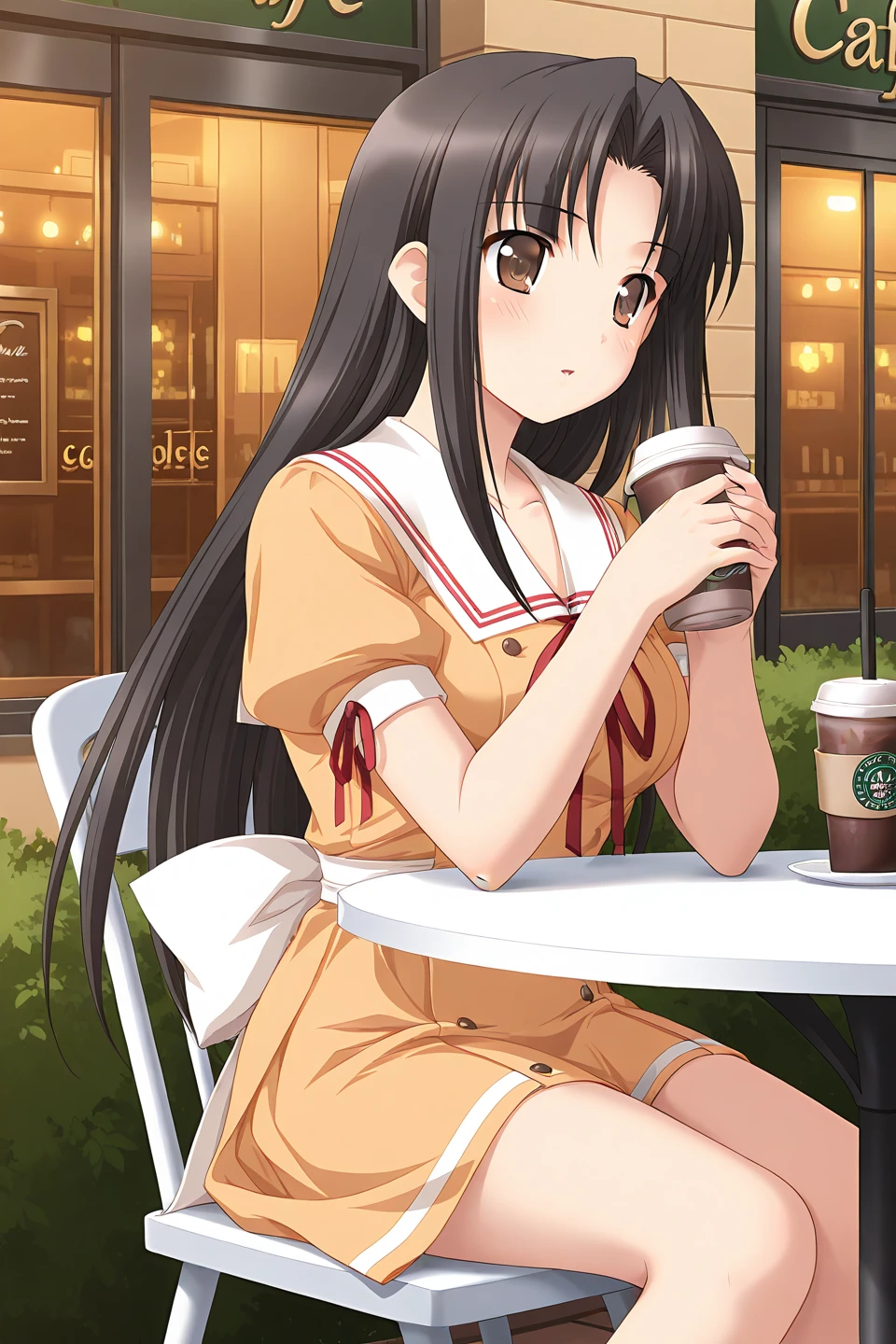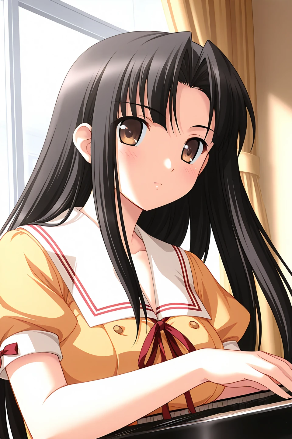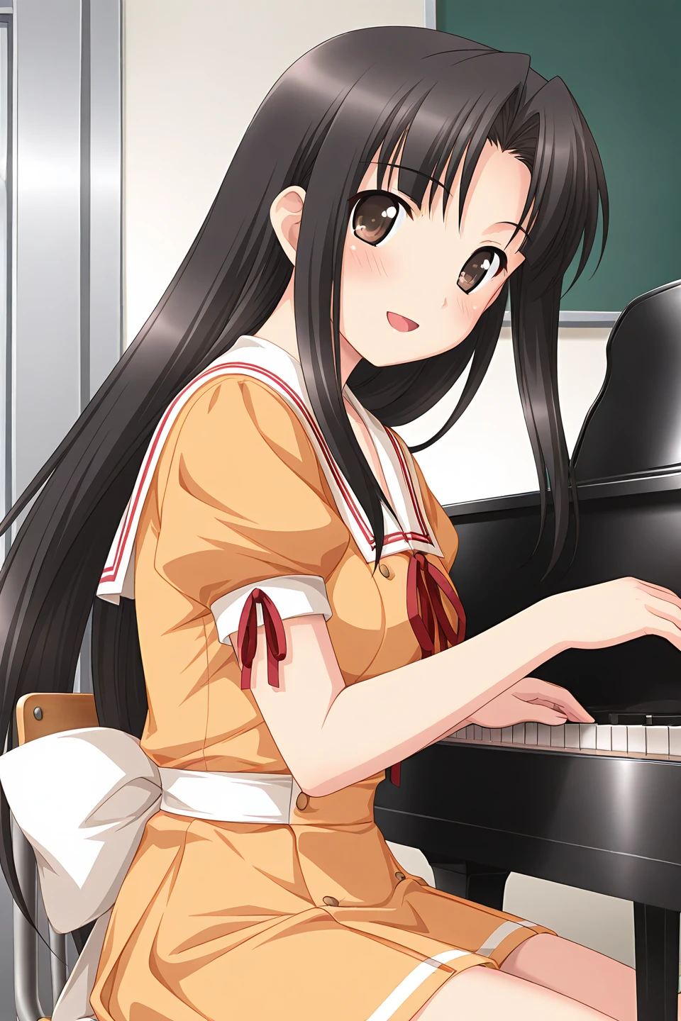 school uniform, serafuku, sailor dress, white sailor collar, neck ribbon, red ribbon, orange dress, short dress, puffy short sleeves, arm ribbon, white bow, back bow,