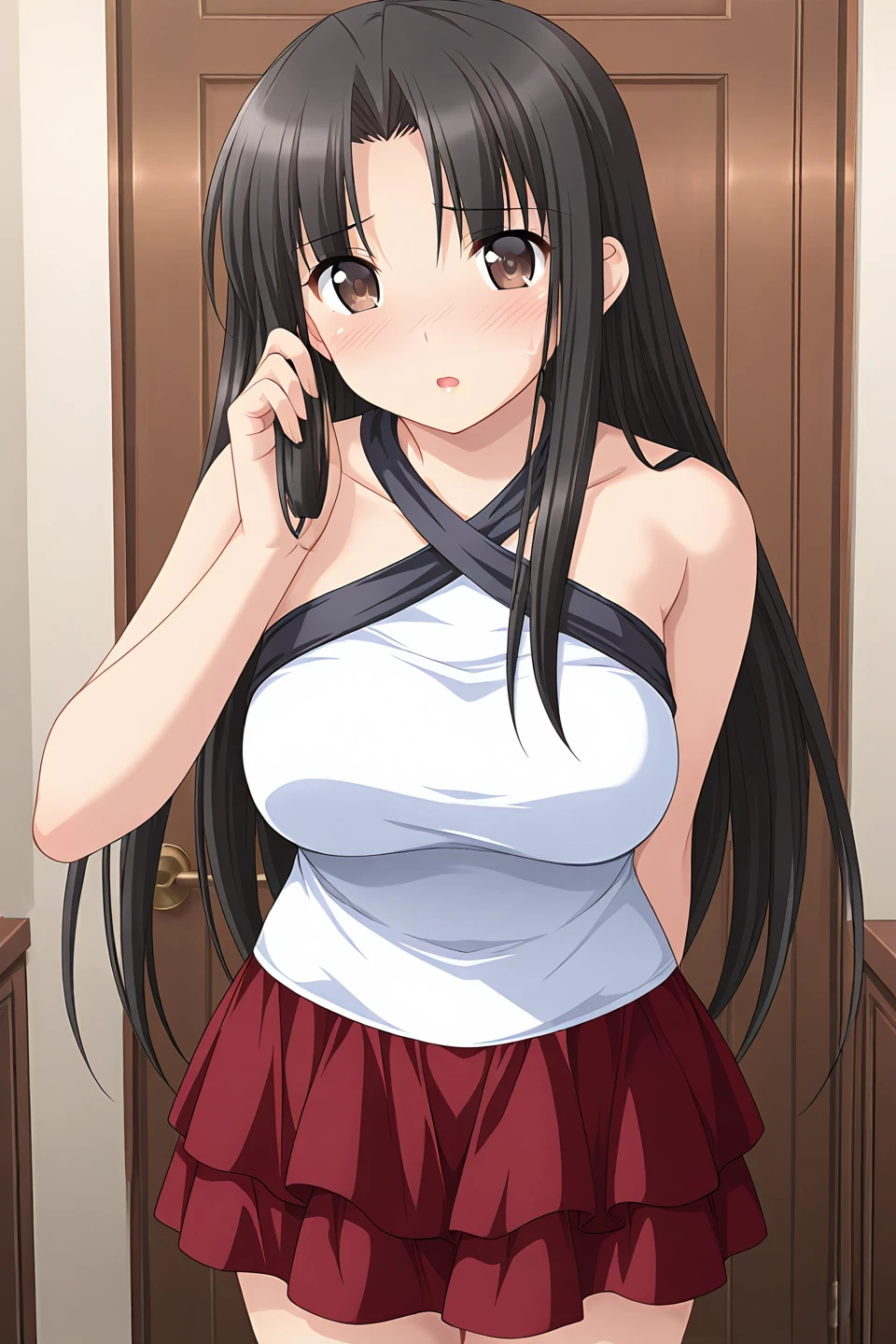 black halterneck, criss-cross halter, white dress, sleeveless dress, taut dress, underbust, red skirt, frilled skirt, layered skirt,