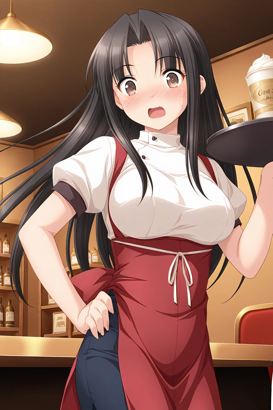 waitress, turtleneck, white shirt, blouse, taut shirt, underbust, buttons, puffy short sleeves, red apron, waist apron, white ribbon, waist ribbon, blue skirt, pencil skirt,