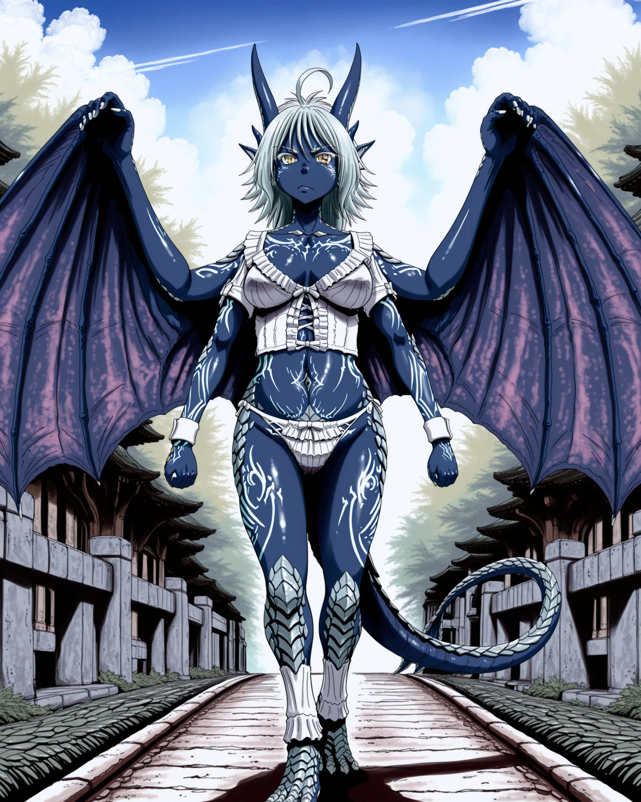 18) giselle horns wings tail slit pupils blue skin ahoge scales