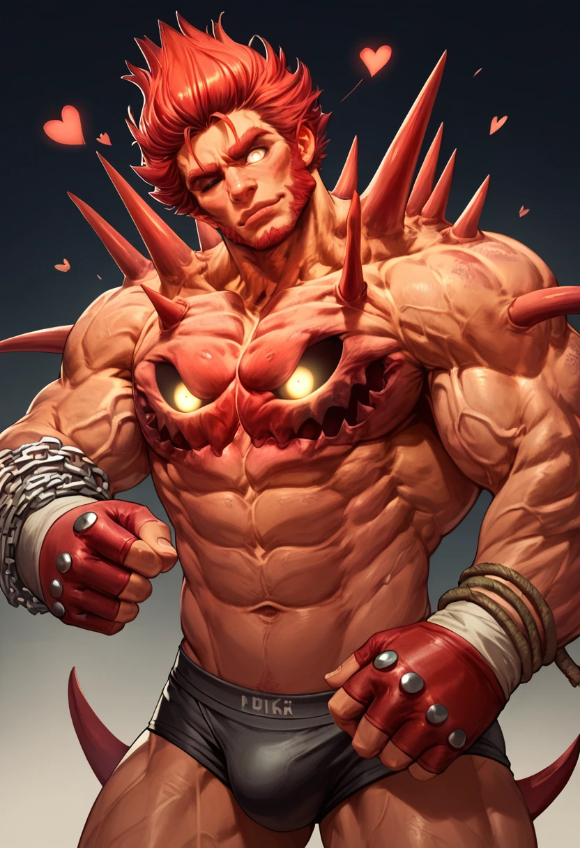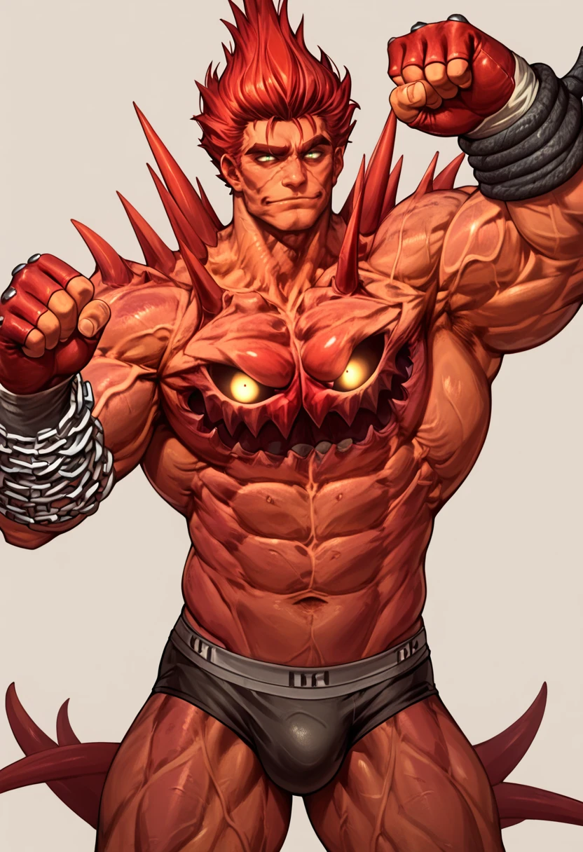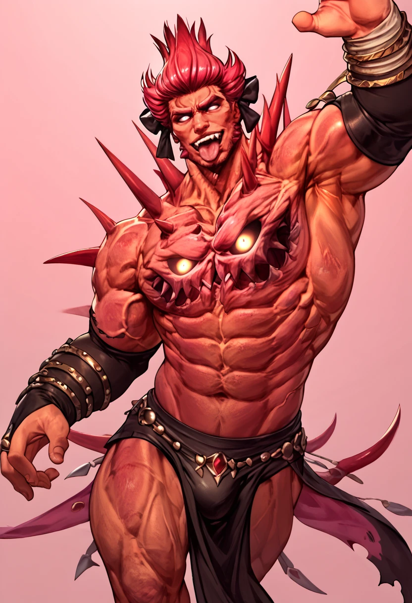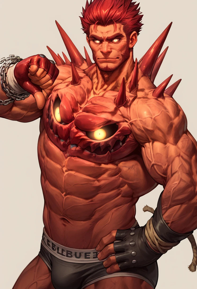 bb0m, thick eyebrows, spikes, red skin, veins, sideburns, glowing, chest face, white pupil