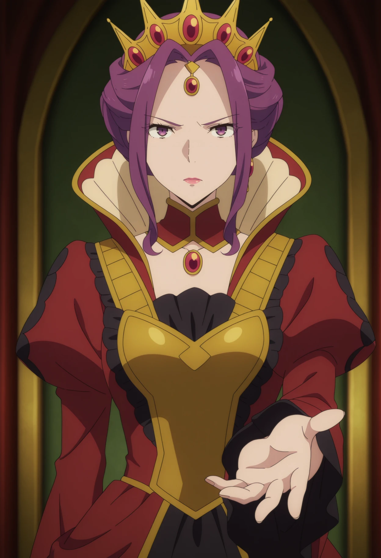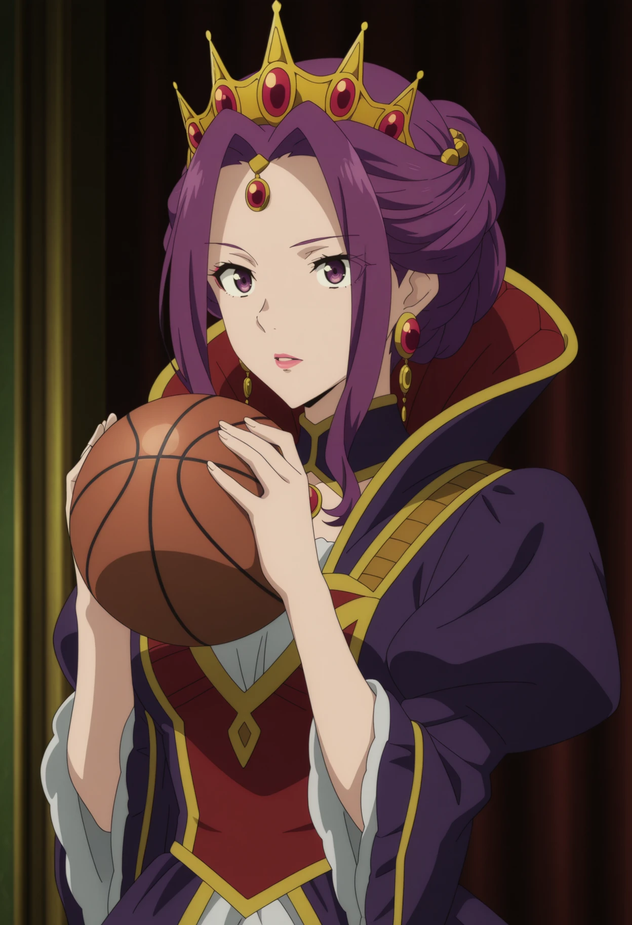 purple hair, purple eyes, jewelry, earrings, lipstick, crown, makeup,This lora is able to reproduce the Official outfit of the character, using the prompt: