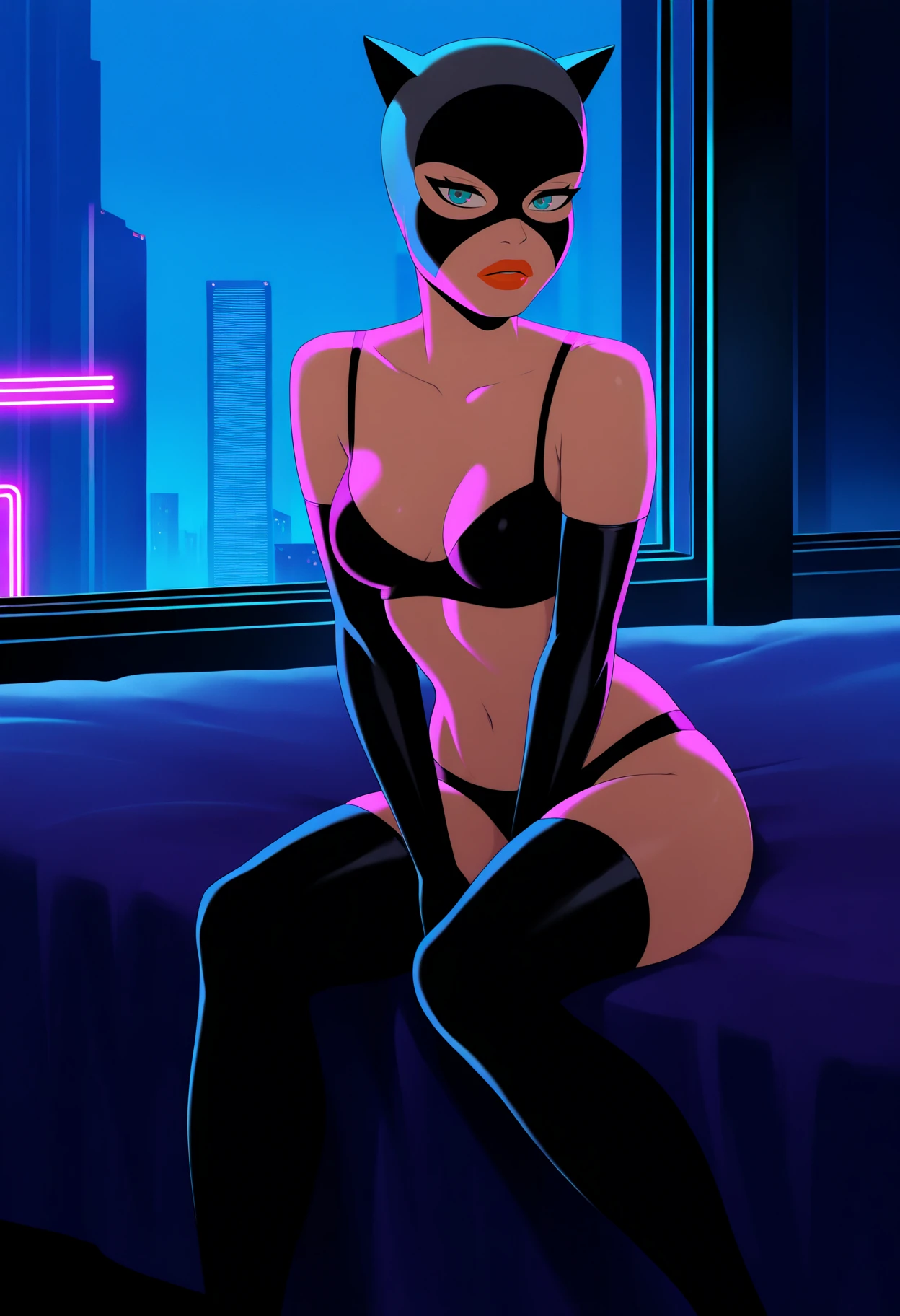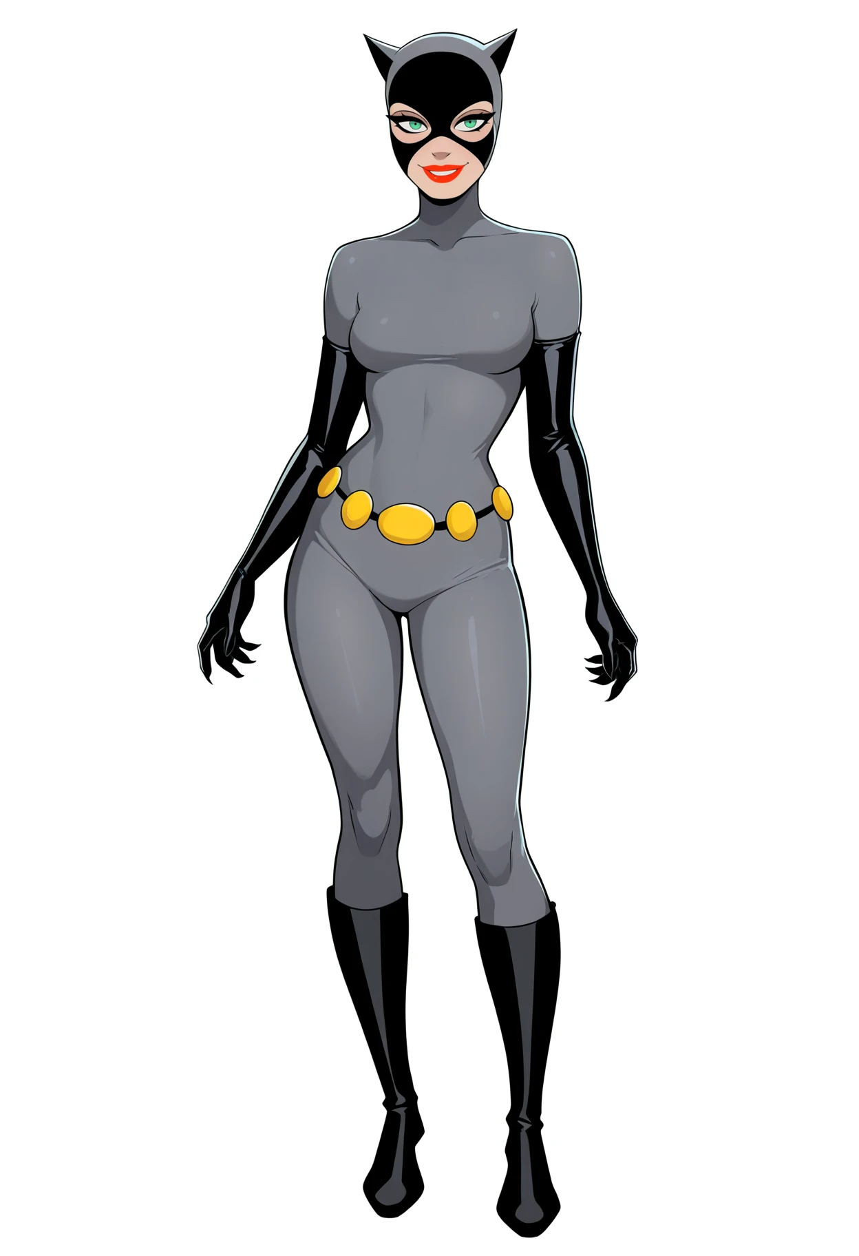 Basic prompts : 1girl, catwoman, green eyes, mask, lipstick, grey bodysuit, belt, black elbow gloves, boots