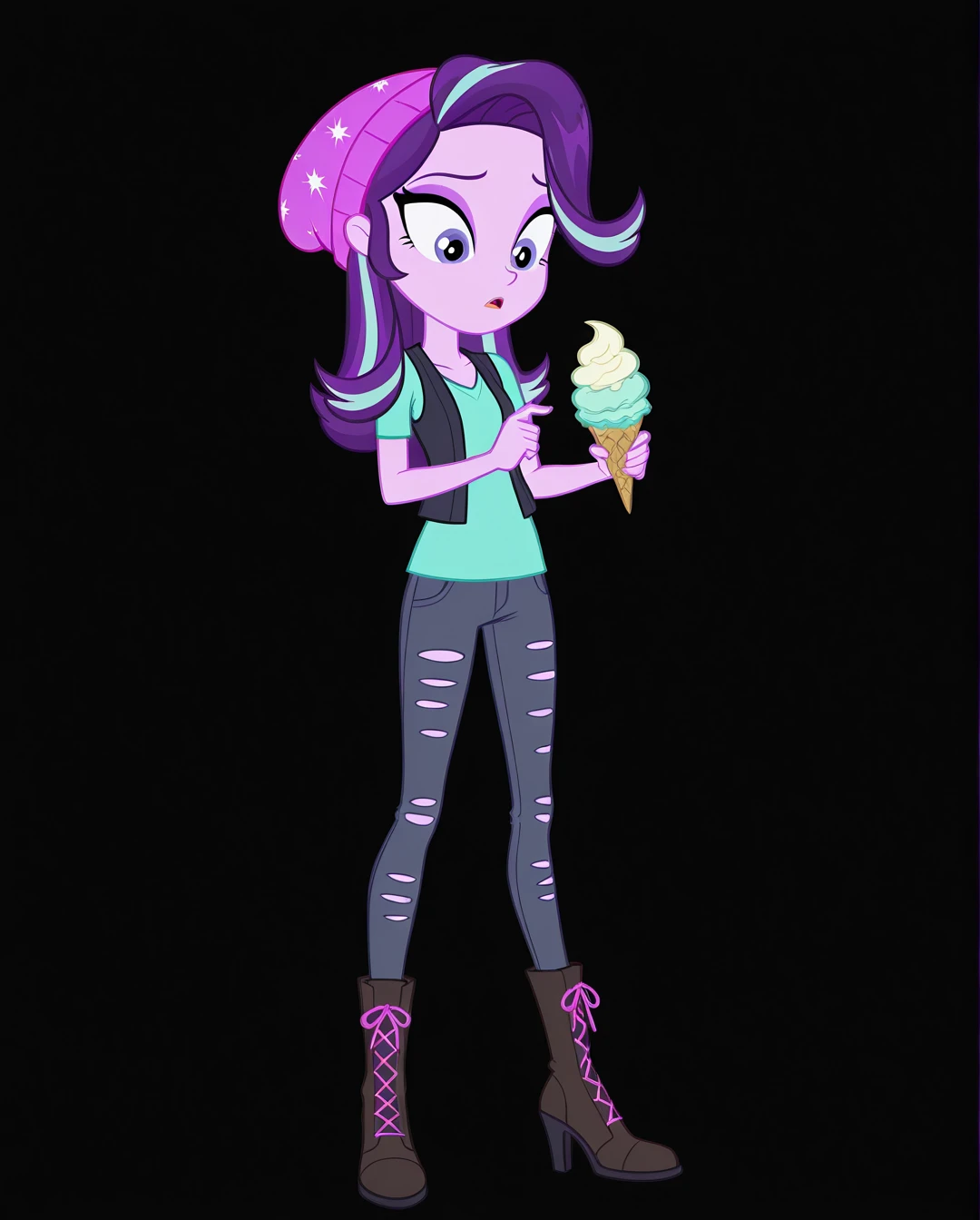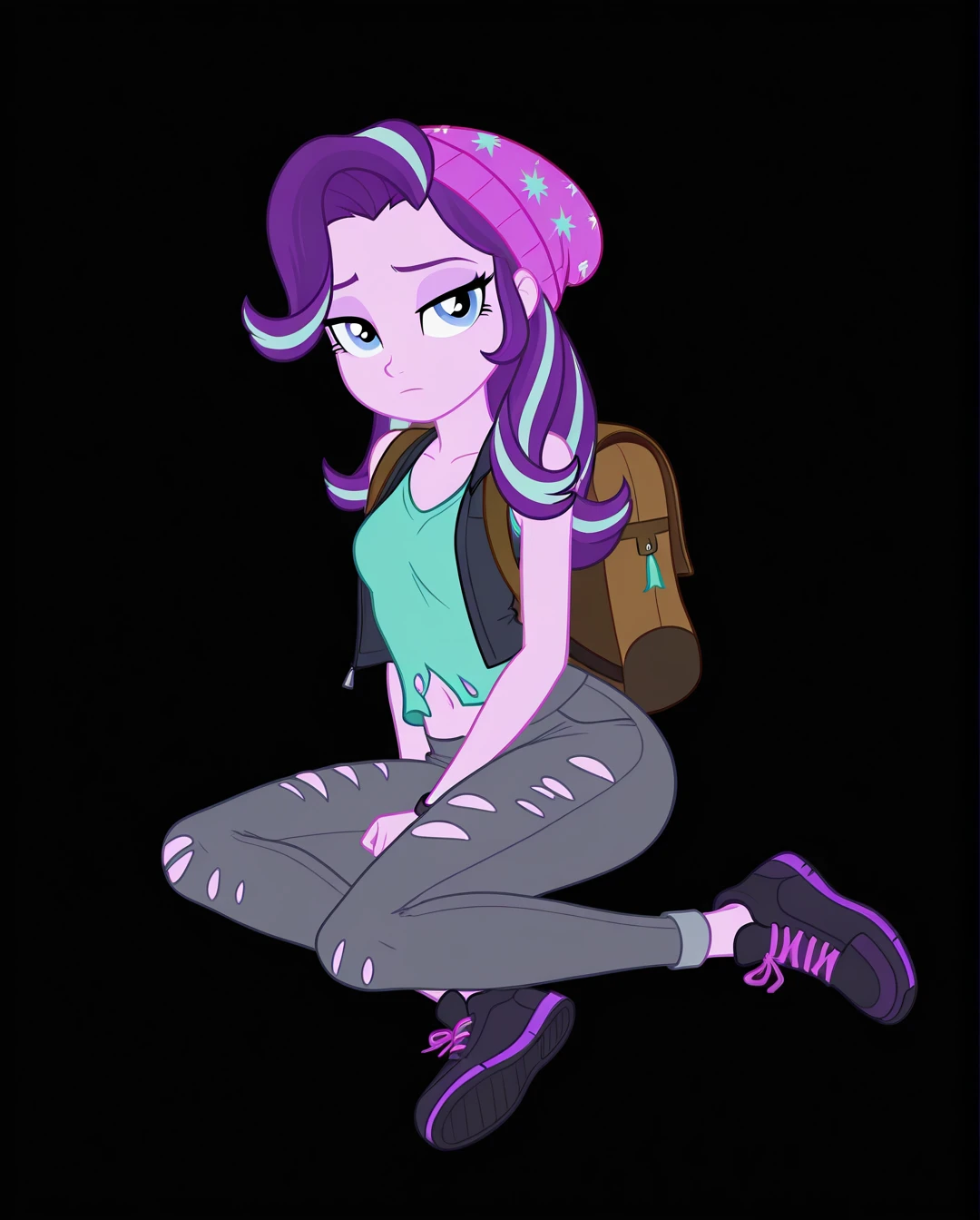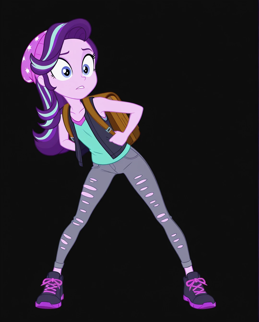 starlight_glimmer_(human), torn clothes, torn pants, bag, shoes, open vest, purple hair, grey pants, sleeveless shirt, long hair, colored skin, black footwear, backpack, purple footwear, torn shirt,