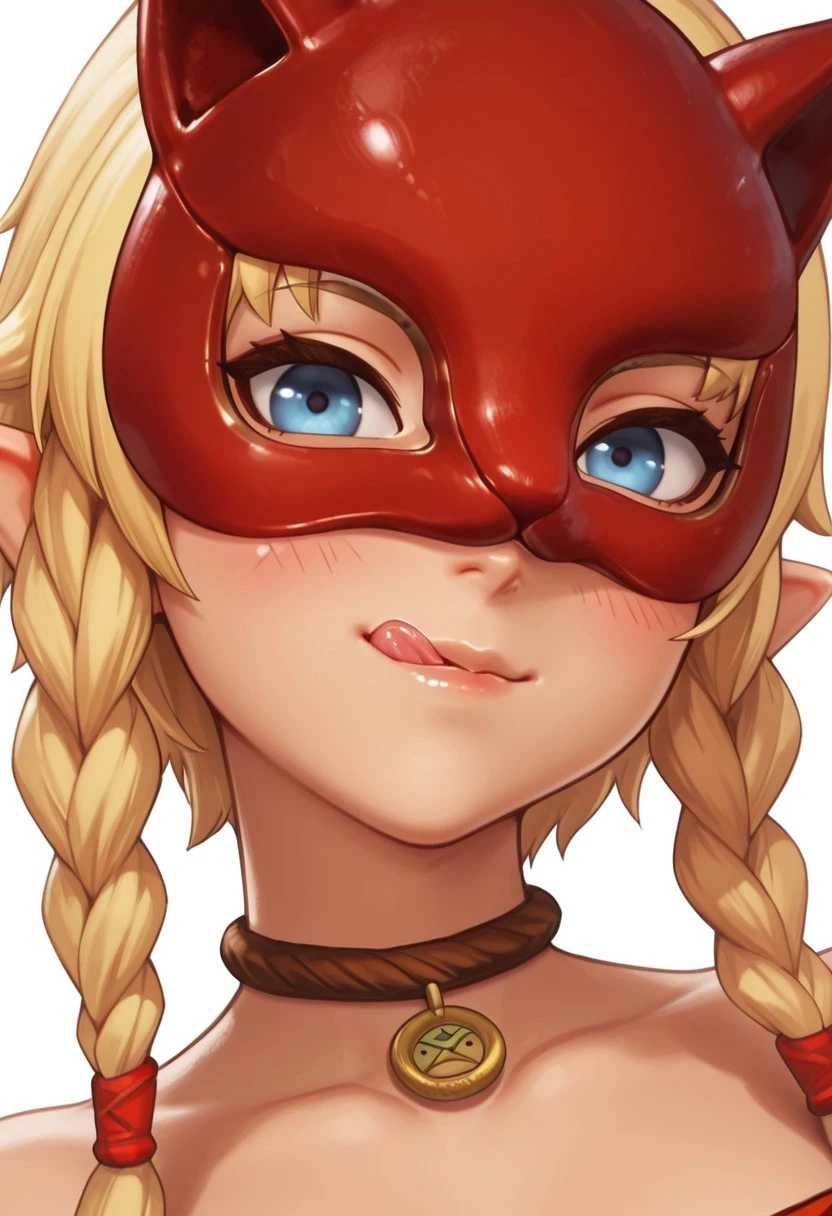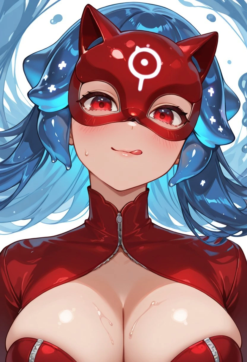 Panther_Cosplay, red , cleavage cutout, full-length zipper, pink gloves, red thigh boots, tail, shiny clothes, skin tight,