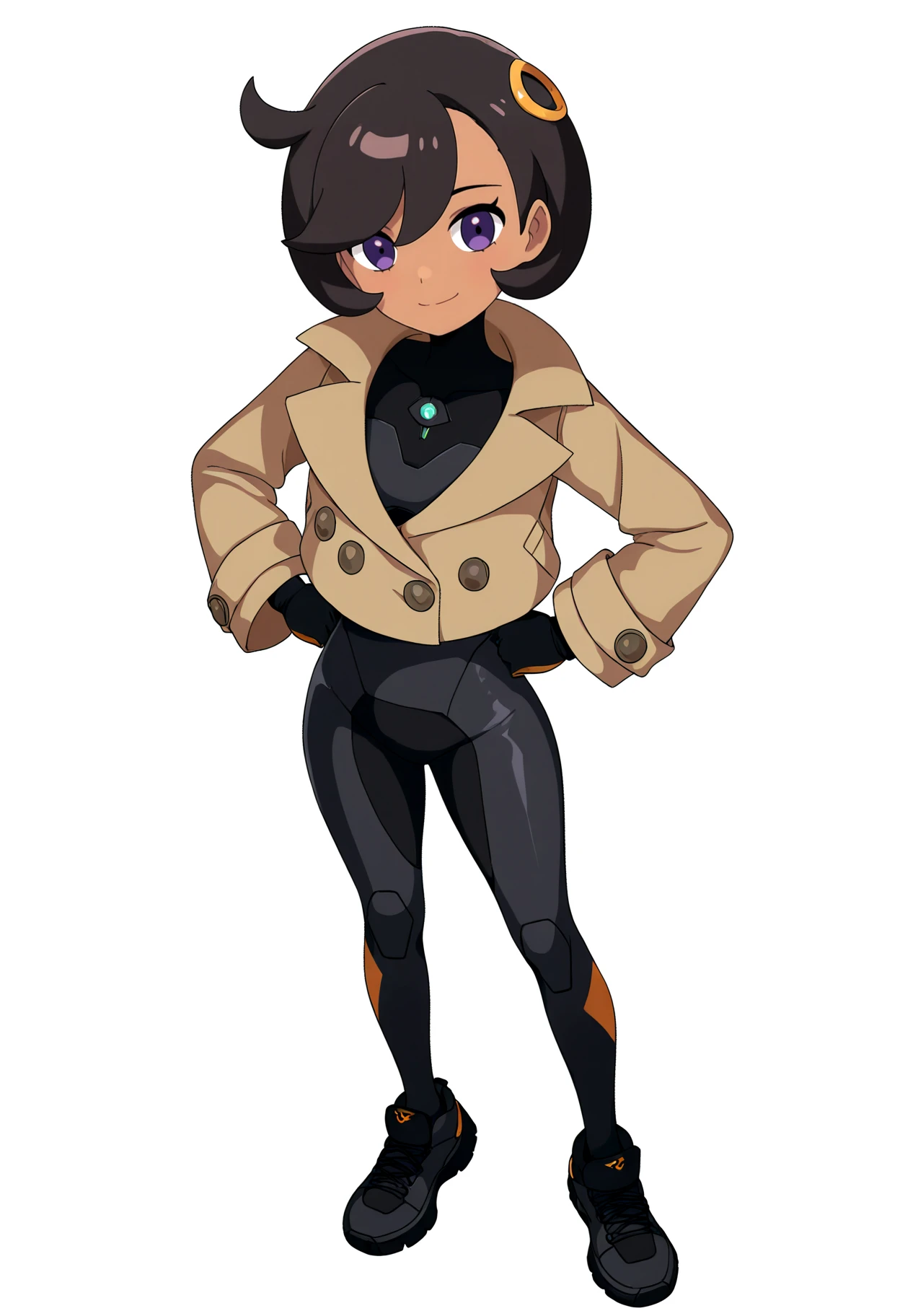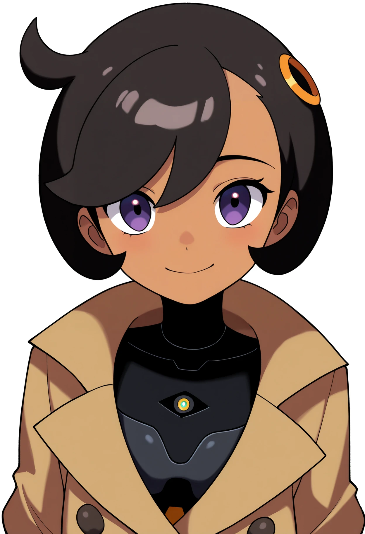1girl, emma, black hair, short hair, hair ornament, purple eyes, dark skin