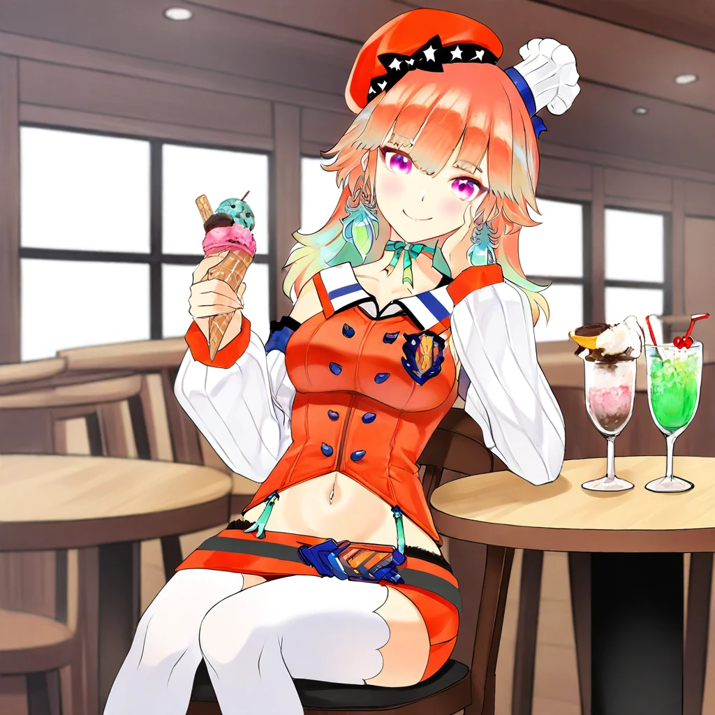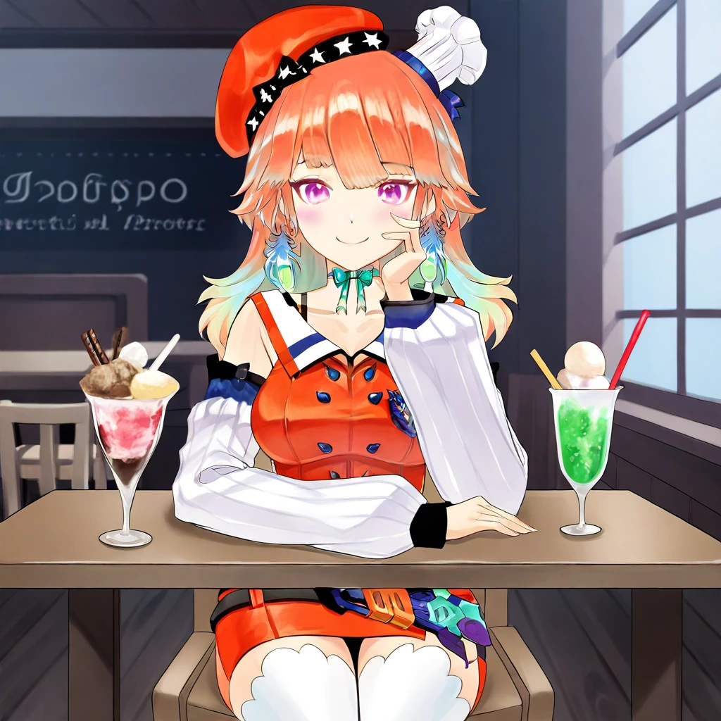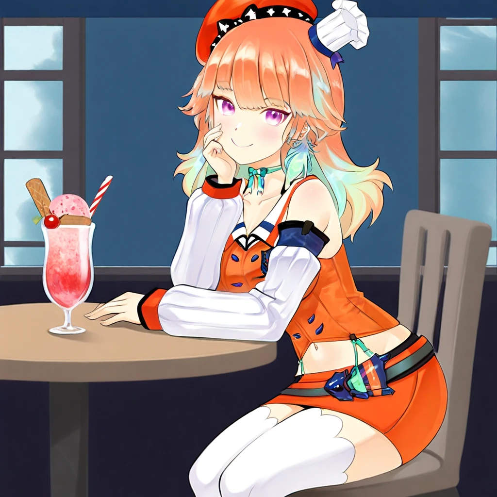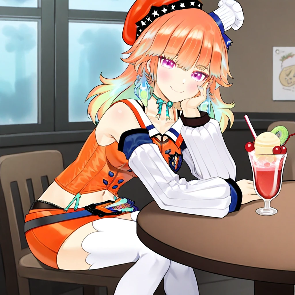 TKiara, Long Hair, Hair ornament, virtual youtuber, choker, T4kanashiK1ara, purple eyes, multicolored hair, orange hair, green hair, long hair, feather earrings, orange beret, mini chef hat, ribbon choker, orange vest, detached sleeves, white sleeves, midriff, orange miniskirt, belt, white thighhighs, Smile at viewer, Choker, 1girl, solo, lazypos, anime-style, anime screenshot,