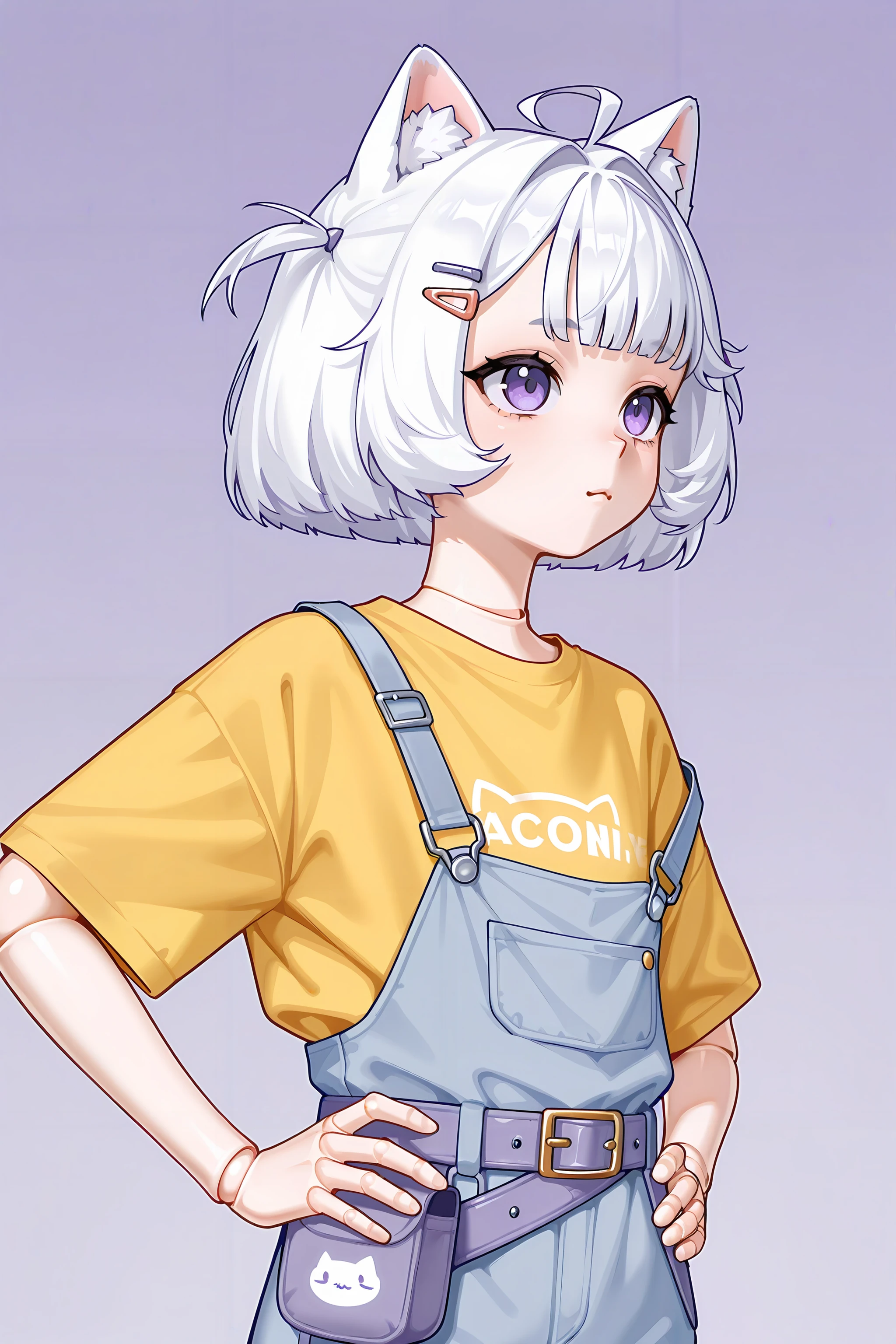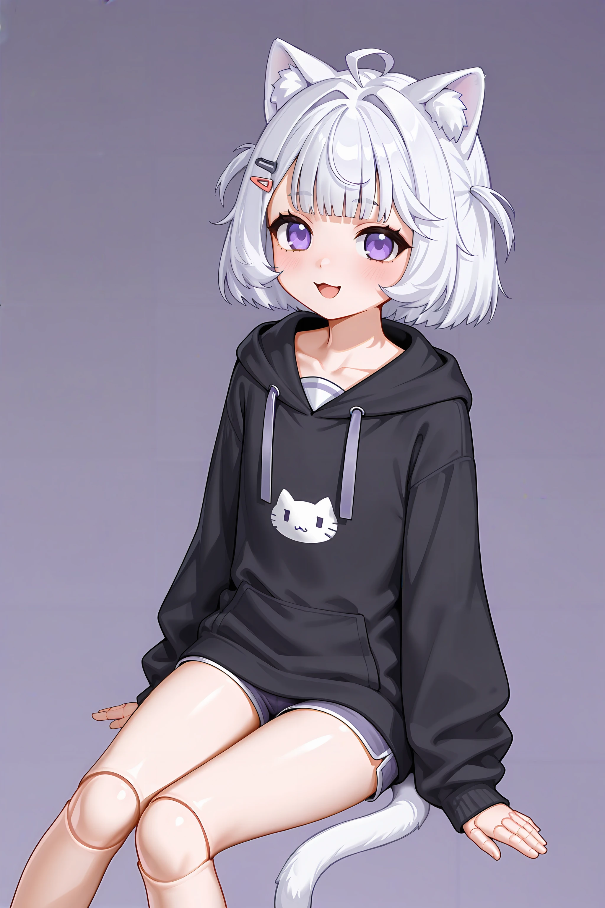 1girl,bangs,purple eyes,short hair,cat ears,ahoge,hairclip,white hair,cat tail,joints,