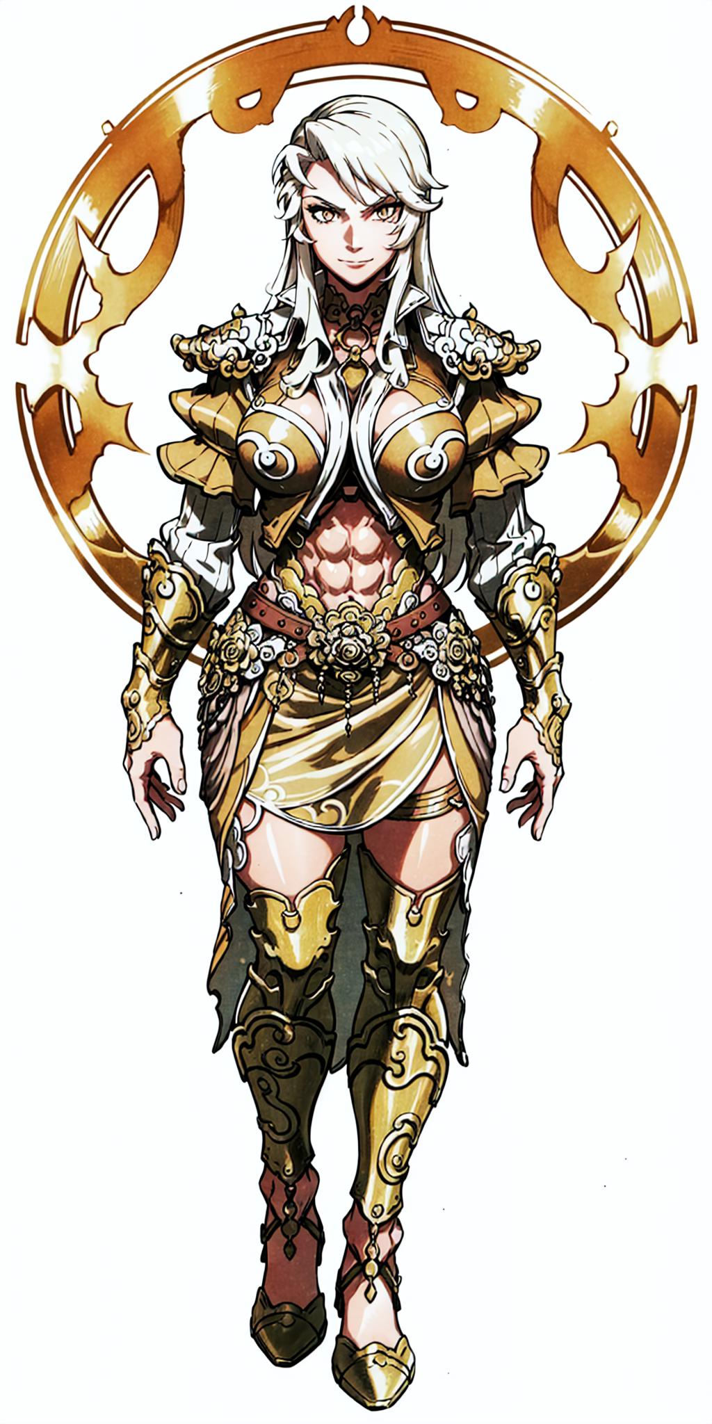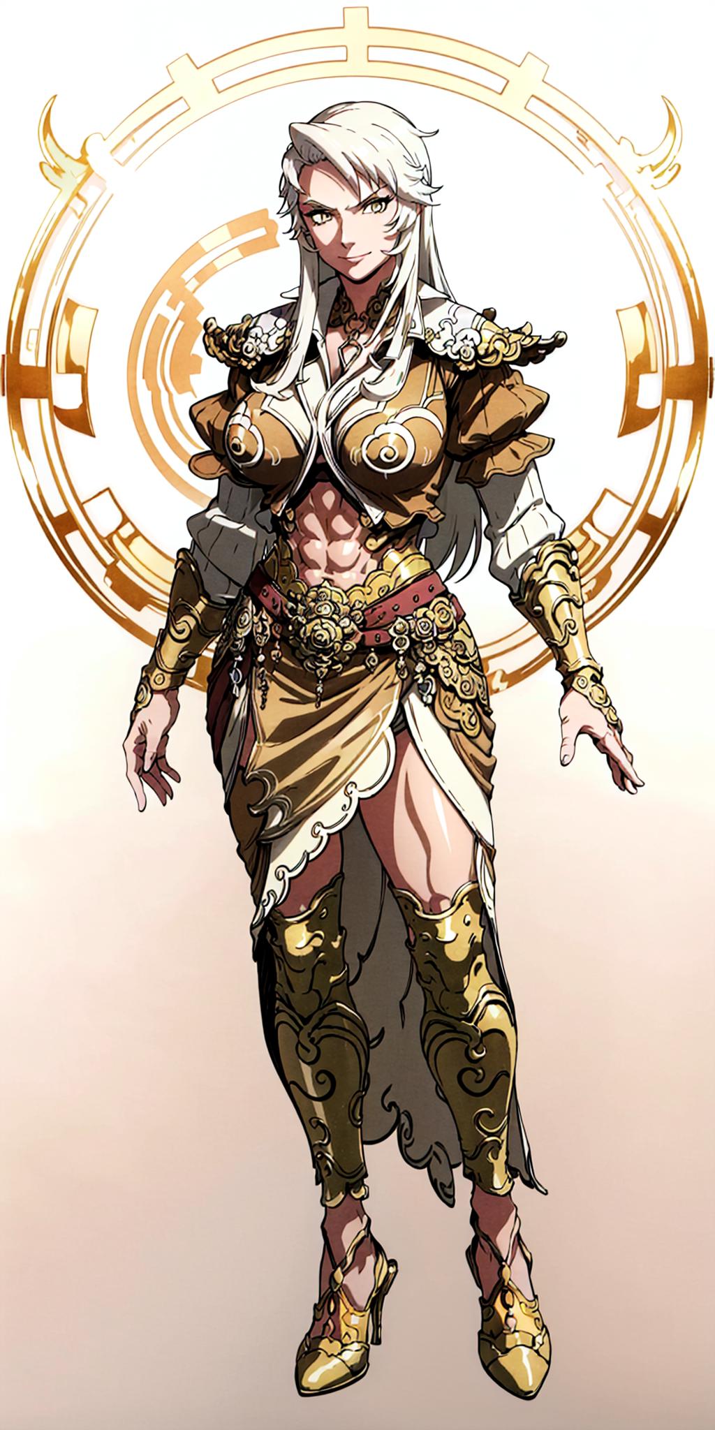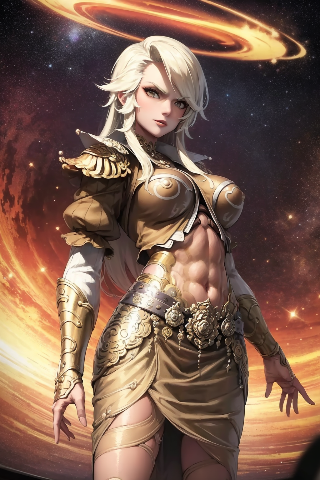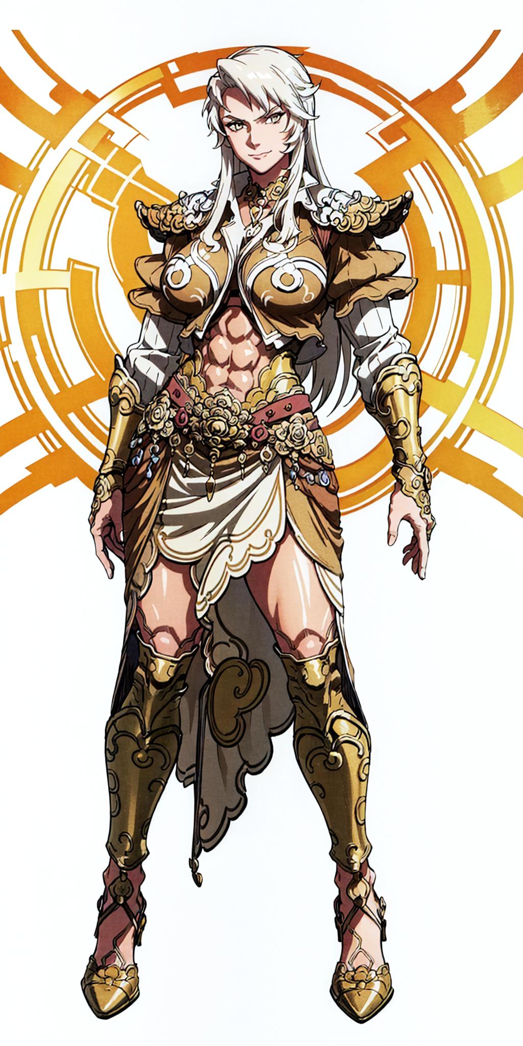 Other prompts : long hair, white hair, armor, navel, midriff