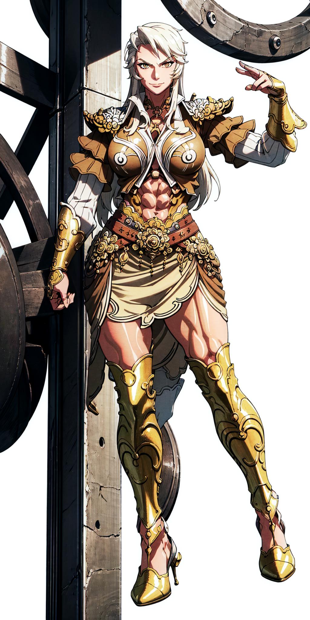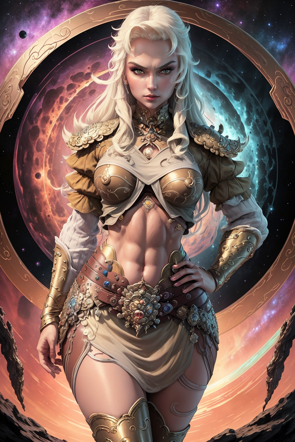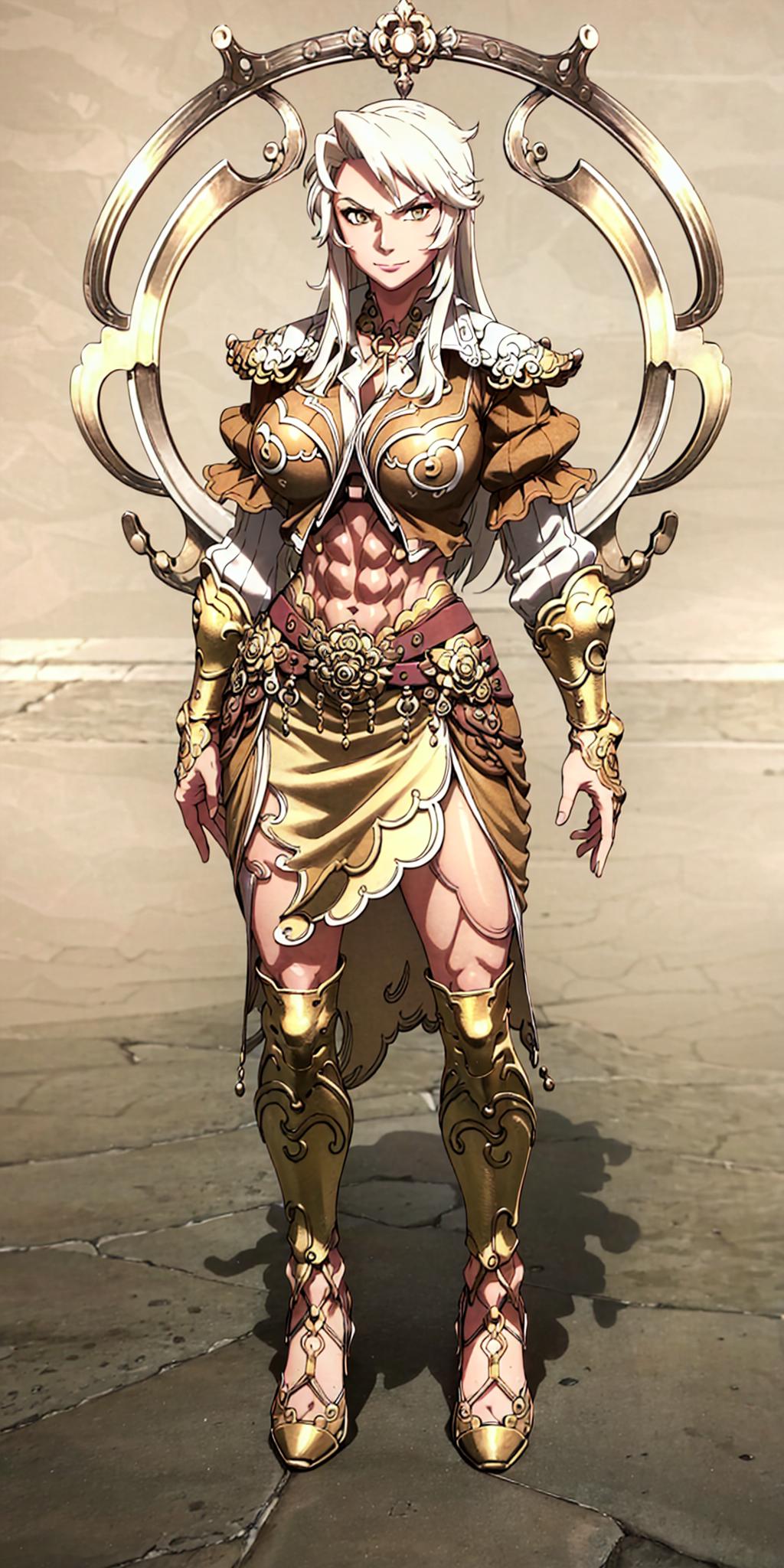 Other prompts : long hair, white hair, armor, navel, midriff