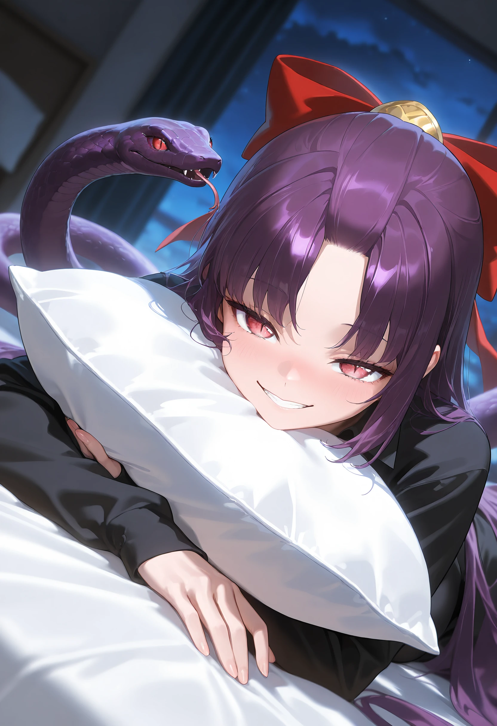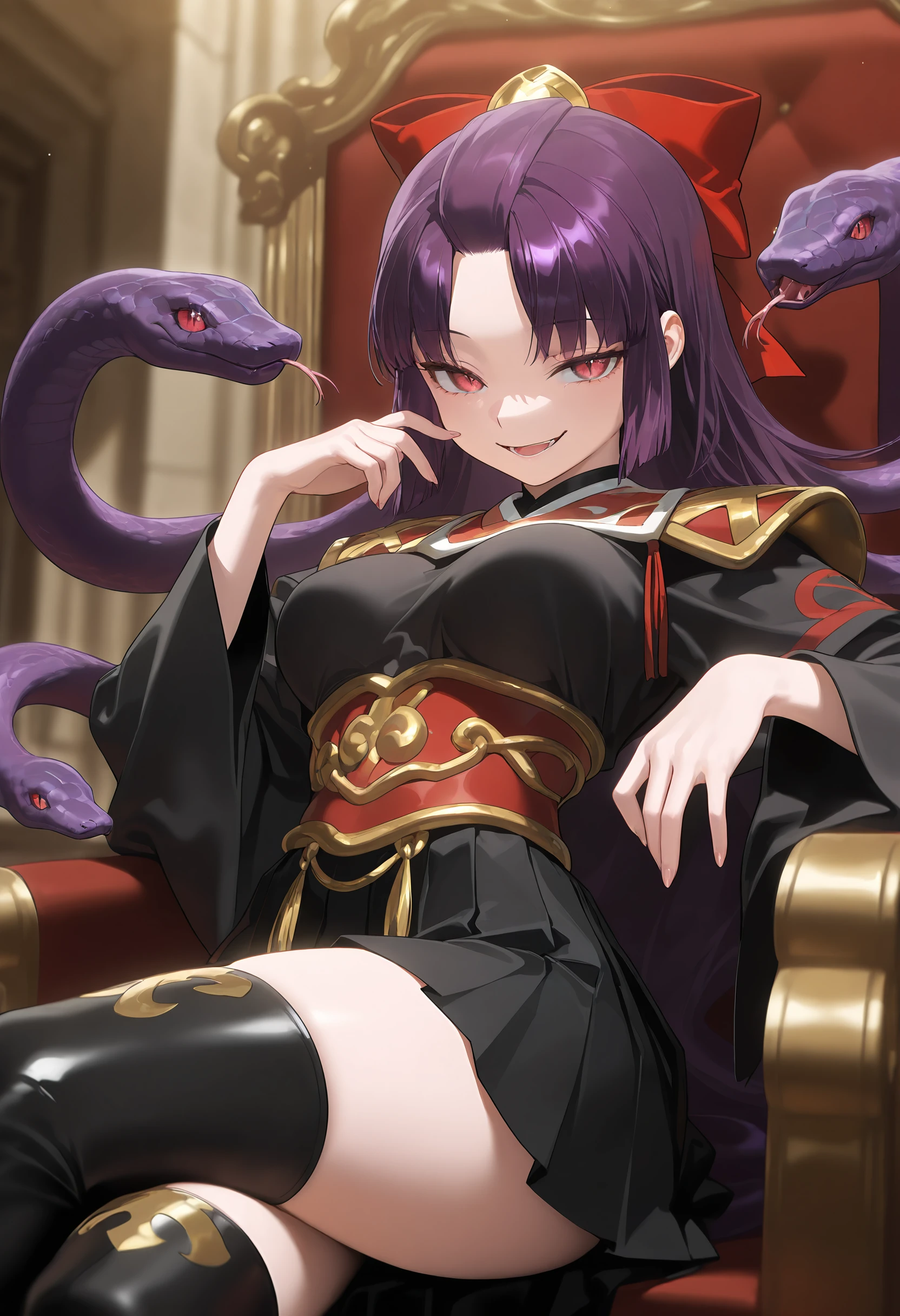 Tags for her look: 1girl, solo, medium breasts, very long hair, red eyes, purple hair, hair bow, red bow, parted bangs, slit pupils, monster girl, sidelocks, snake hair, forked tongue, hair ornament, tongue tattoo,