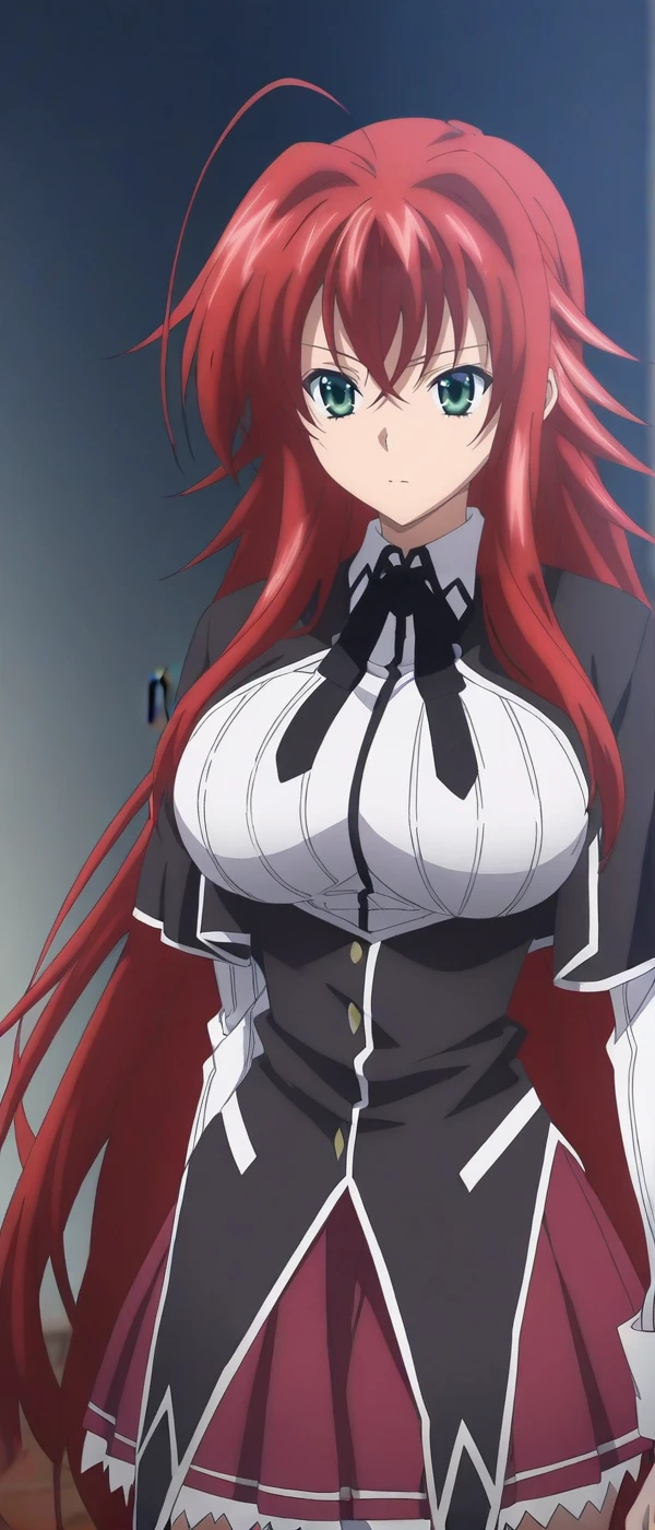 1girl, solo, long hair, red hair, ahoge, green eyes, large breasts
