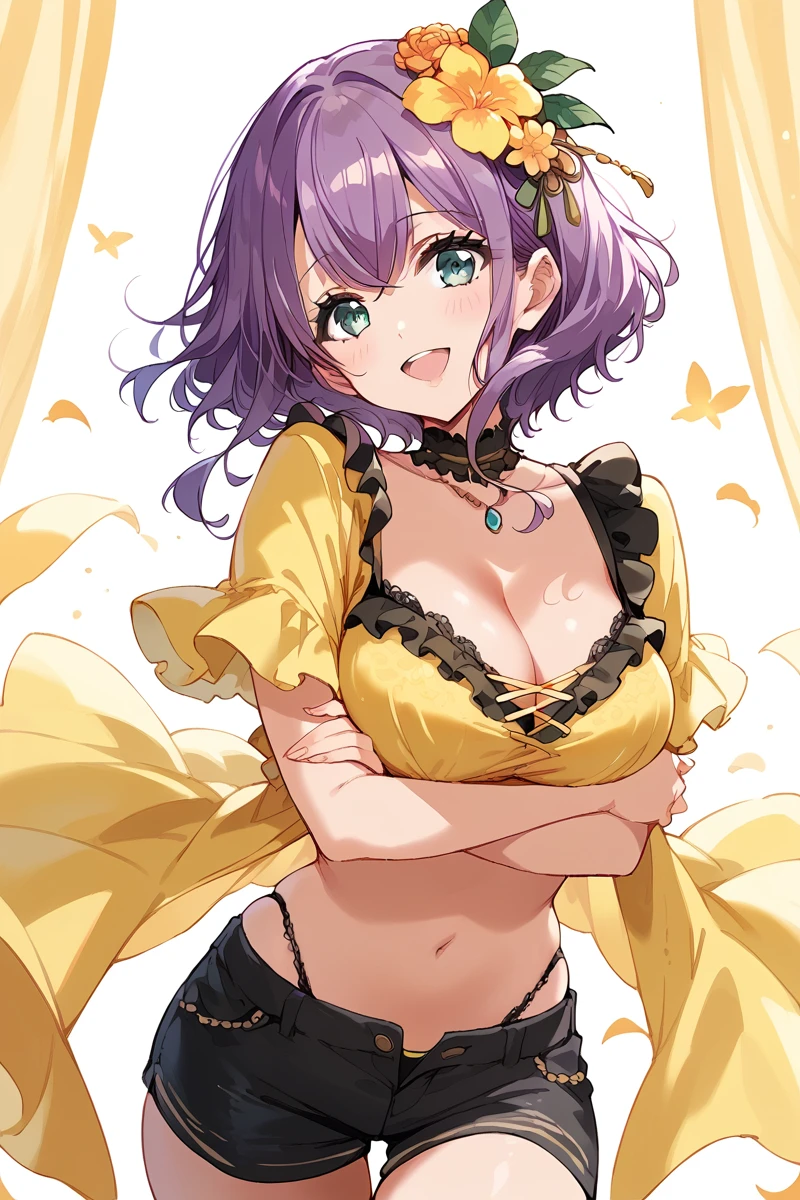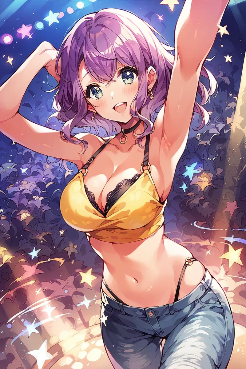 Use Saori and 1girl. For a variety of clothes, take as an example prompts from sample images. Purple hair (sometimes hair flower, short hair) for hairstyle. Everything works well. Hentai too.