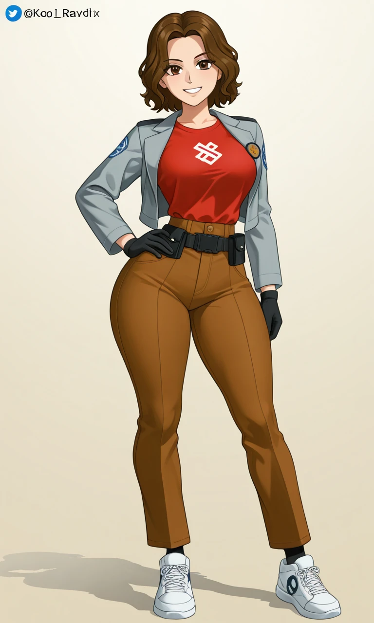 Outfit 1: blue and grey jacket, red and grey t-shirt, brown pants with multiple pockets, black fingerless gloves, black and white sneakers.