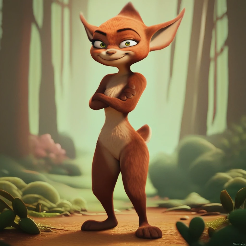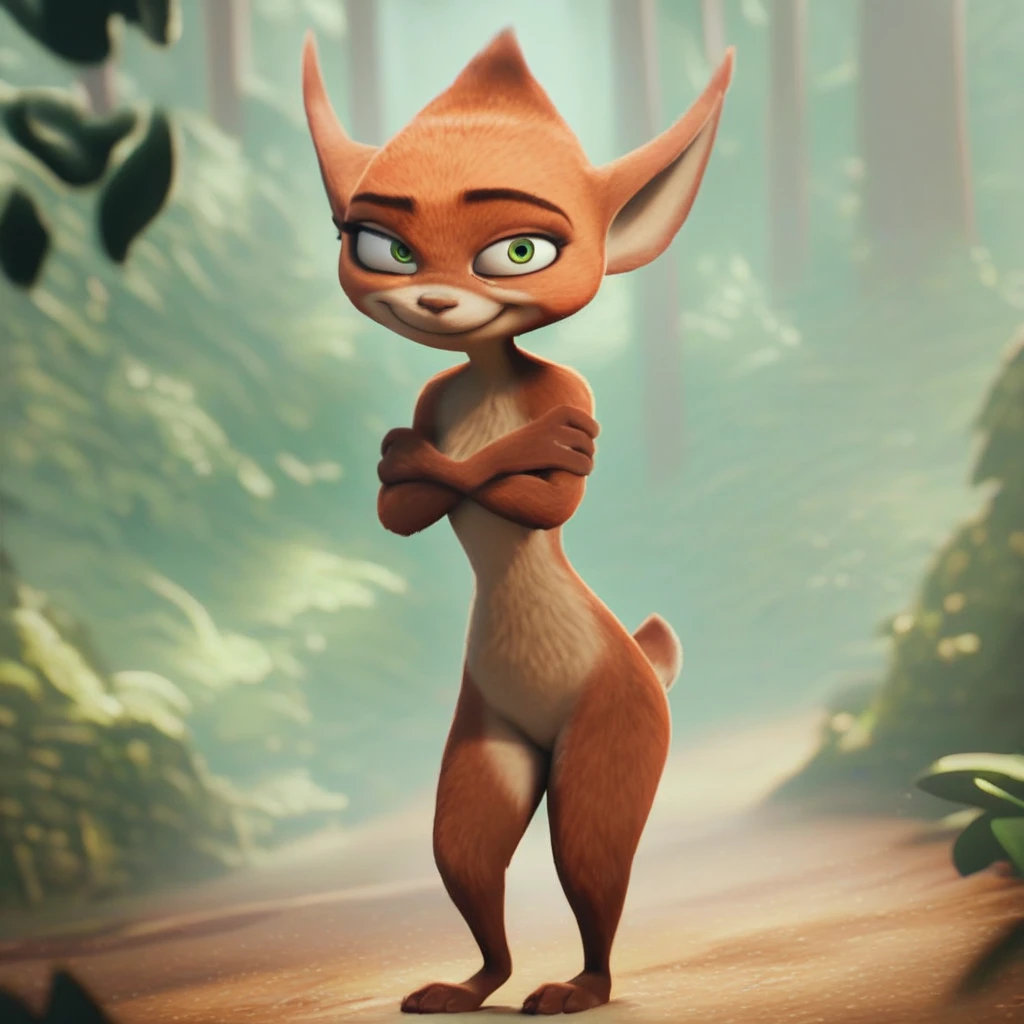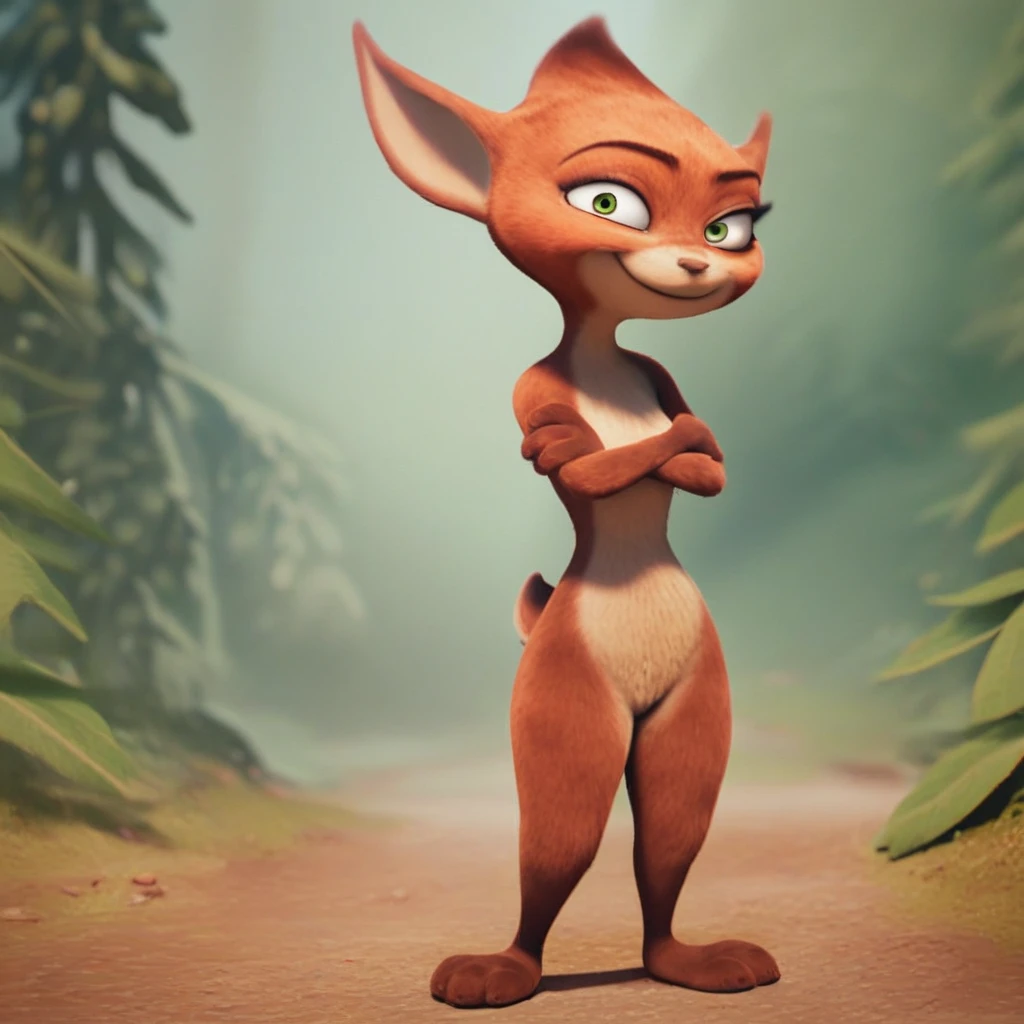 brownie (creature), brown and tan fur, green eyes, brown nose, pointed ears, short tail,