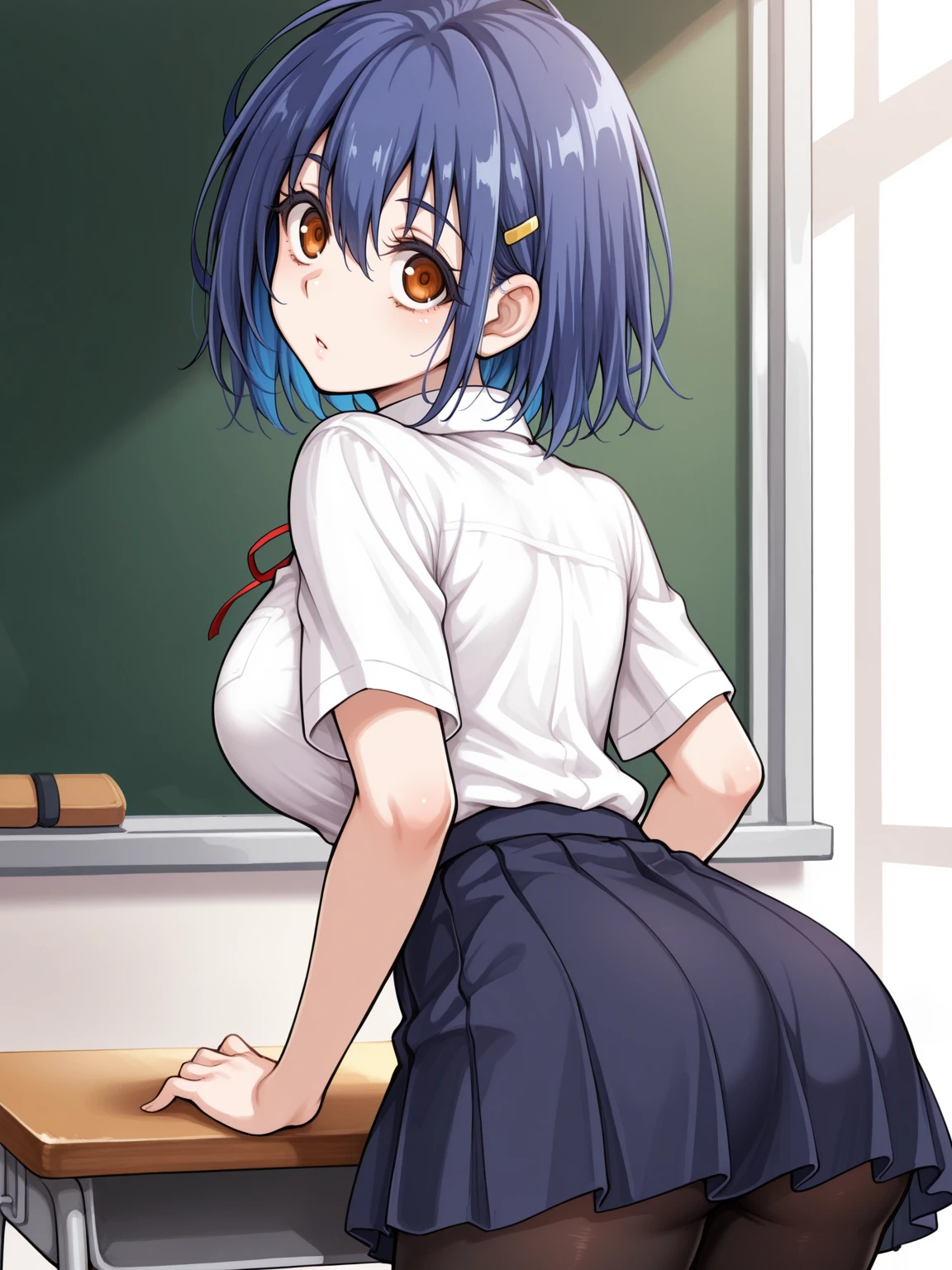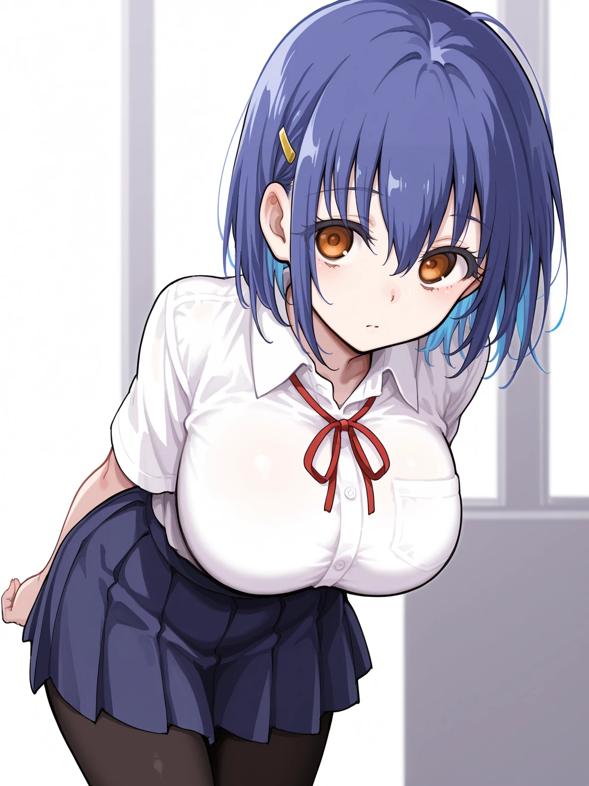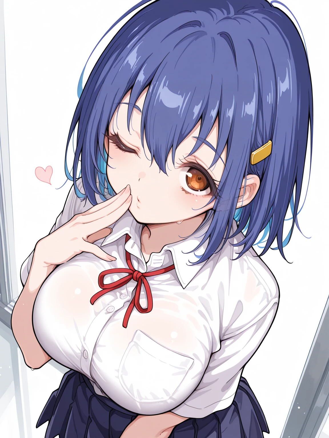 hoshisuzu, short hair, blue hair, brown eyes, hairclip, large breasts