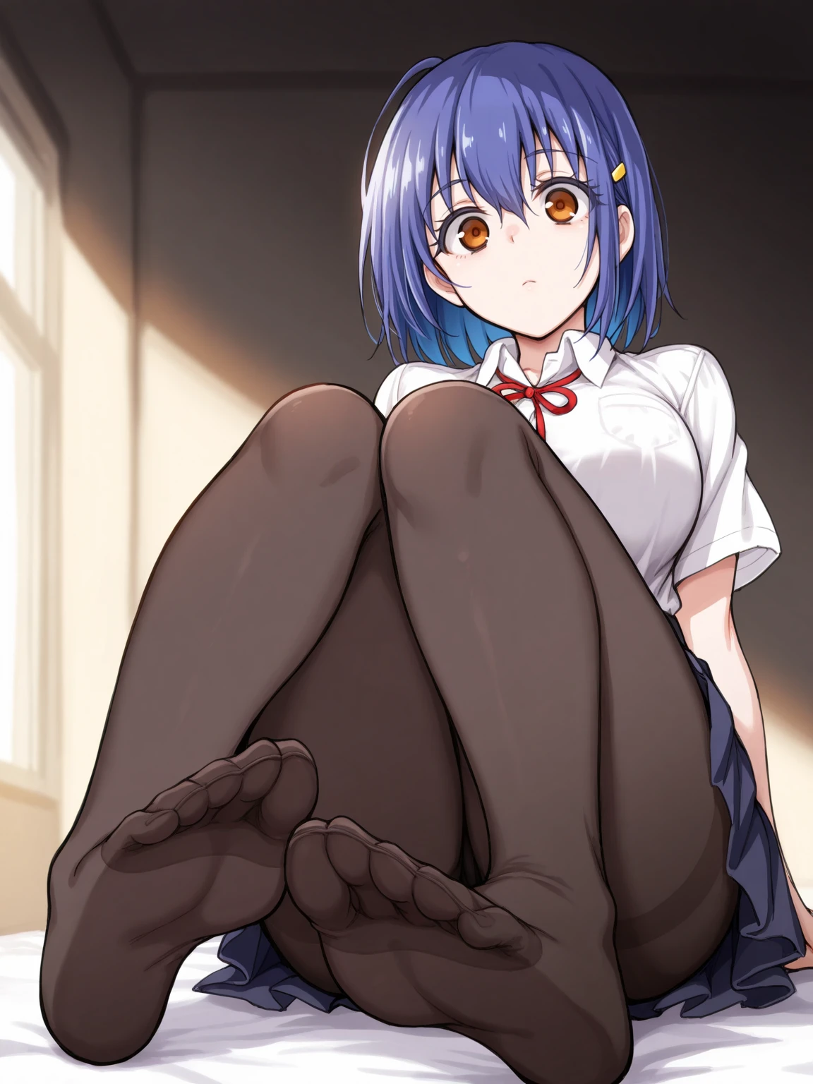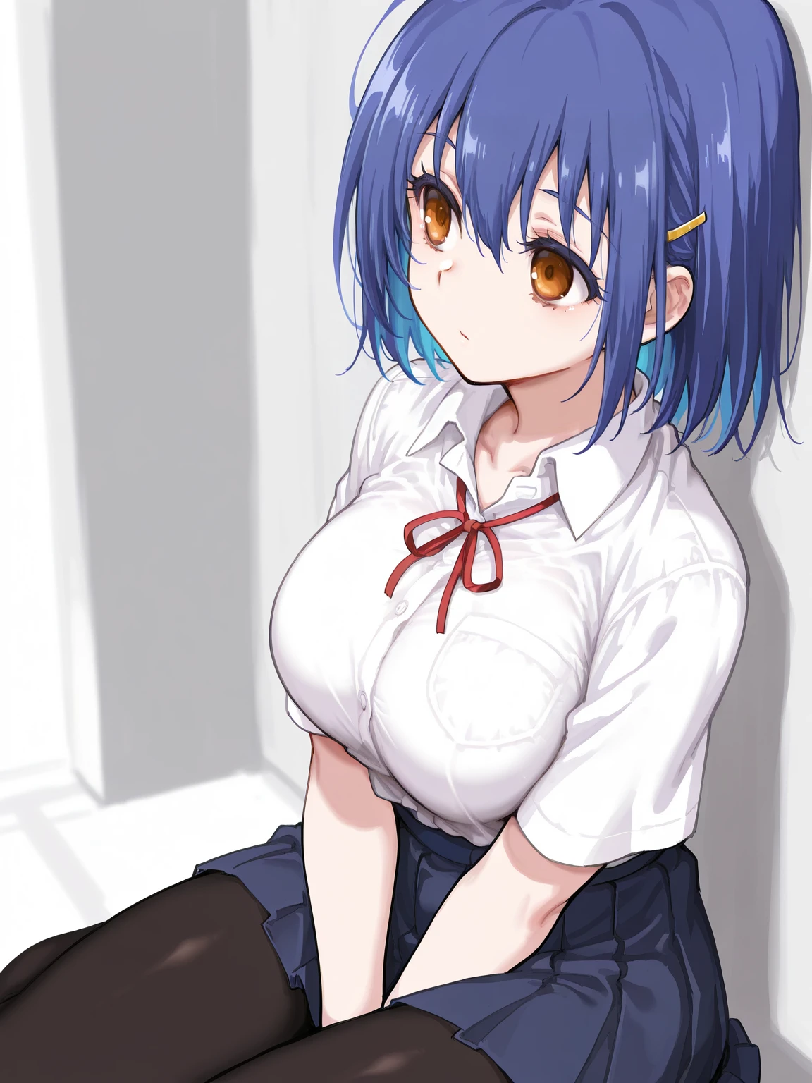 Uniform: school uniform, white shirt, collared shirt, short sleeves, blue skirt, pleated skirt, red ribbon, pantyhose