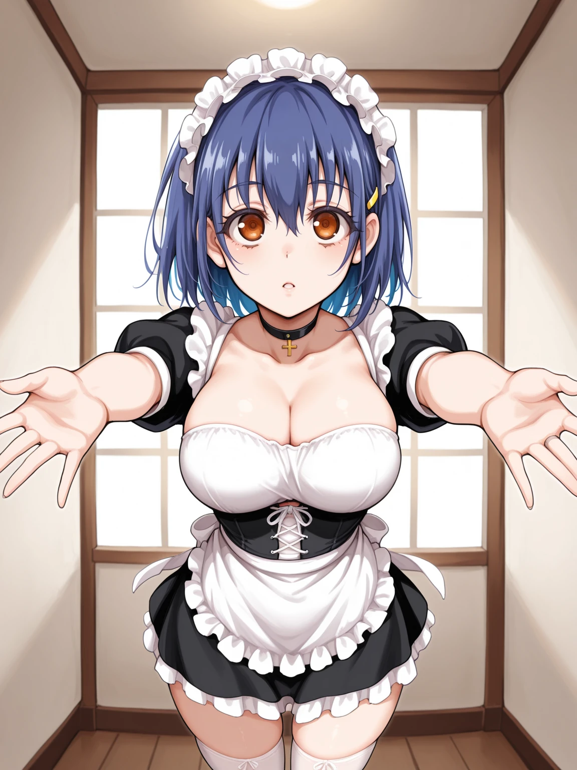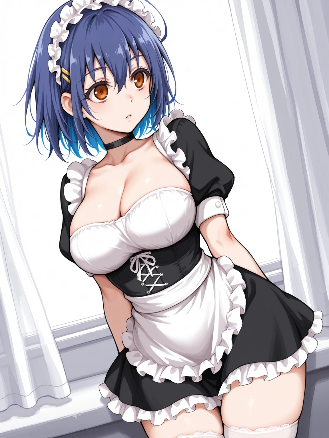 Maid: maid uniform, cleavage, maid headdress, maid apron, puffy short sleeves, black corset, short skirt, thighhighs, black choker