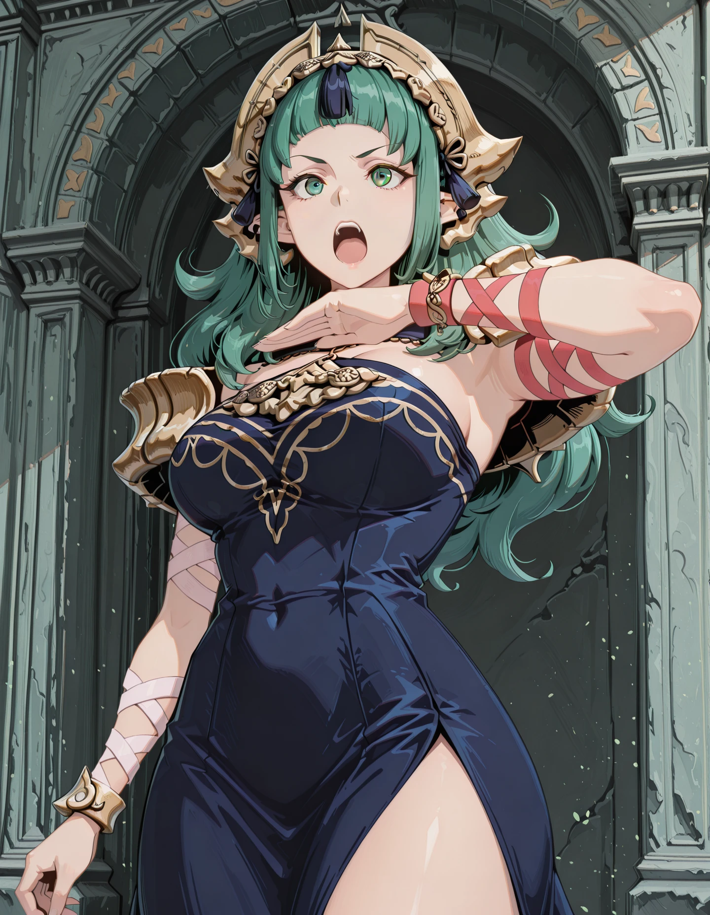 SothFortune, green hair, green eyes, long hair, pointy ears, gold ornament, , shoulders, gold pauldrons, strapless blue dress, long dress, cleavage cutout, gold trim, gold harness, side slit, white wrist ribbon, red wrist ribbon, anklet,