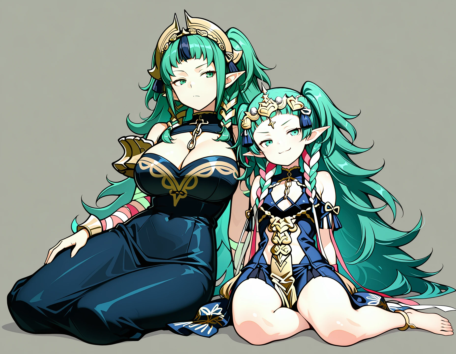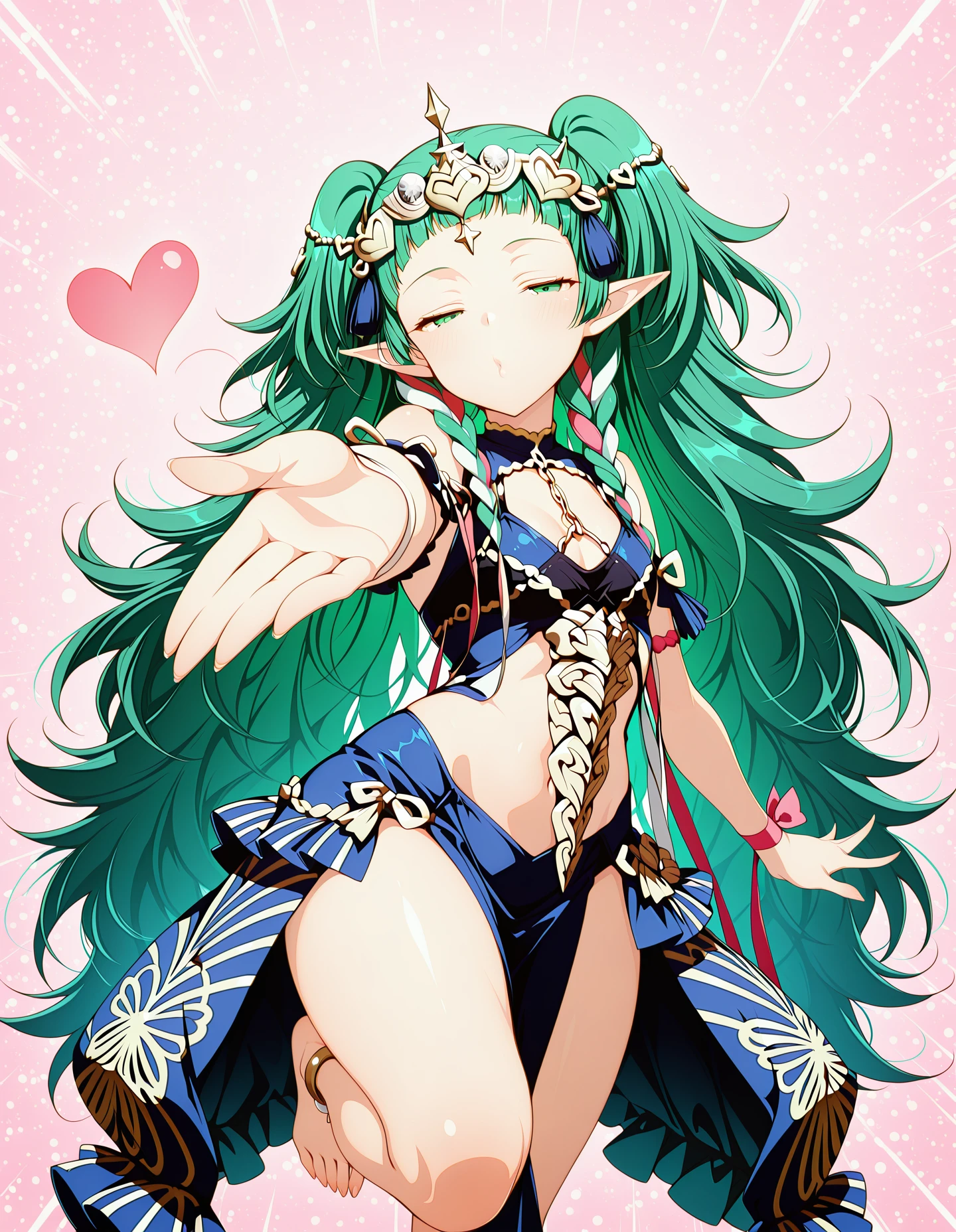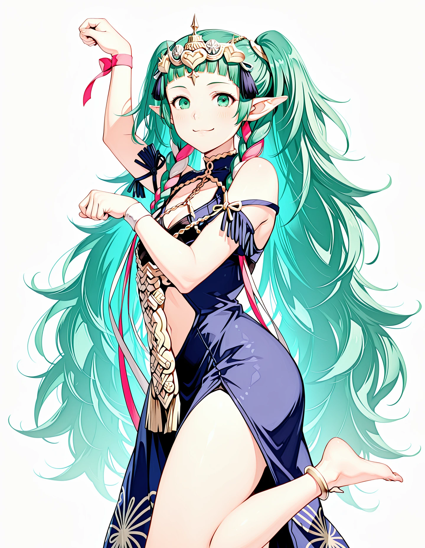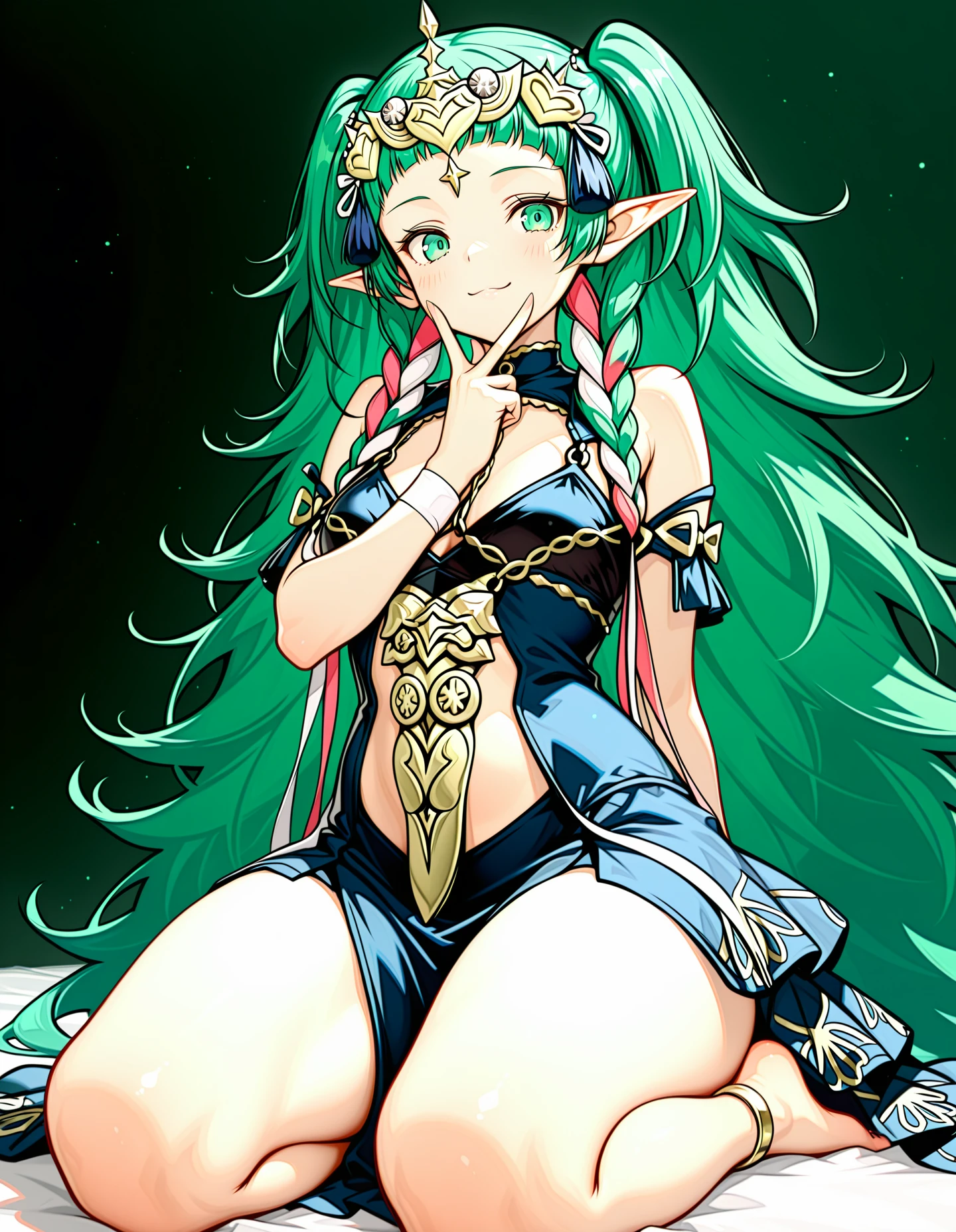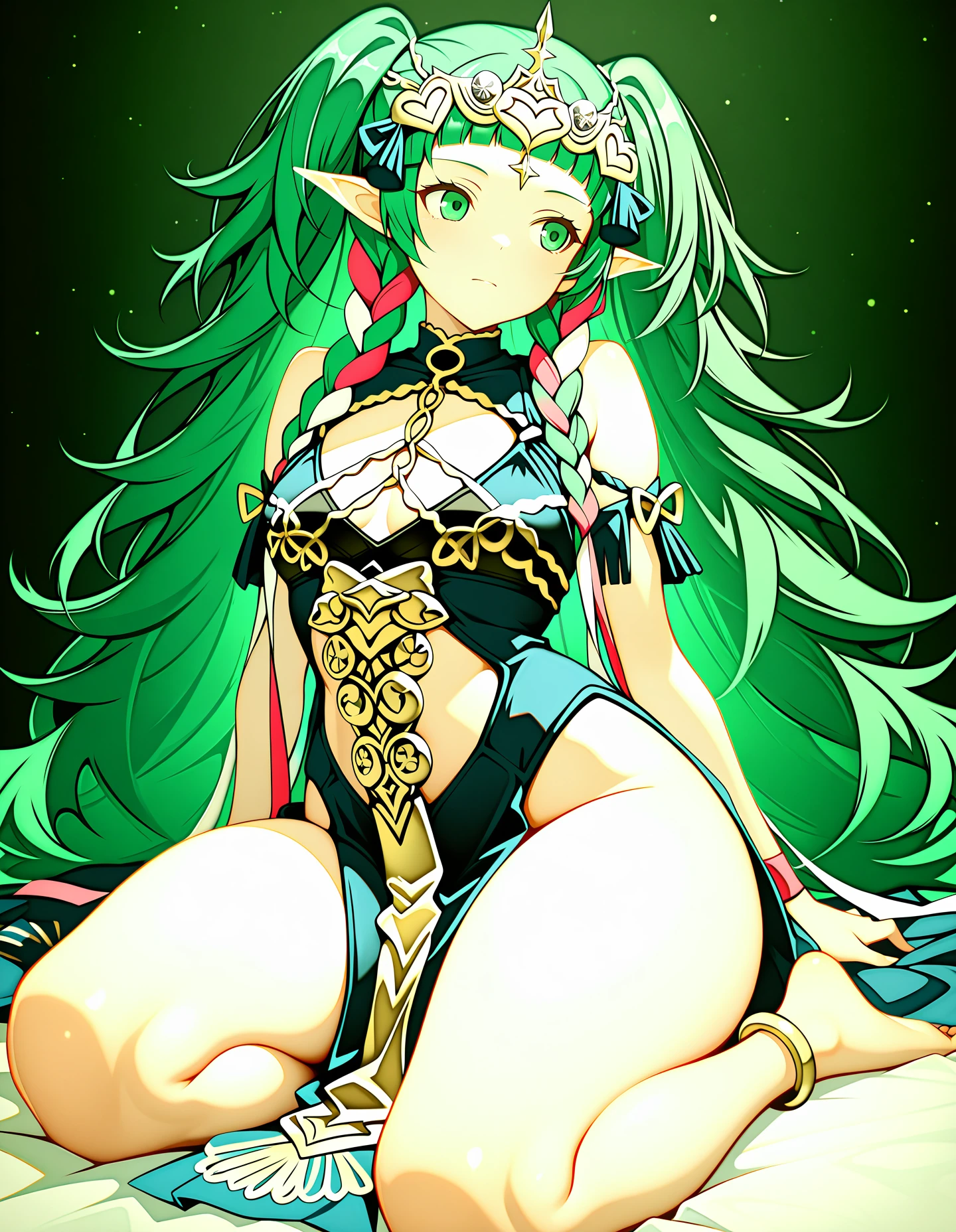 SothisBase, green hair, green eyes, twin braids, very long hair, twintail, ribbon braid, pointy ears, tiara, hair ornament, jewelry, cleavage cutout, gold trim, gold harness, tassel, ornate clothes, wrist ribbon, pelvic curtain, side slit, armlet, anklets, barefoot,