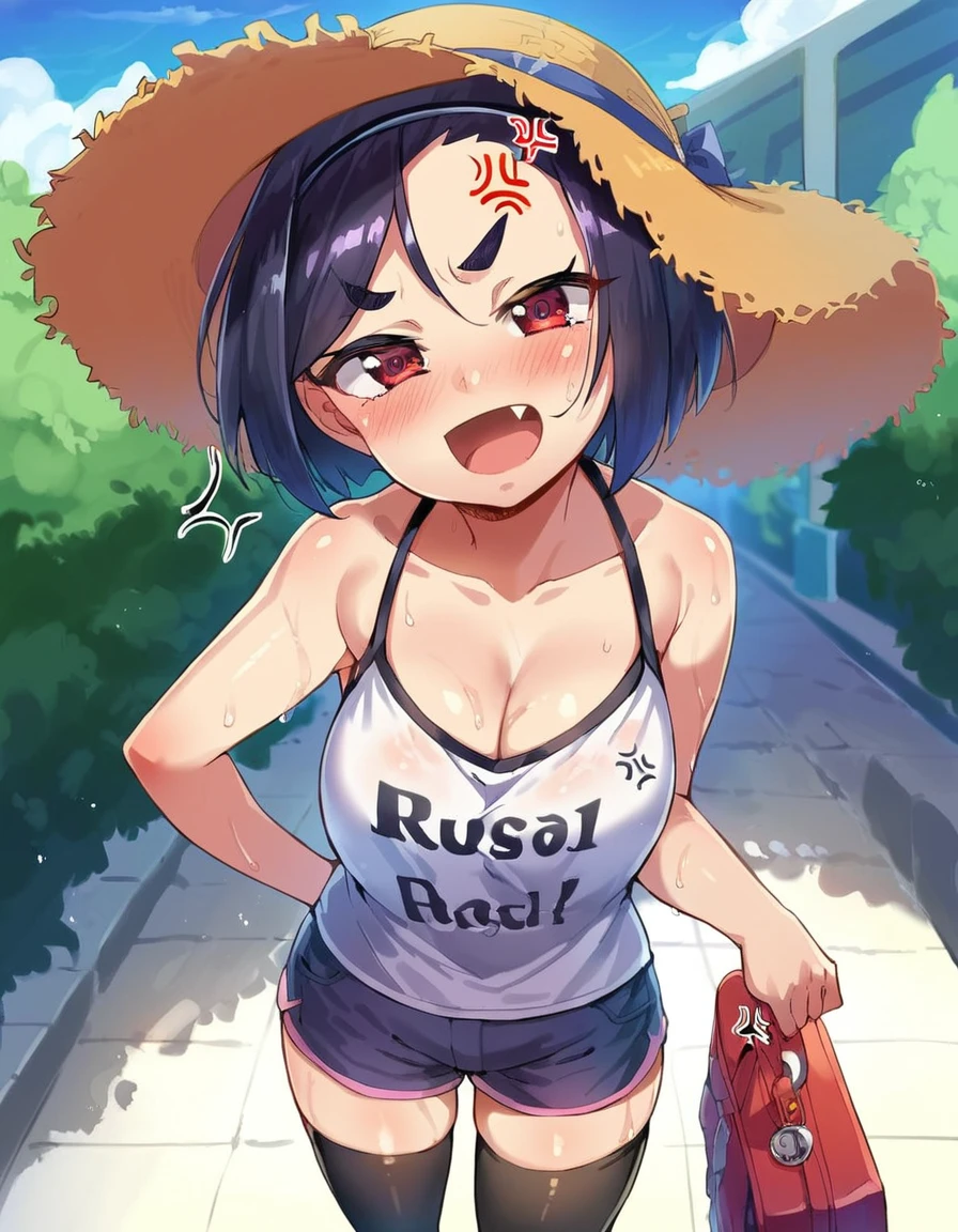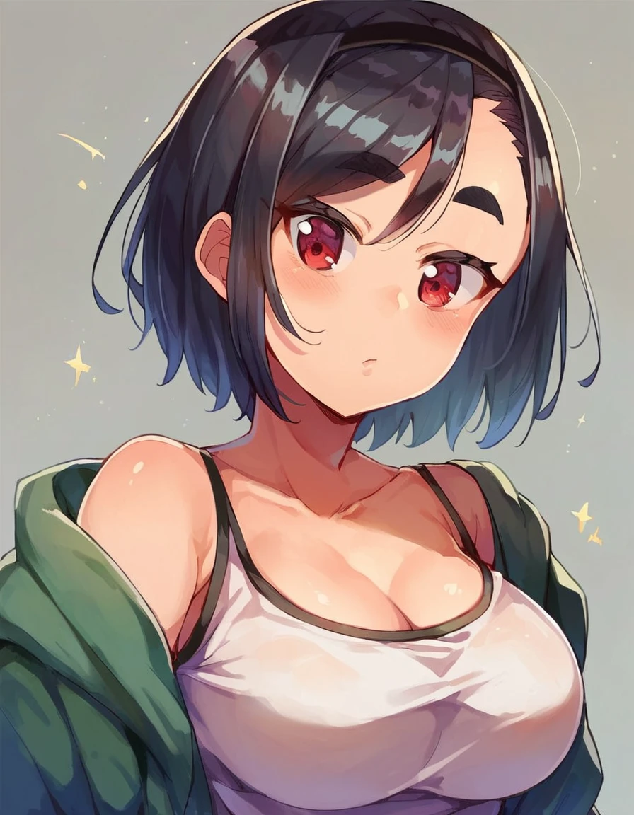 Base tags for Megu are: 1girl, thick eyebrows, black hair, red eyes, short hair, hairband, breasts, large breasts,