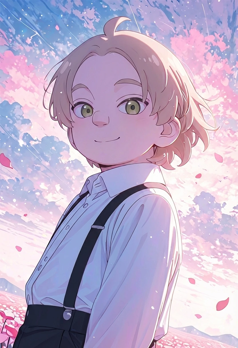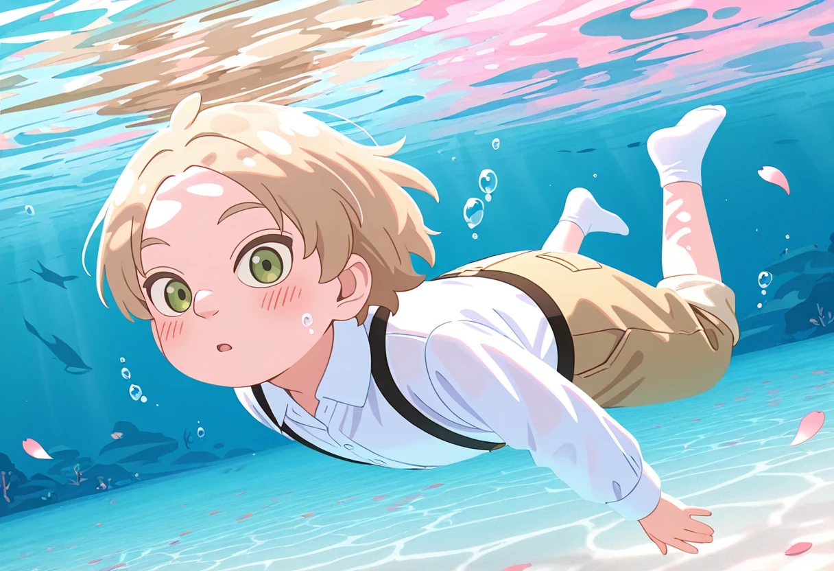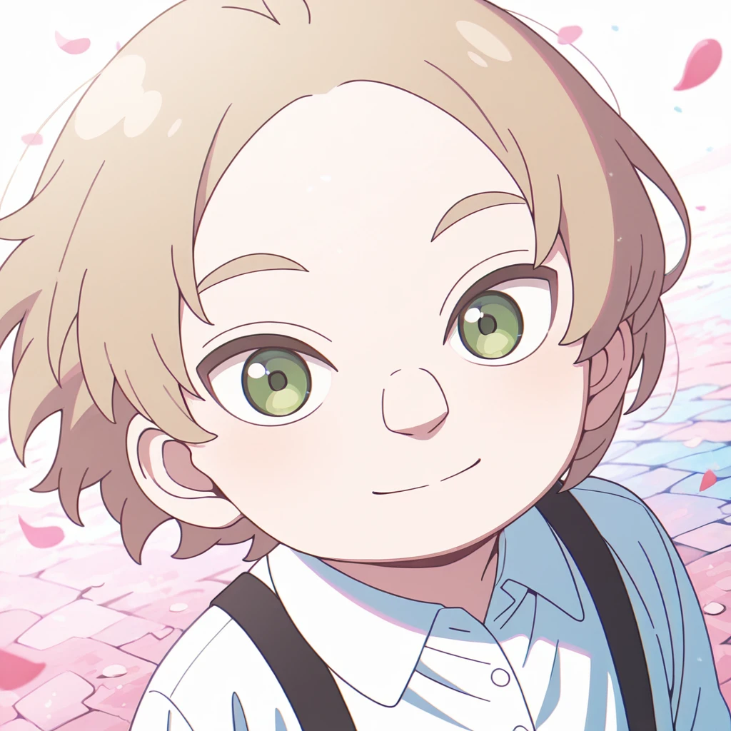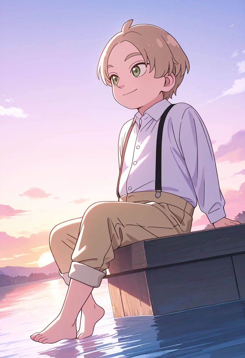 • kid_general_\(spy_x_family\), 1boy, child, male focus, light brown hair, plump, white dress shirt, black suspenders, brown short shorts, brown loafers