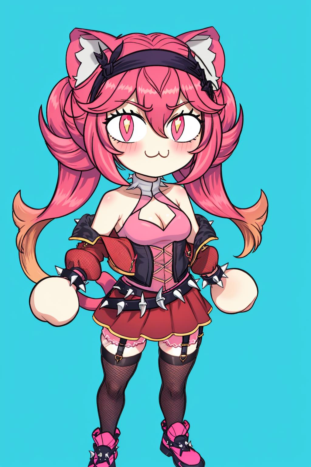 jacket, hairband, elbow gloves, belt, fingerless gloves, bracelet, red skirt, garter straps, clothing cutout, cleavage cutout, corset, spikes, spiked bracelet, fishnet thighhighs, black thighhighs