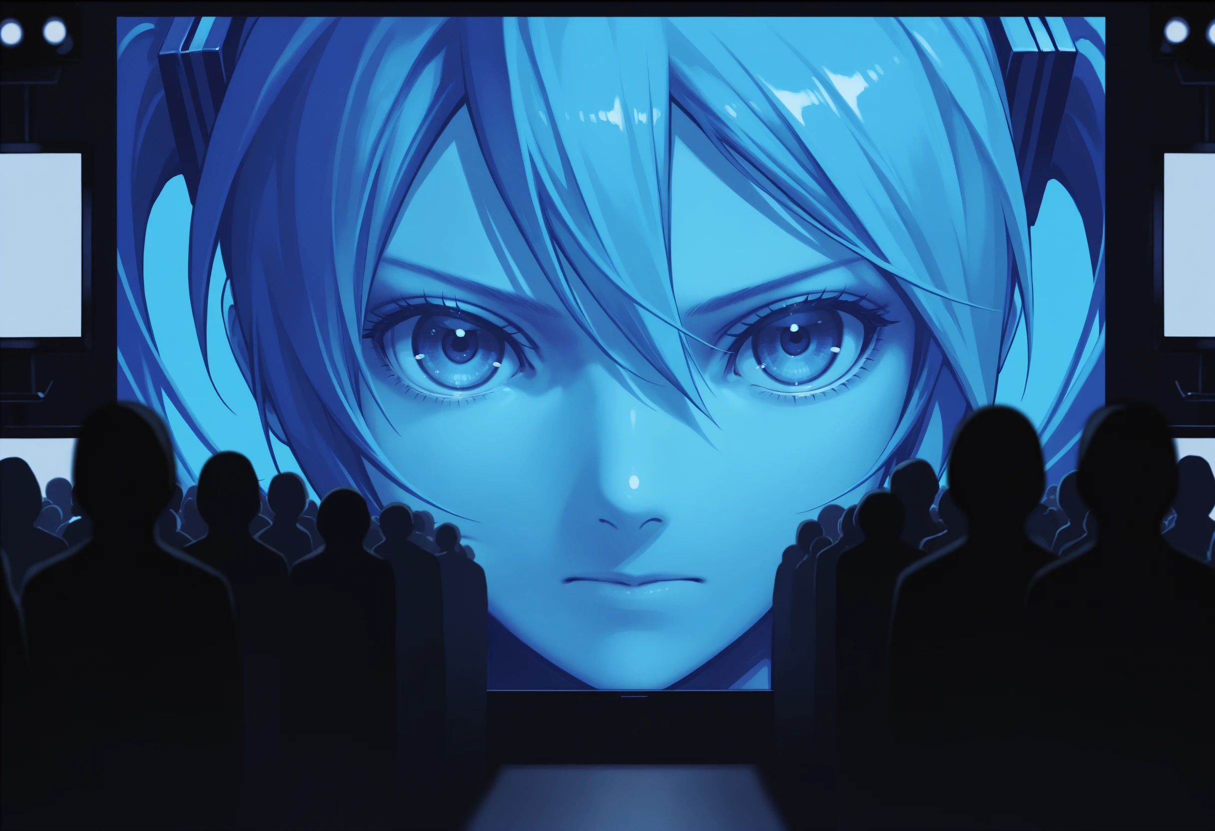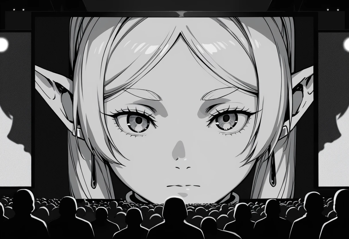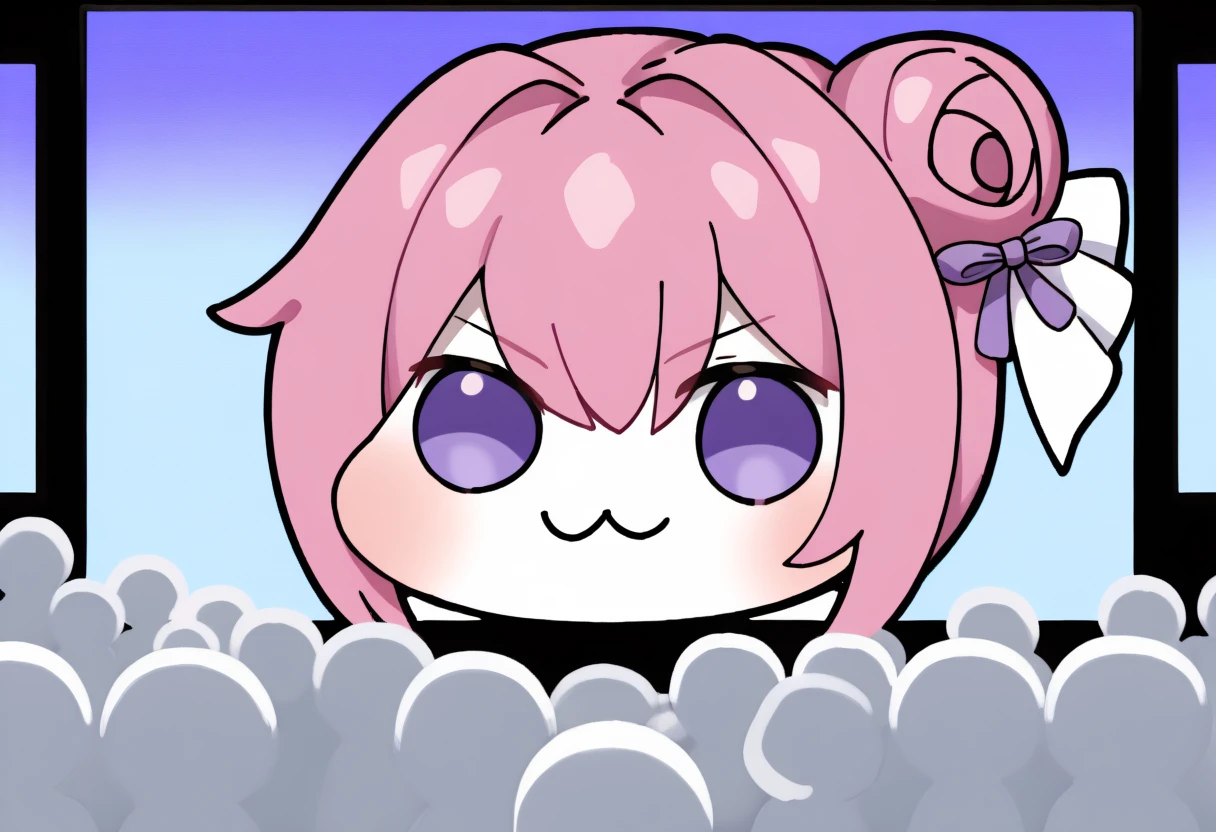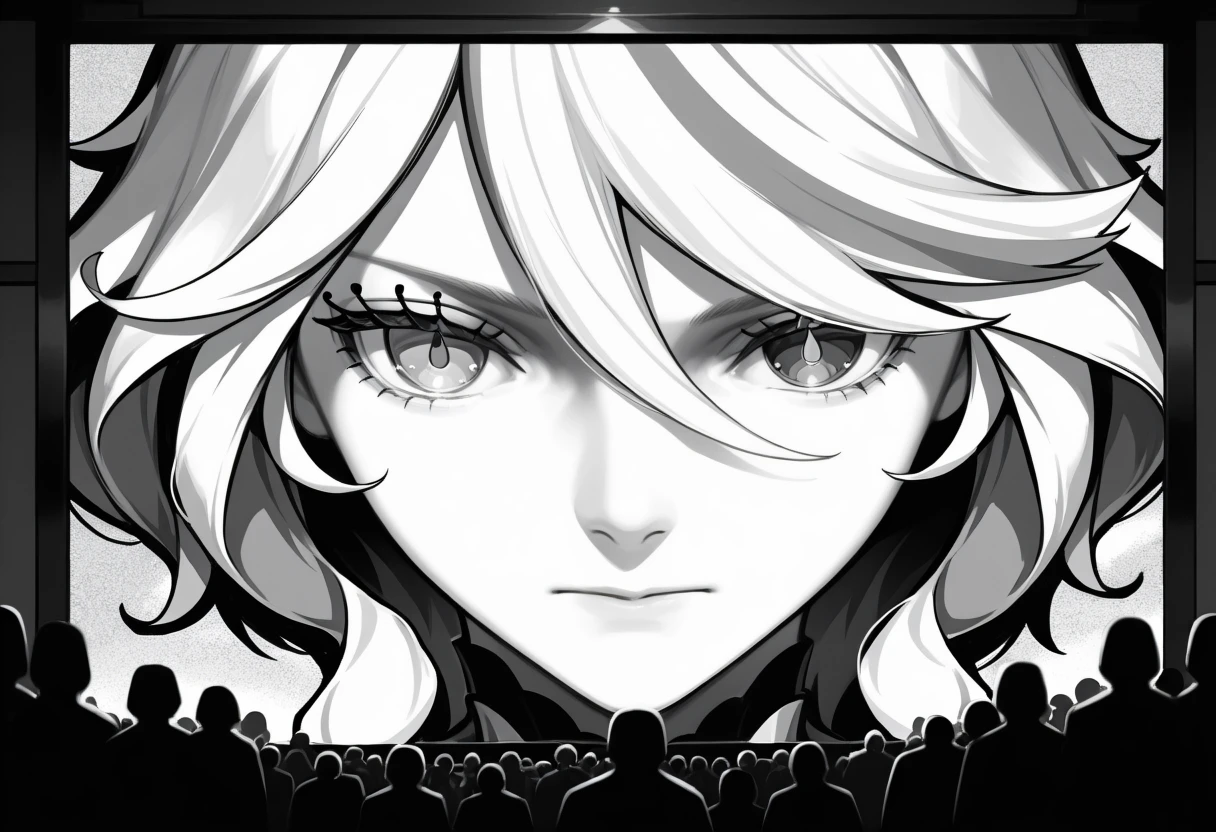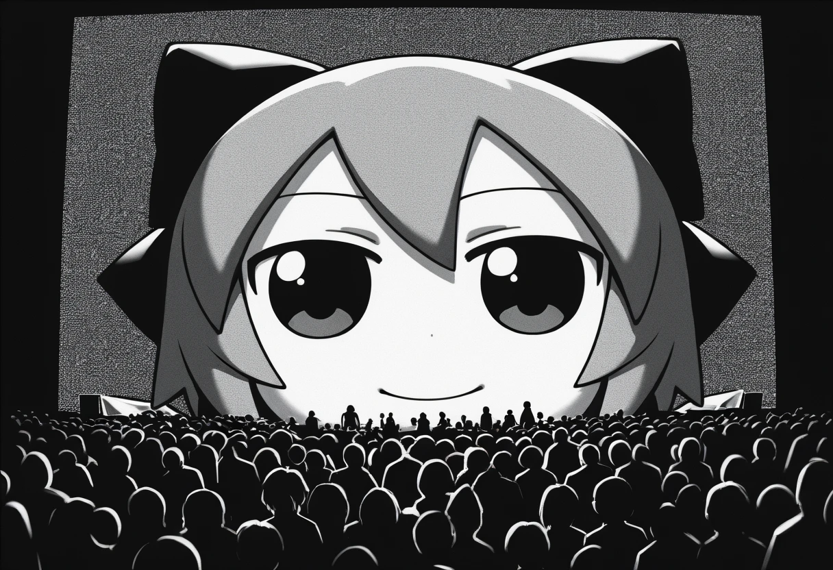 Trigger word: looking at viewer, closed mouth, portrait, screen, silhouette, crowd,