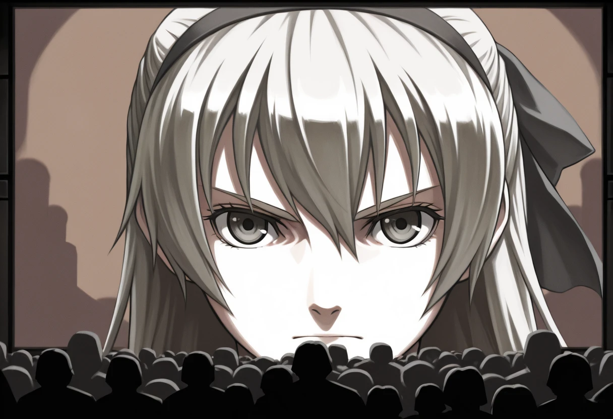 looking at viewer, closed mouth, portrait, screen, silhouette, crowd,