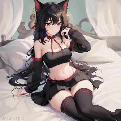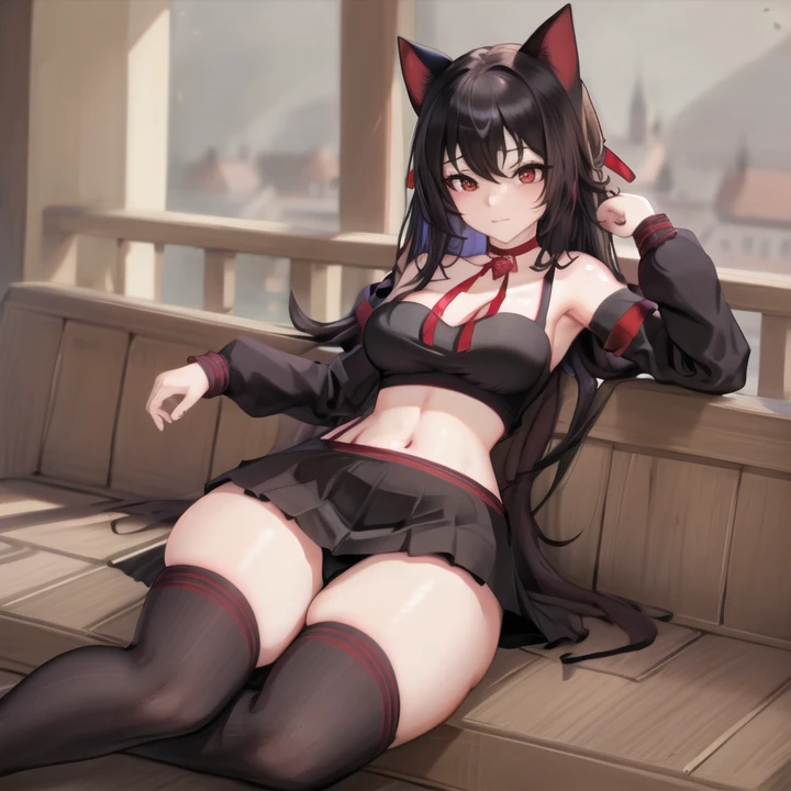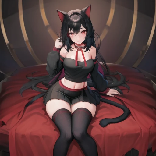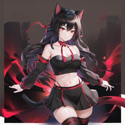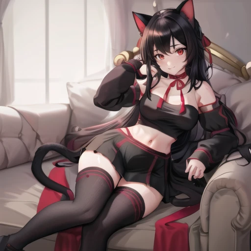1girl, curvy, medium breasts, cat ears, cat tail, red eyes, slitted eyes, solo, solo focus, red ribbon choker, midriff, thigh highs, detached sleeves, long sleeves, bare shoulders, wide hips