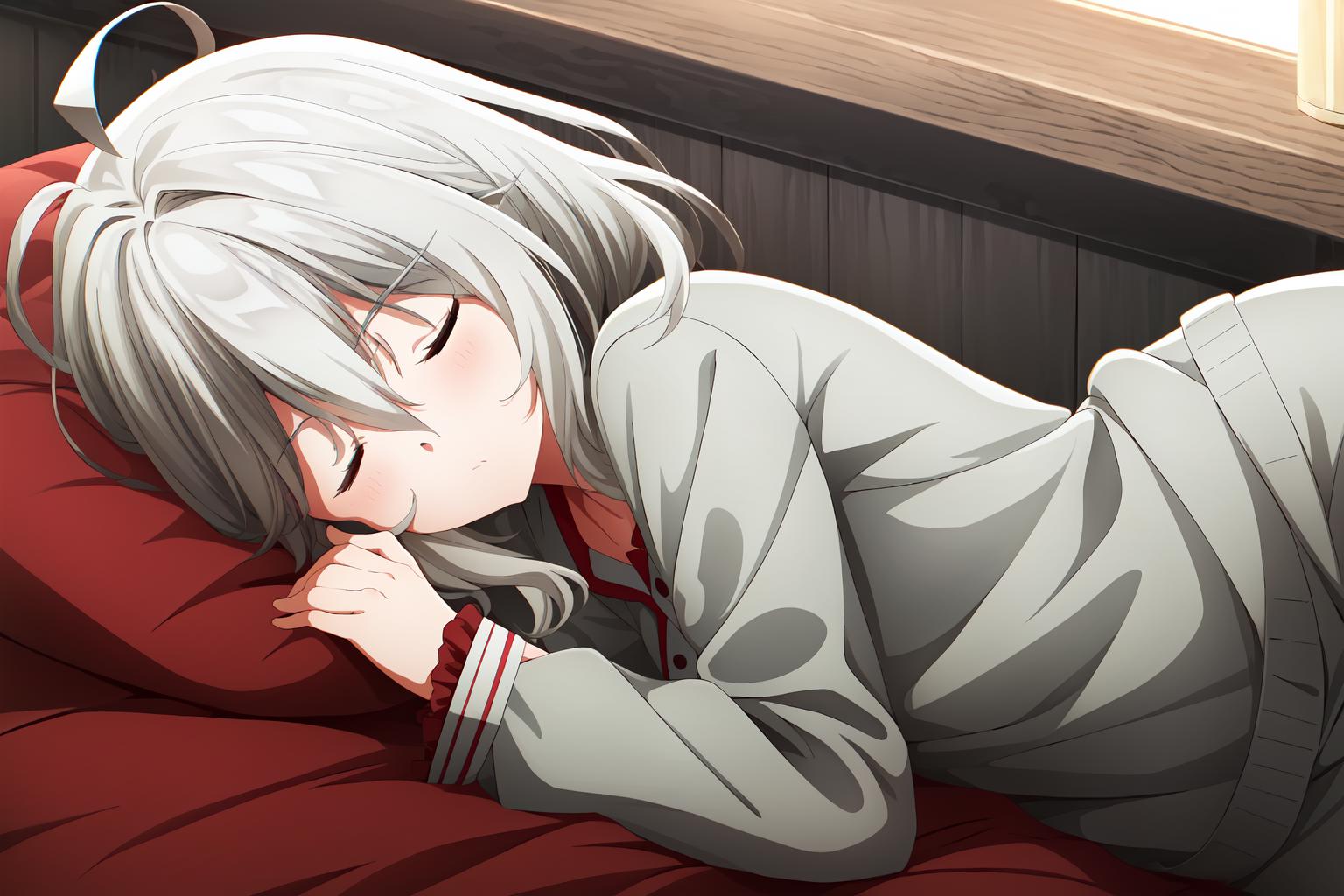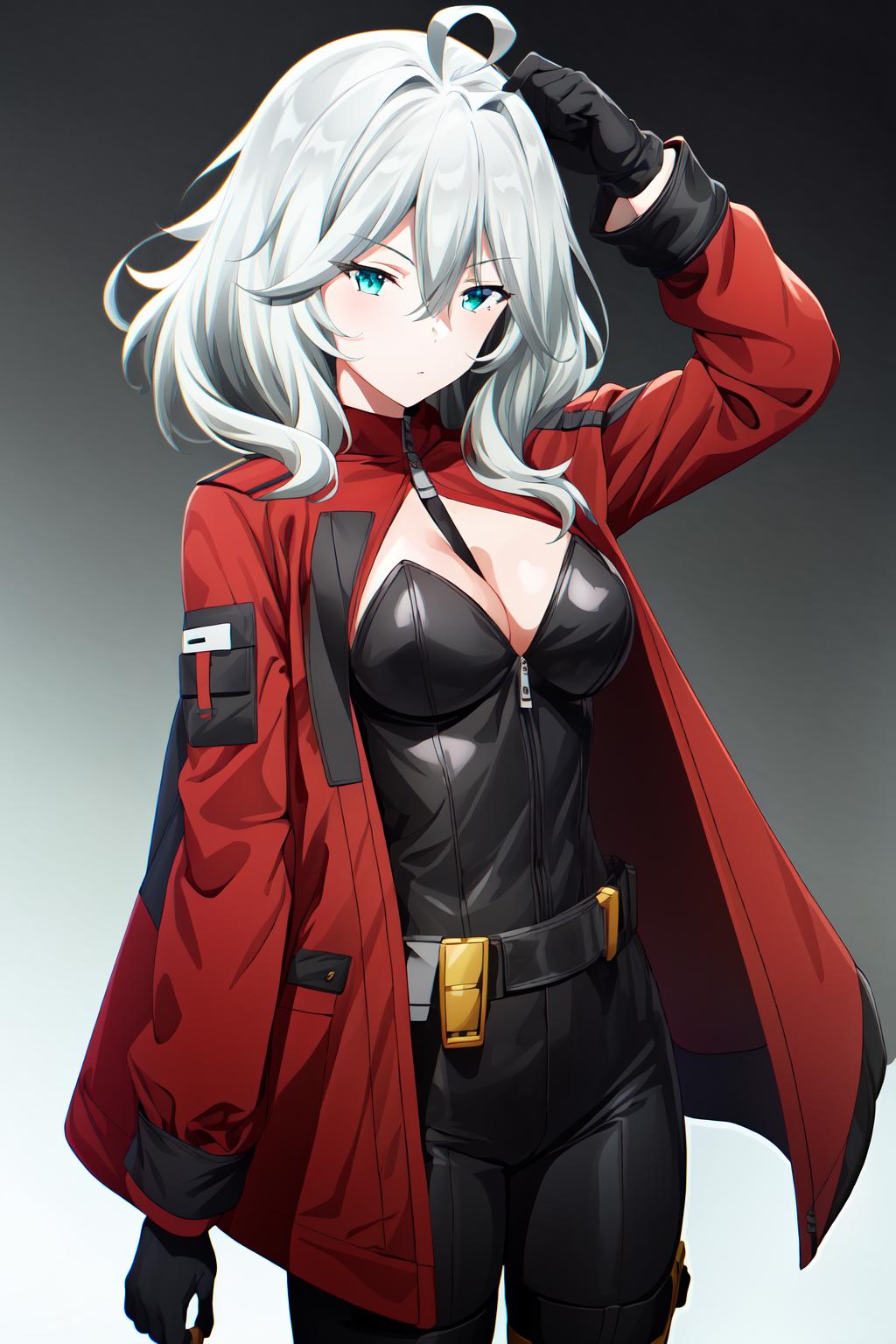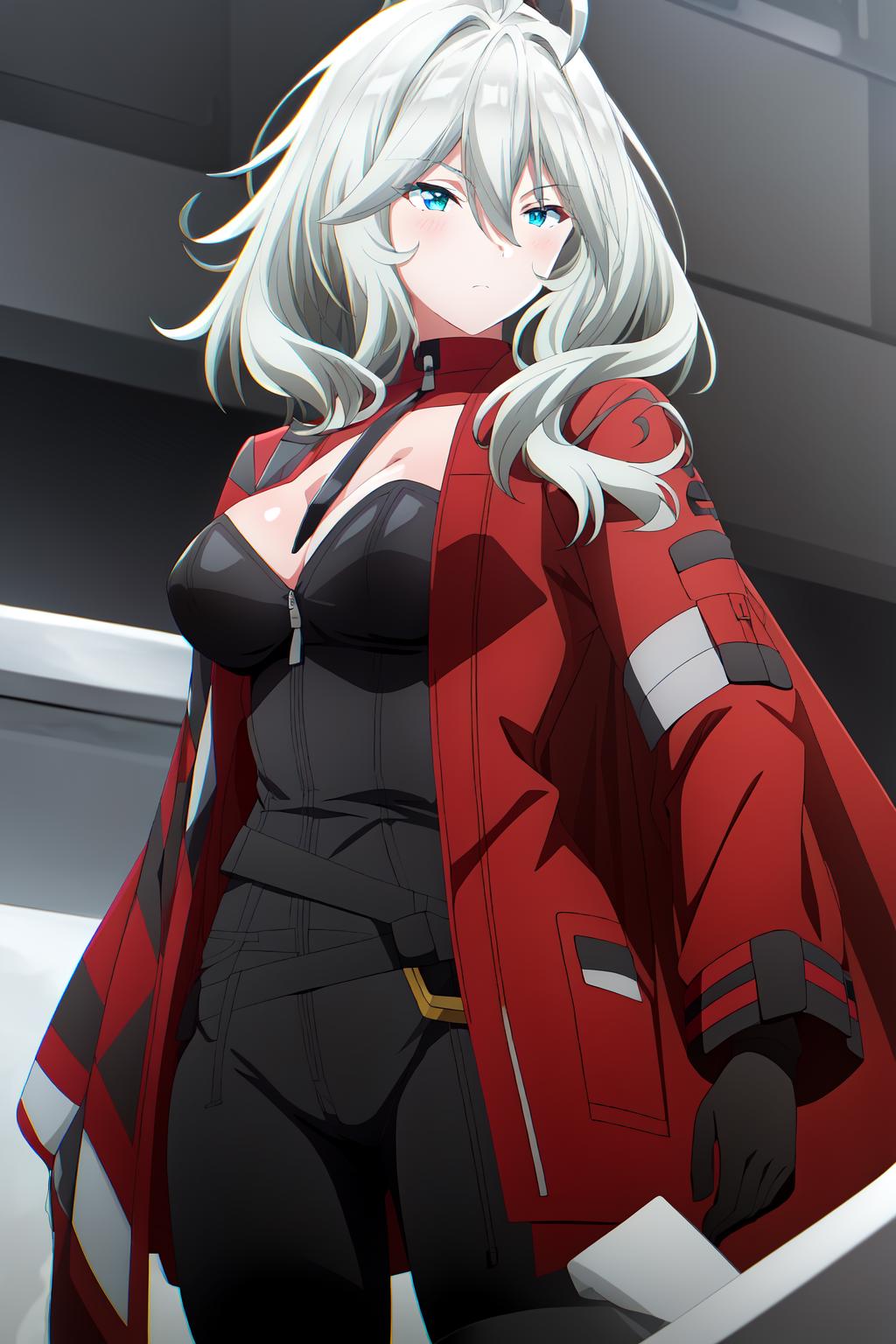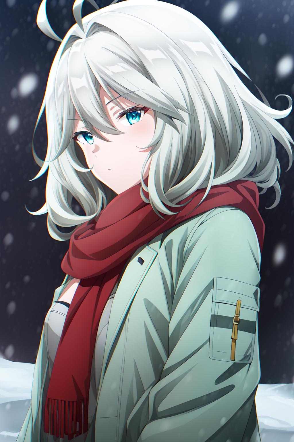 grey hair, medium hair, ahoge, cyan eyes