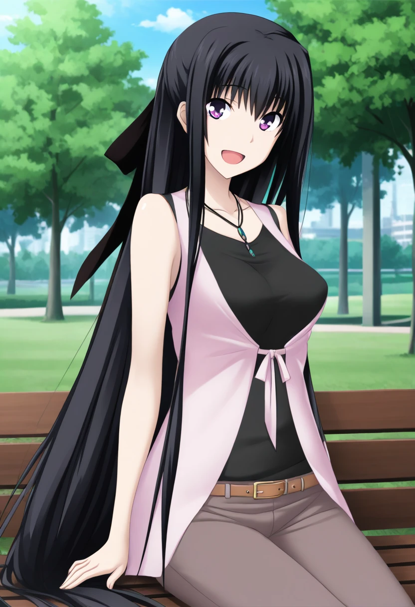 lin_majikoi,lin_date,purple eyes,long straight hair,straight hair,very long hair,long hair,absurdly long hair,bow ribbon,bow,black bow,black bow ribbon,hair ribbon,ribbon,black hair ribbon,bare shoulders, sidelocks,black hair,black undervest,undervest,collarbone,sleeveless,pink dress,dress, jewelry, necklace,belt,light brown jeans,jeans