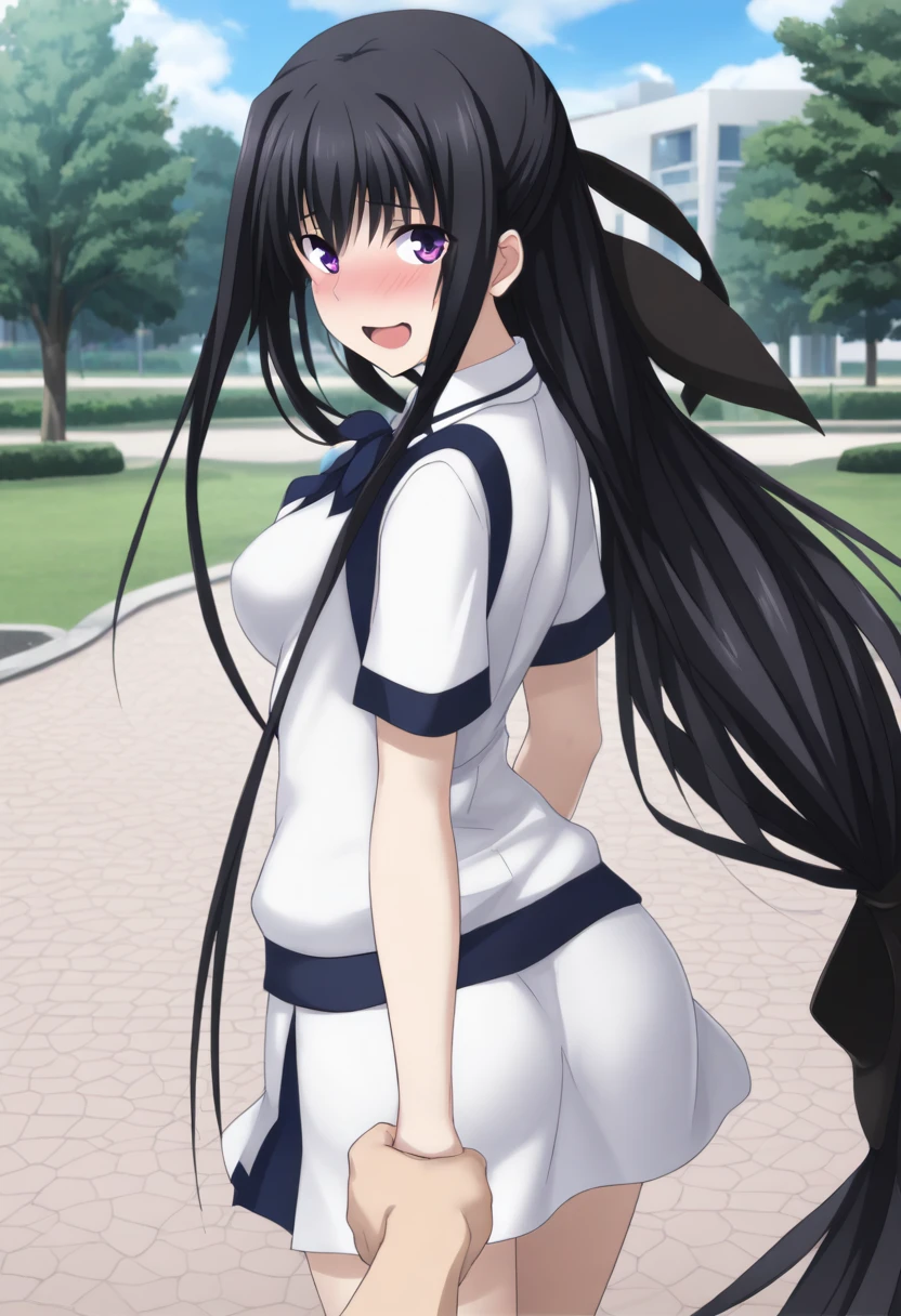 lin_majikoi,lin_school,purple eyes, sidelocks,black hair,low-tied long hair, hair ribbon,black hair ribbon, hair bow,bow,black hair bow,blue bow,very long hair,long hair,absurdly long hair,bow ribbon,bow,black bow,black bow ribbon,hair ribbon,ribbon,black hair ribbon,collared shirt,school uniform,dark blue trim,short skirt,skirt,shirt,white shirt,ponytail,white skirt