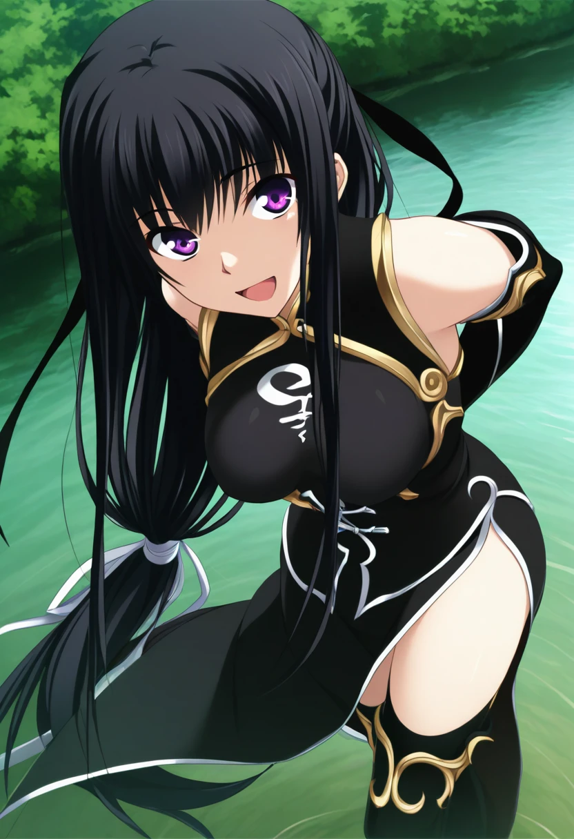 lin_majikoi,lin_battle,purple eyes,hair ribbon,ribbon,black hair ribbon,black hair,ponytail, low-tied long hair,very long hair,long hair,absurdly long hair,china dress,dress,black dress,thighhighs,black thighhighs,black thigh boots,long dress,china clothes, sidelocks,white trim,golden trim,trim,detached sleeves, fingerless gloves,black gloves,gloves,elbow gloves,bare shoulders,thigh boots,zettai ryouiki
