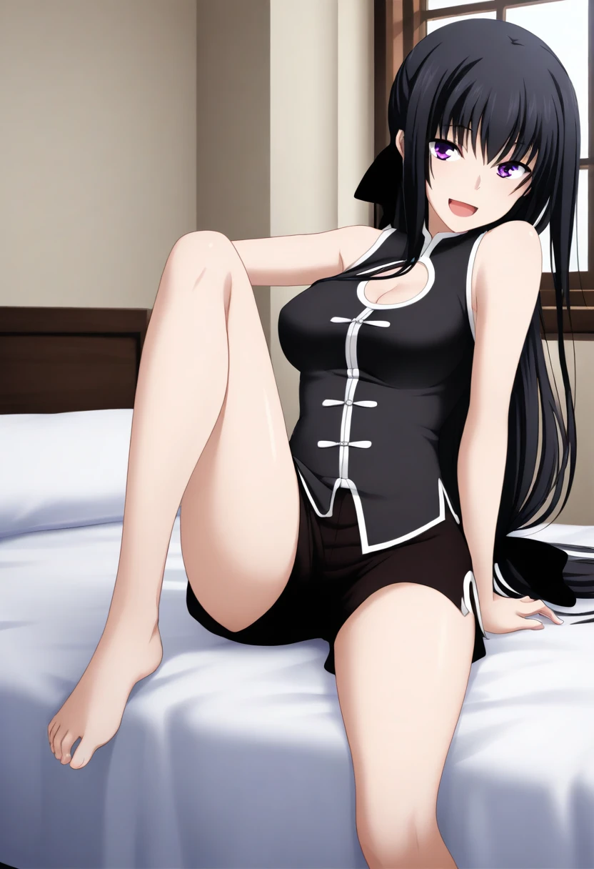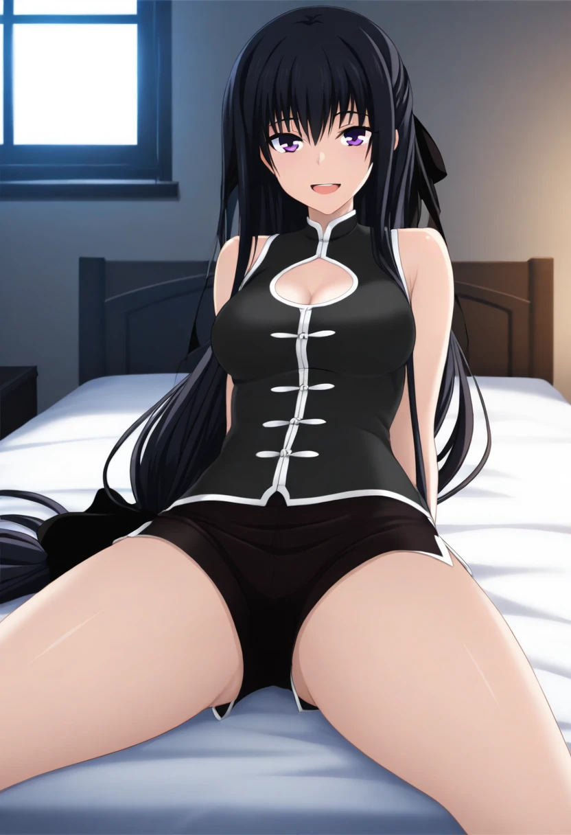 lin_majikoi,lin_casual,low-tied long hair,very long hair,long hair,bow ribbon,bow,black bow,black bow ribbon,hair ribbon,ribbon,black hair ribbon,absurdly long hair,purple eyes,china clothes,short shorts, black shorts, bare shoulders, sidelocks,black hair,ponytail,shirt,black shirt,sleeveless shirt,clothing cutout, sleeveless, cleavage cutout, white trim,trim