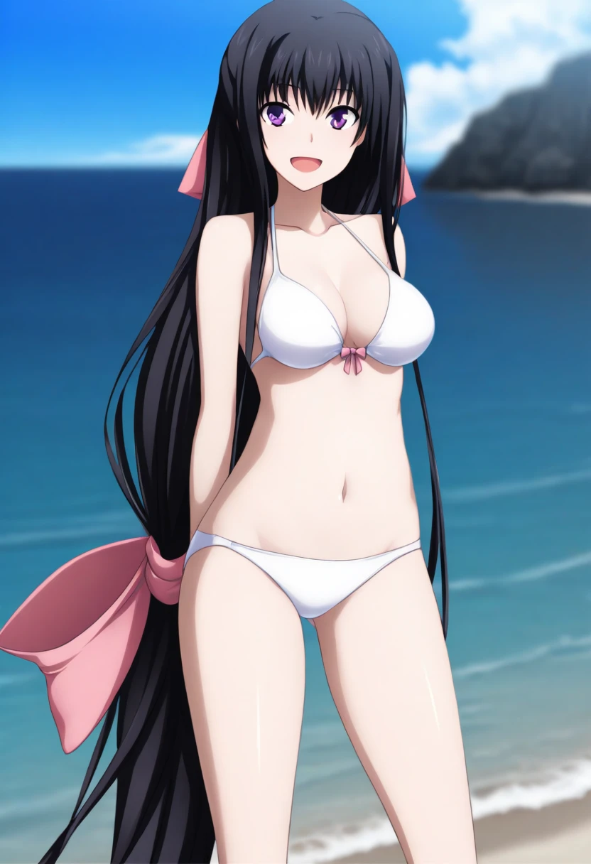 lin_majikoi,lin_bikini,black hair,purple eyes,ponytail, low-tied long hair,very long hair,long hair,absurdly long hair,bow ribbon,bow,pink bow,pink bow ribbon,hair ribbon,ribbon,pink hair ribbon,bikini,white bikini,navel,swimsuit,thighs