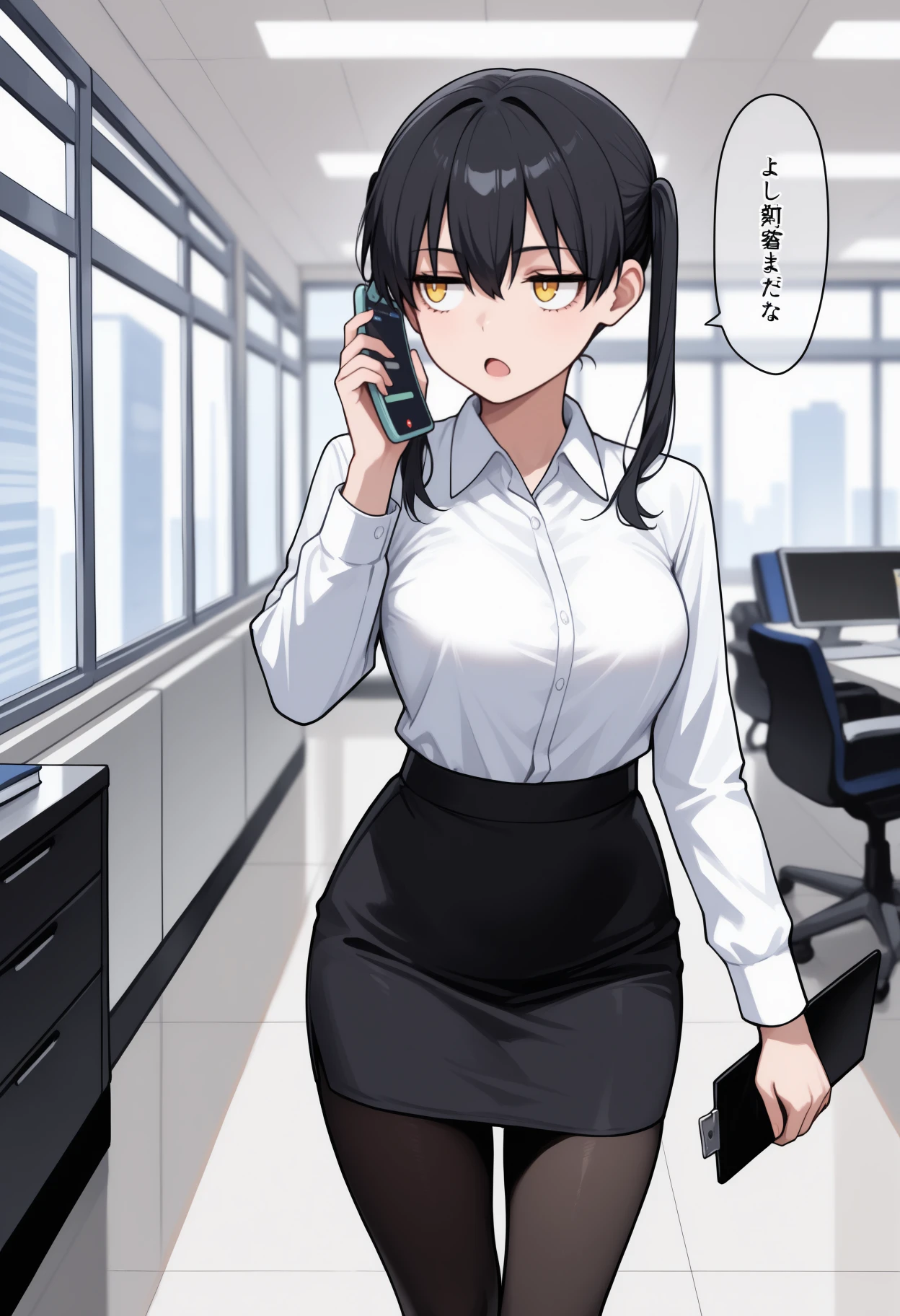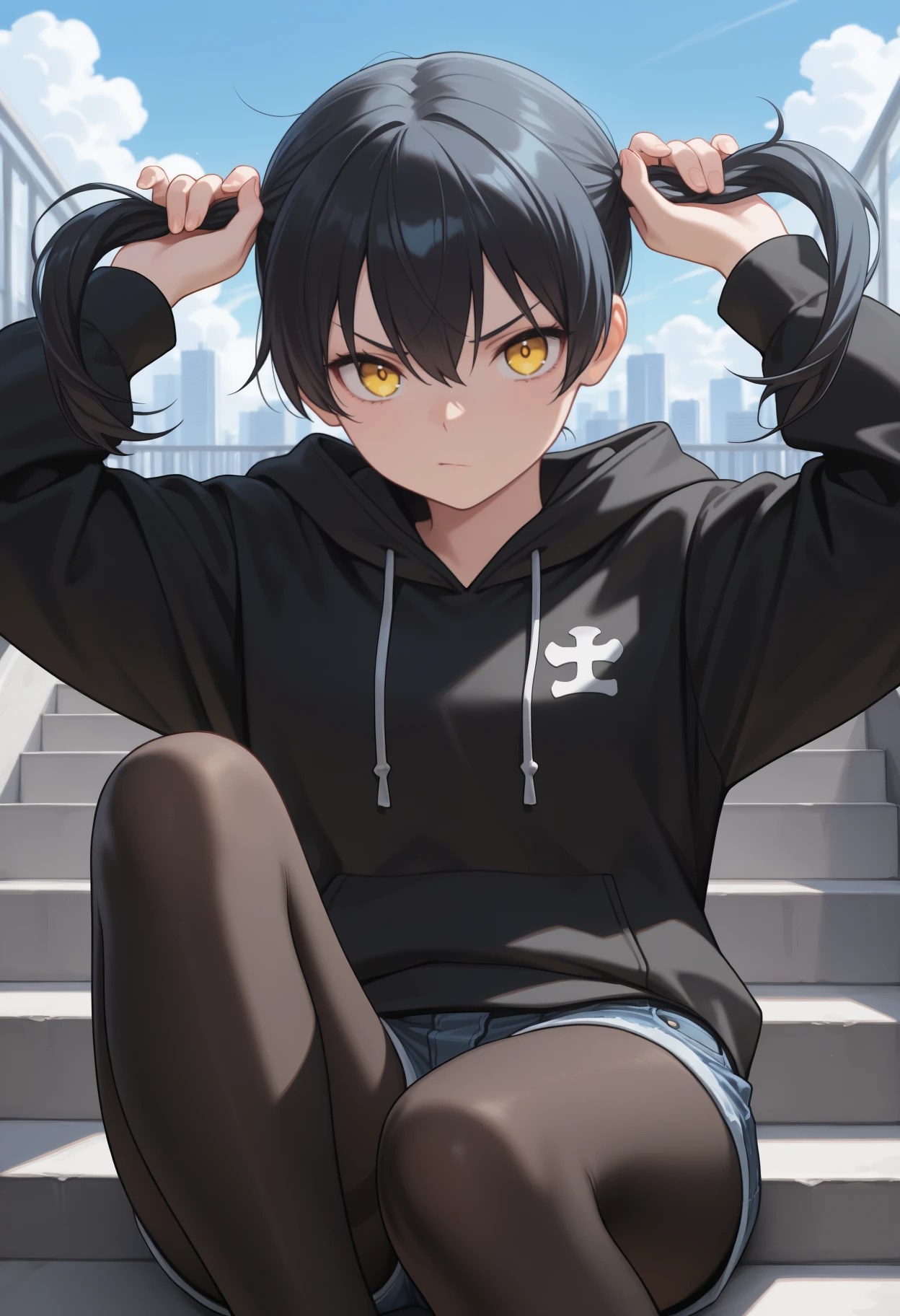 tmkkts, long hair, black hair, hair between eyes, sidelocks, twintails, yellow eyes