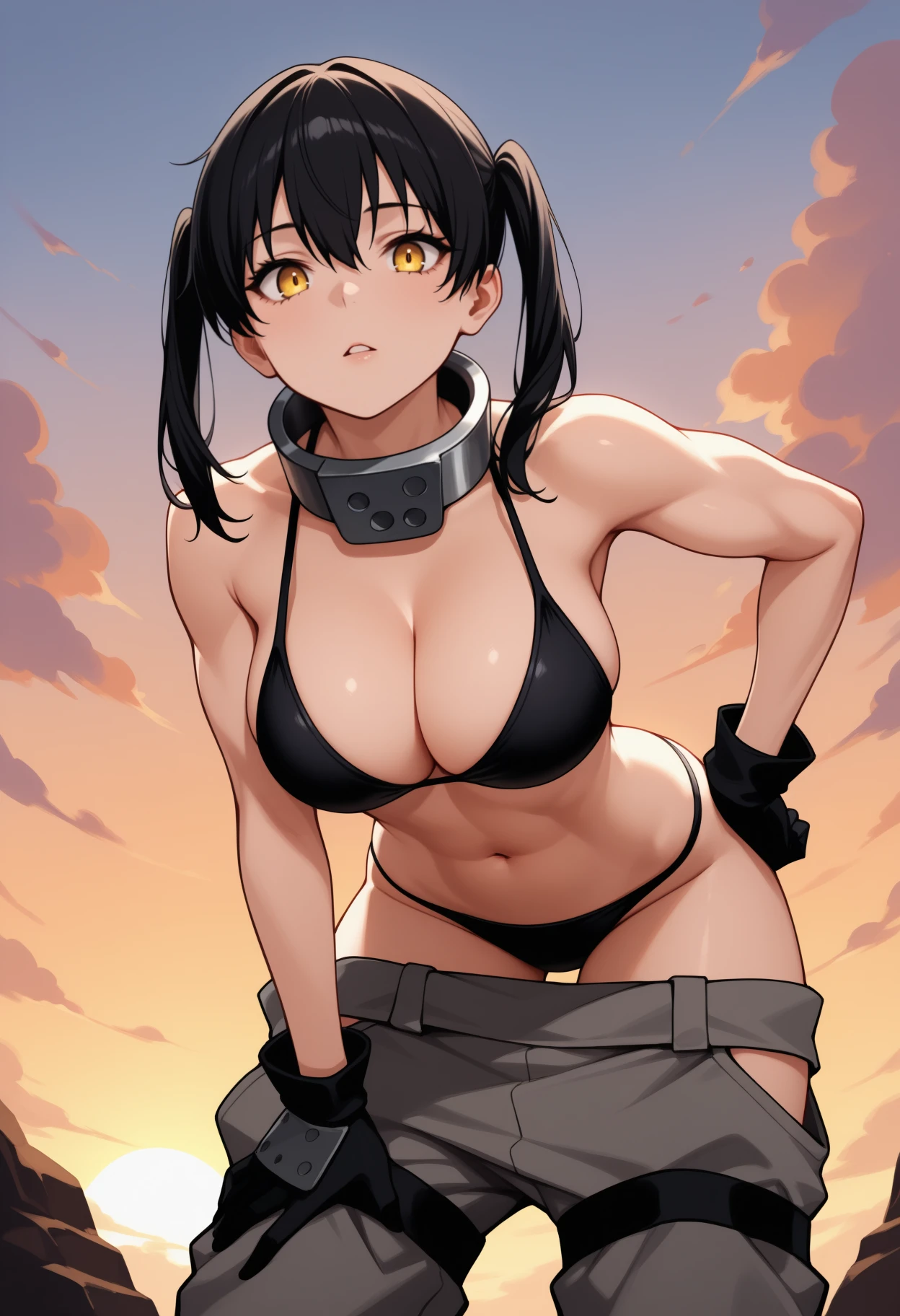 Default Outfit: black coat, open coat, long sleeves, metal collar, black bikini, bikini top only, black gloves, gauntlets, grey pants, baggy pants, hip vent, midriff, navel, cleavage