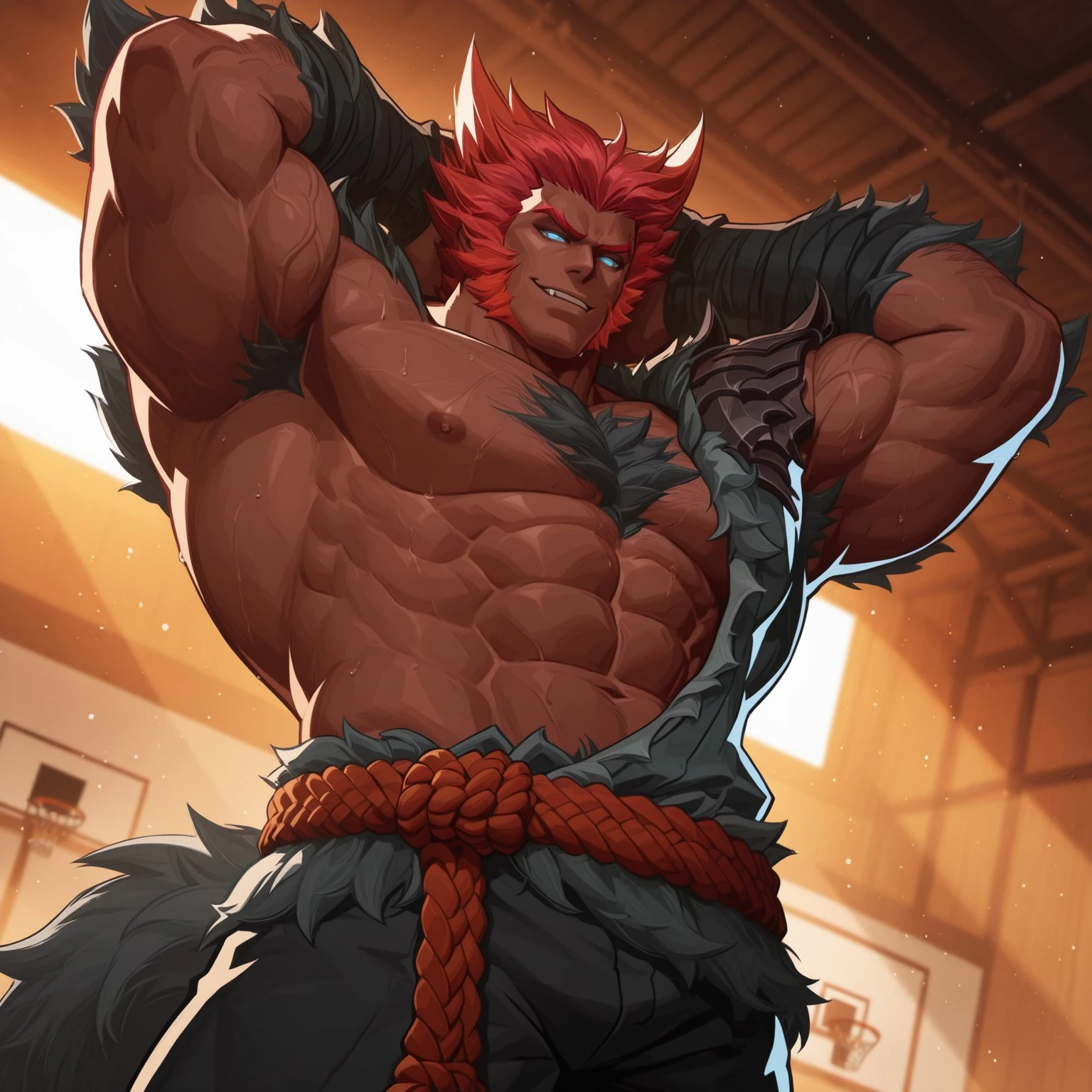 DogBroX, MarvelRivals, muscular male, bodybuilder, mature male, dark skin, blue eyes, no pupils, red hair, spiky hair, body hair, gray gi, rope belt, forearm wraps, foot wraps, gray tail, barefoot,