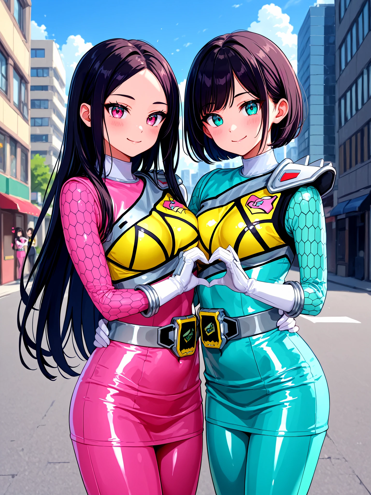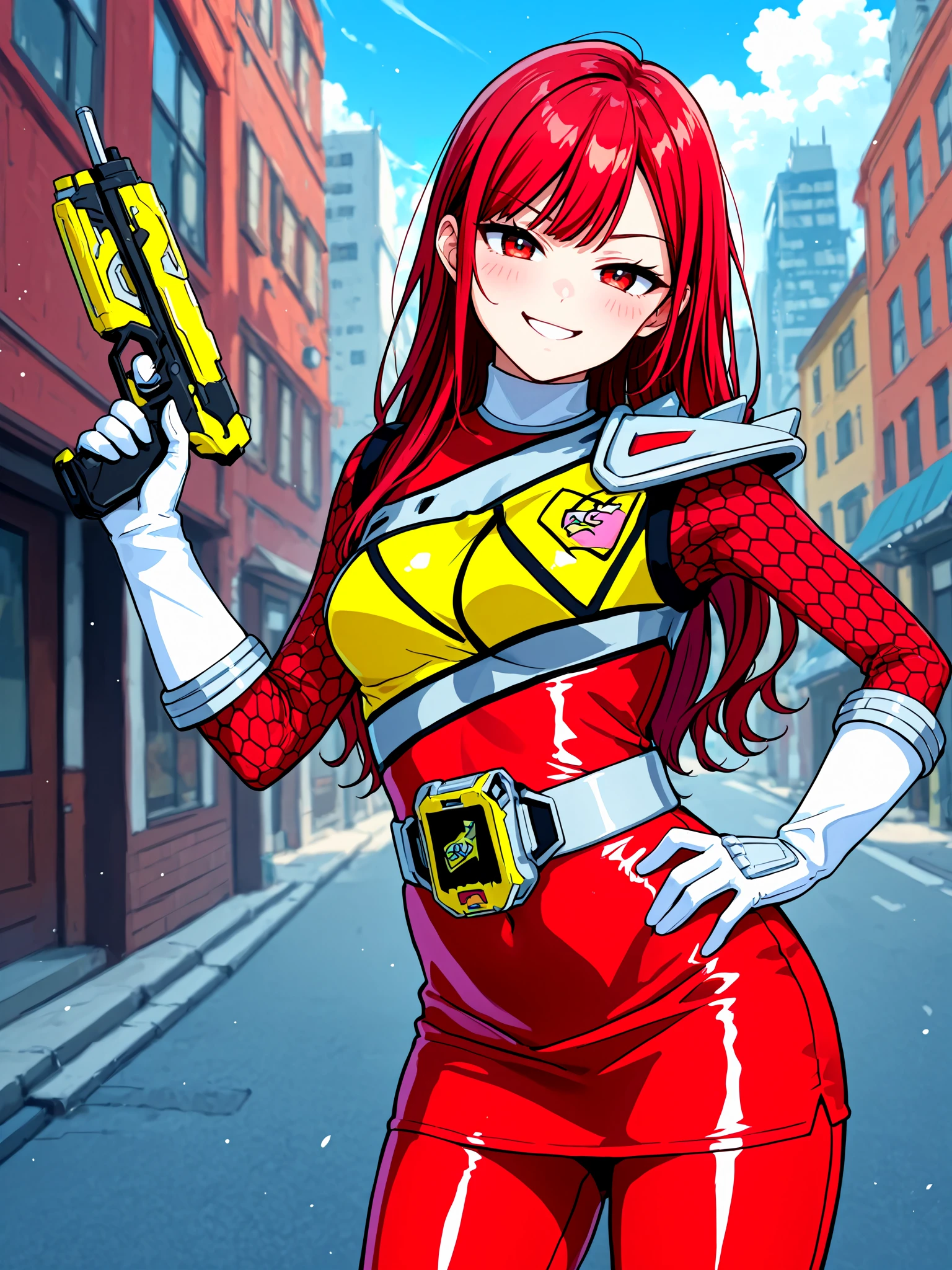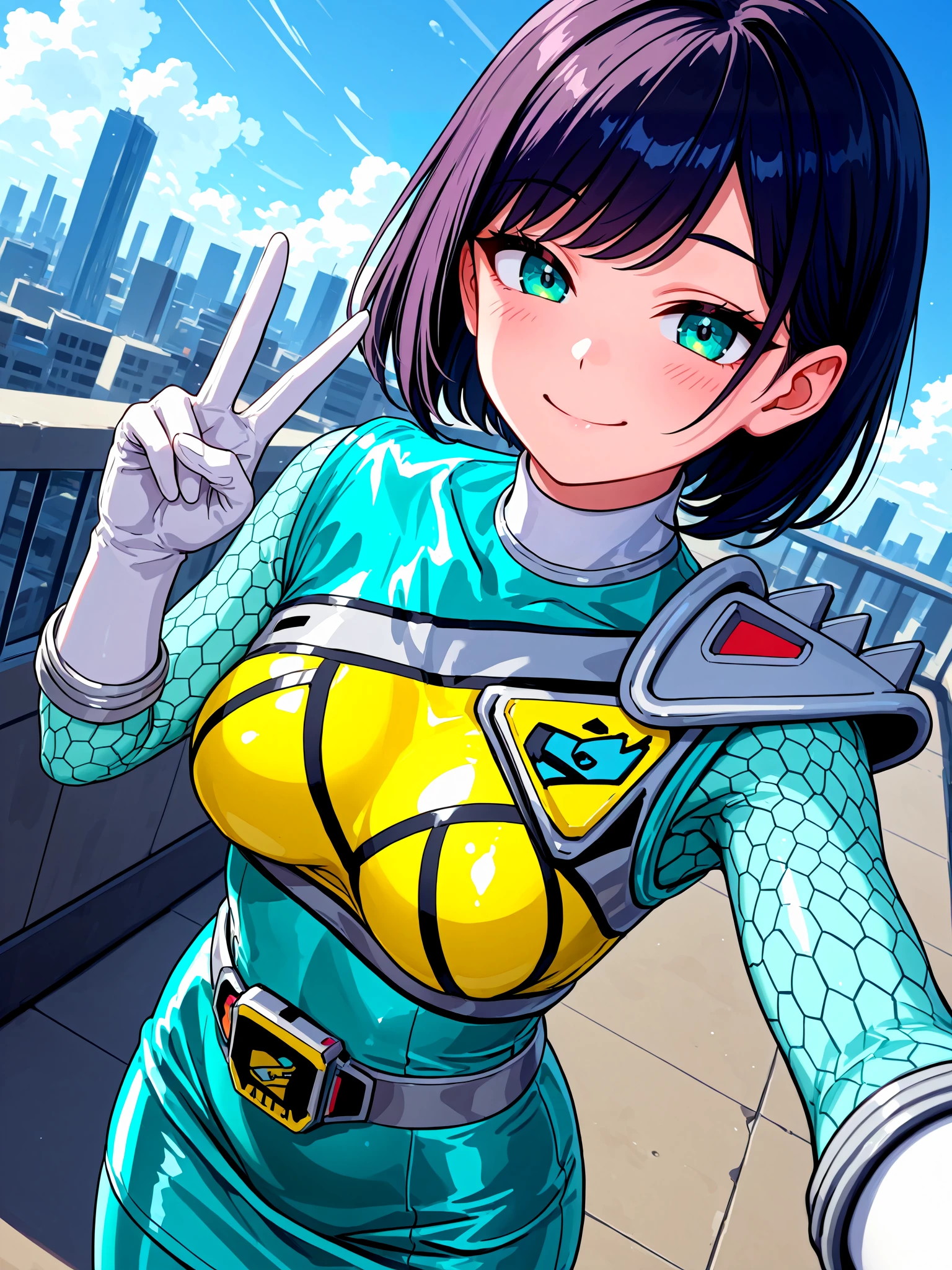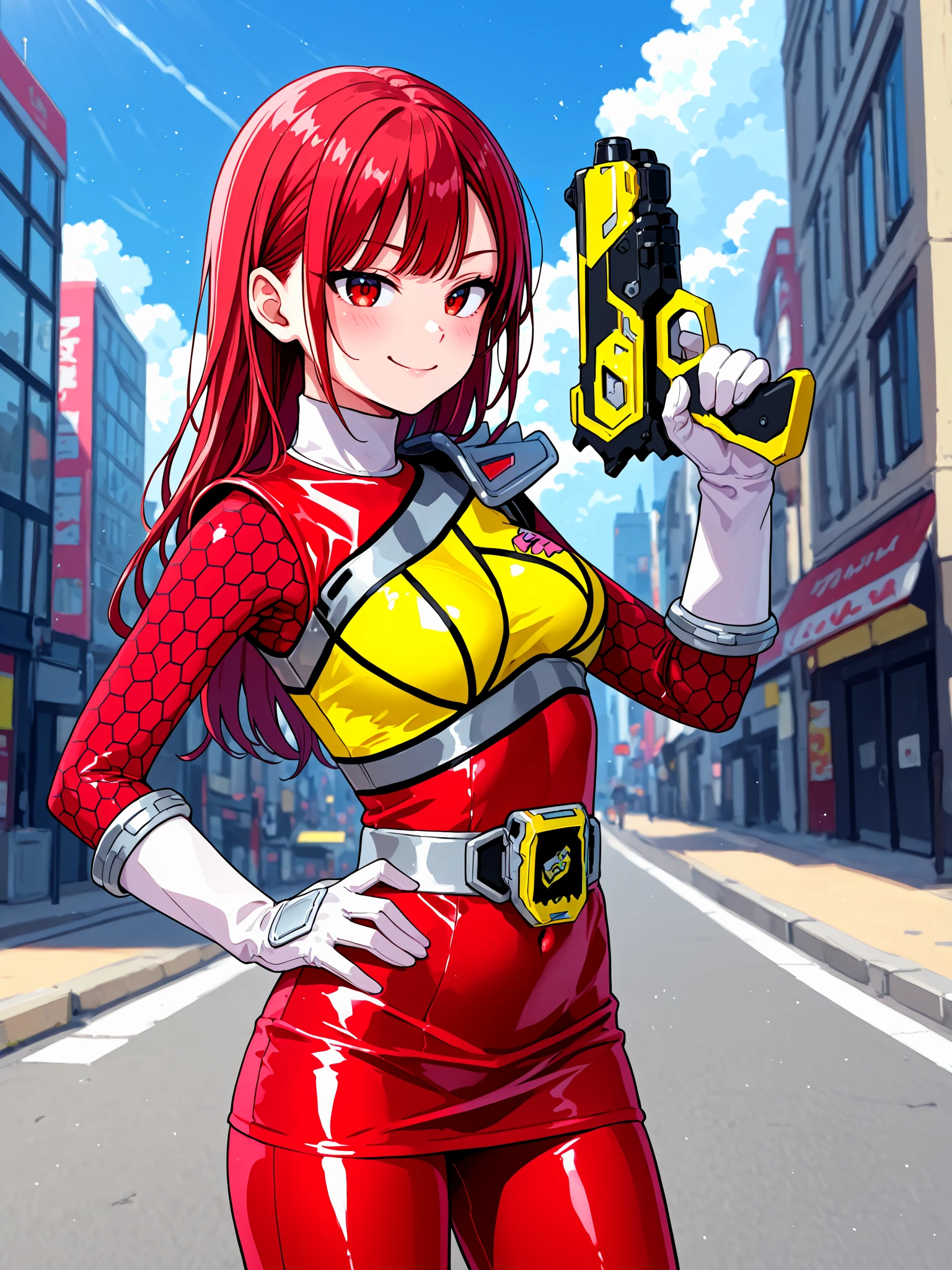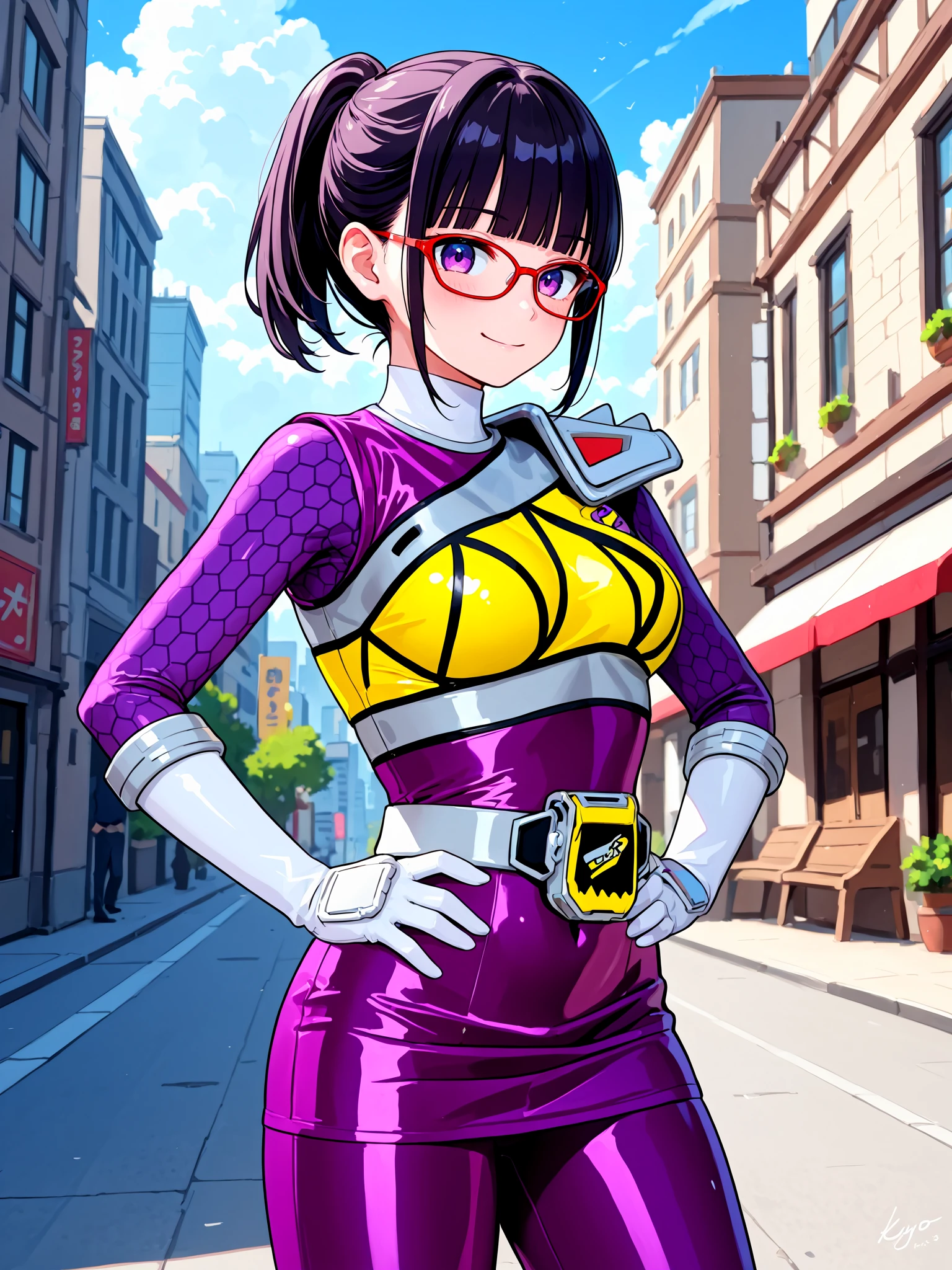 ky0ryug3r, spandex, shiny clothes, [color!] bodysuit, [color!] skirt, white neck, covered neck, single pauldron, silver belt, high belt, white gloves, elbow gloves, honeycomb printPrompts for skirt, use as you prefer (pencil skirt makes it tight, microskirt makes it short, miniskirt is its normal length):