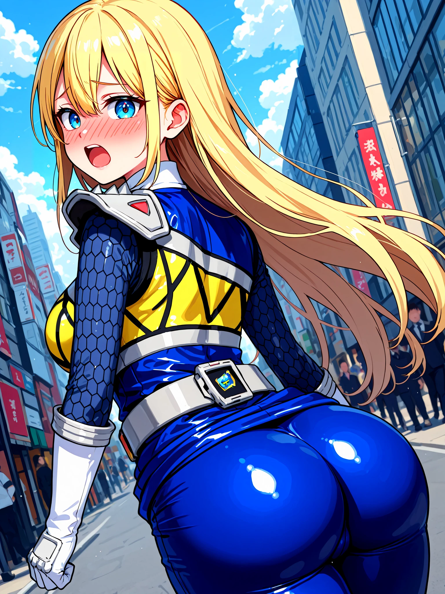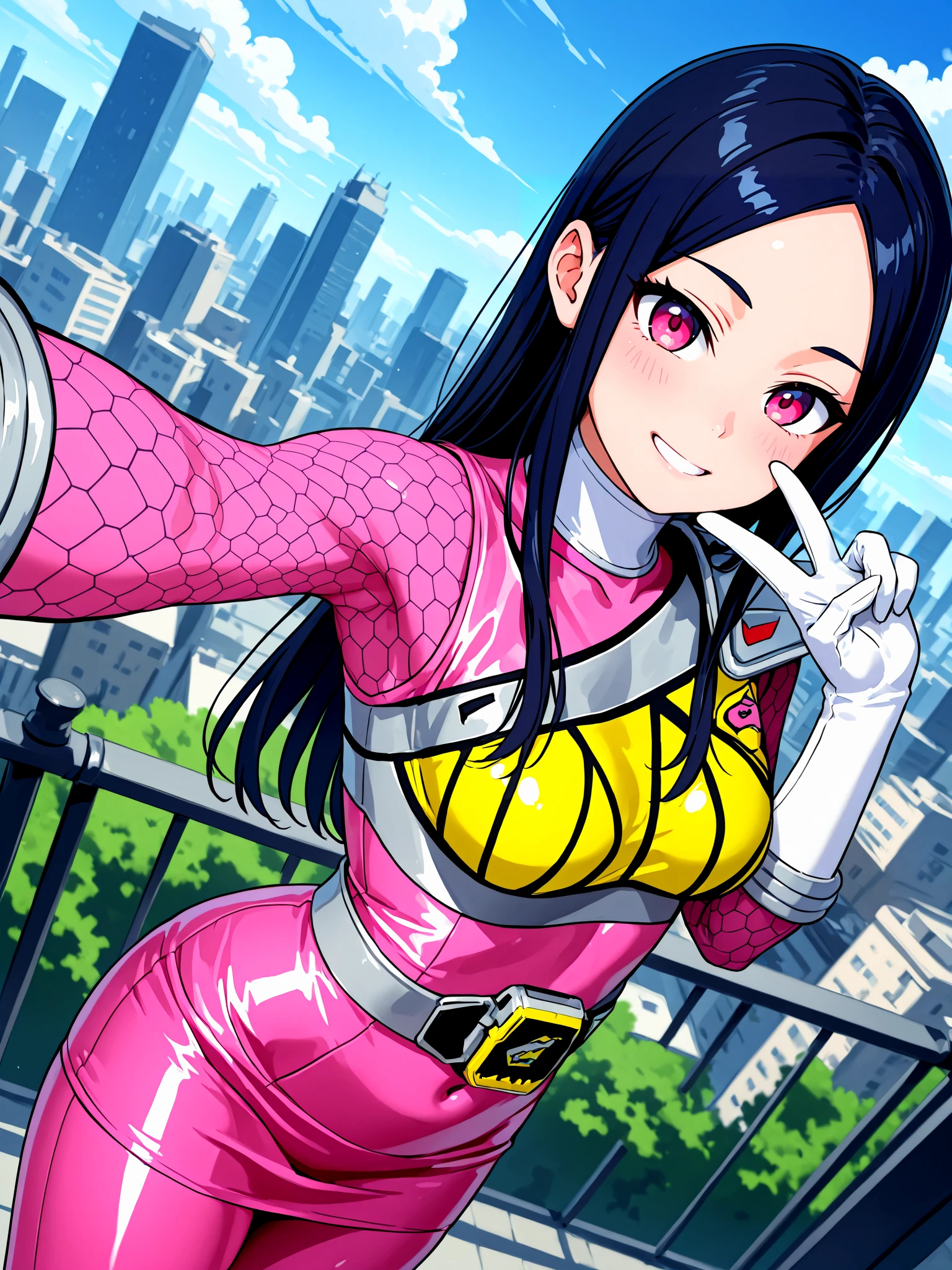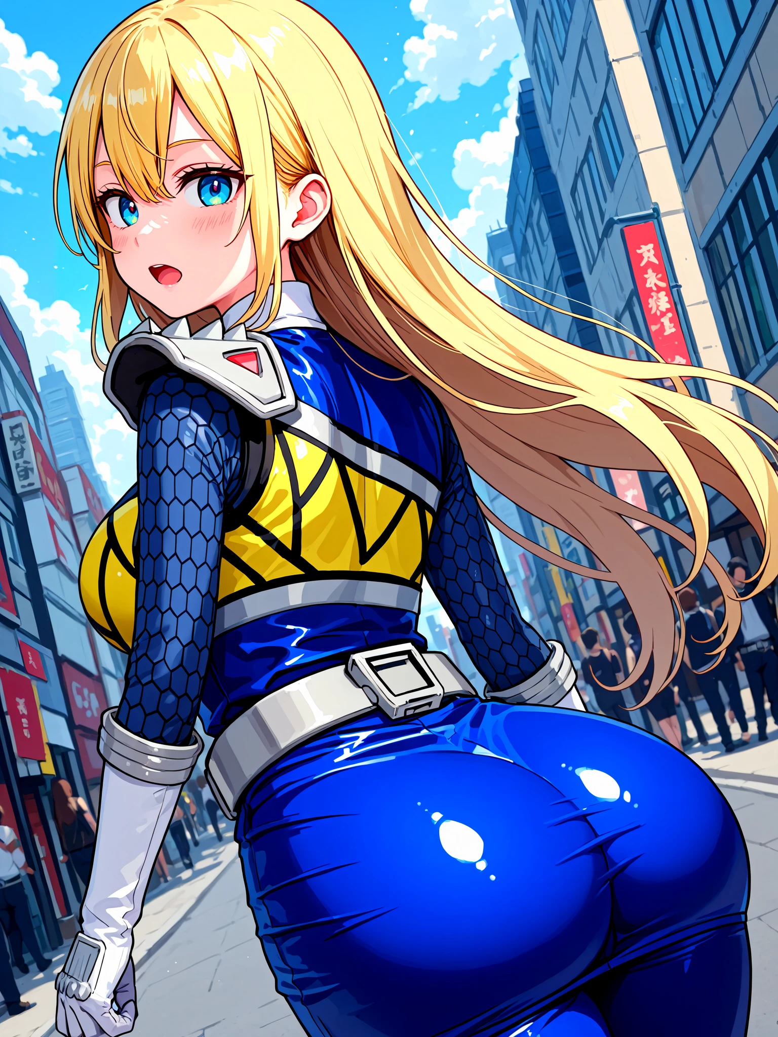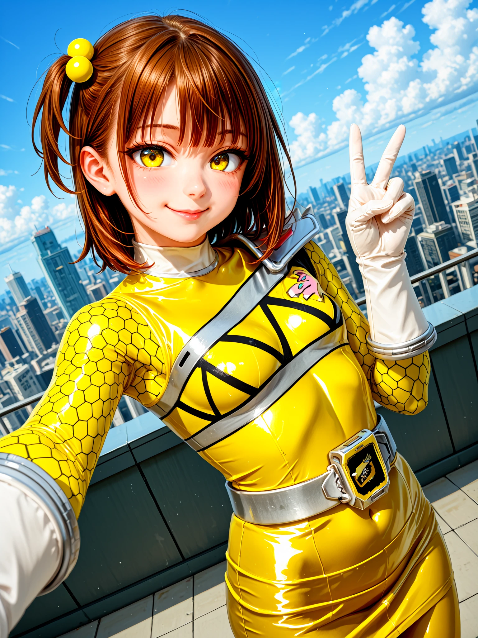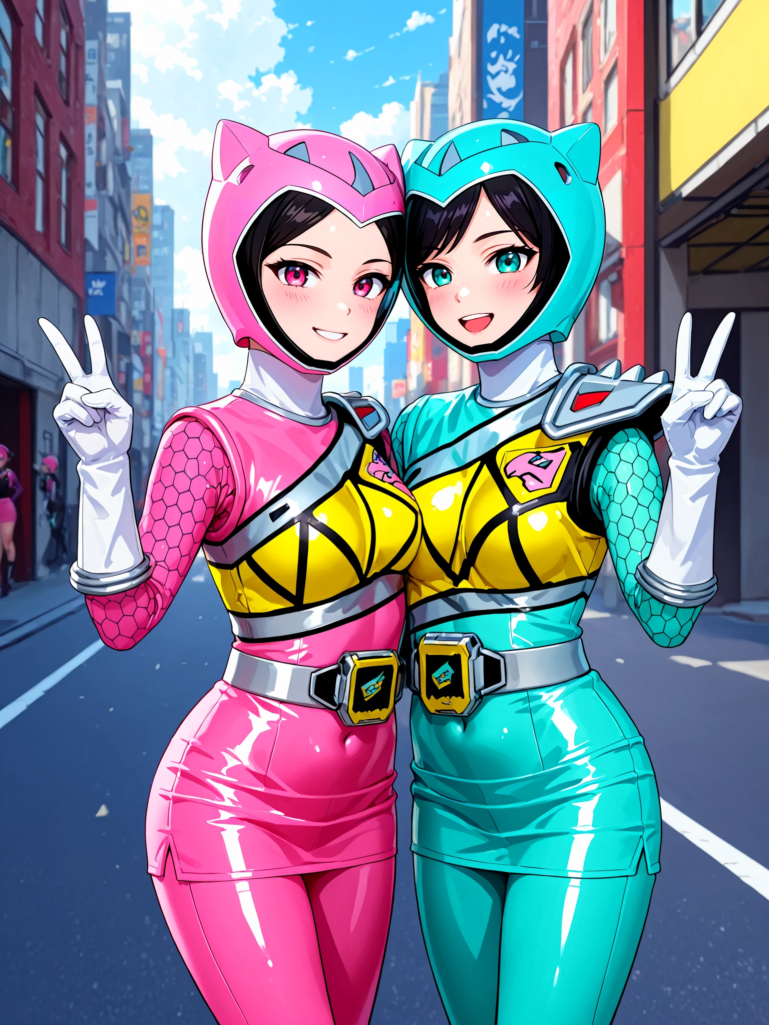 ky0ryug3r, spandex, shiny clothes, [color!] bodysuit, [color!] skirt, white neck, covered neck, single pauldron, silver belt, high belt, white gloves, elbow gloves, honeycomb printPrompts for skirt, use as you prefer (pencil skirt makes it tight, microskirt makes it short, miniskirt is its normal length):