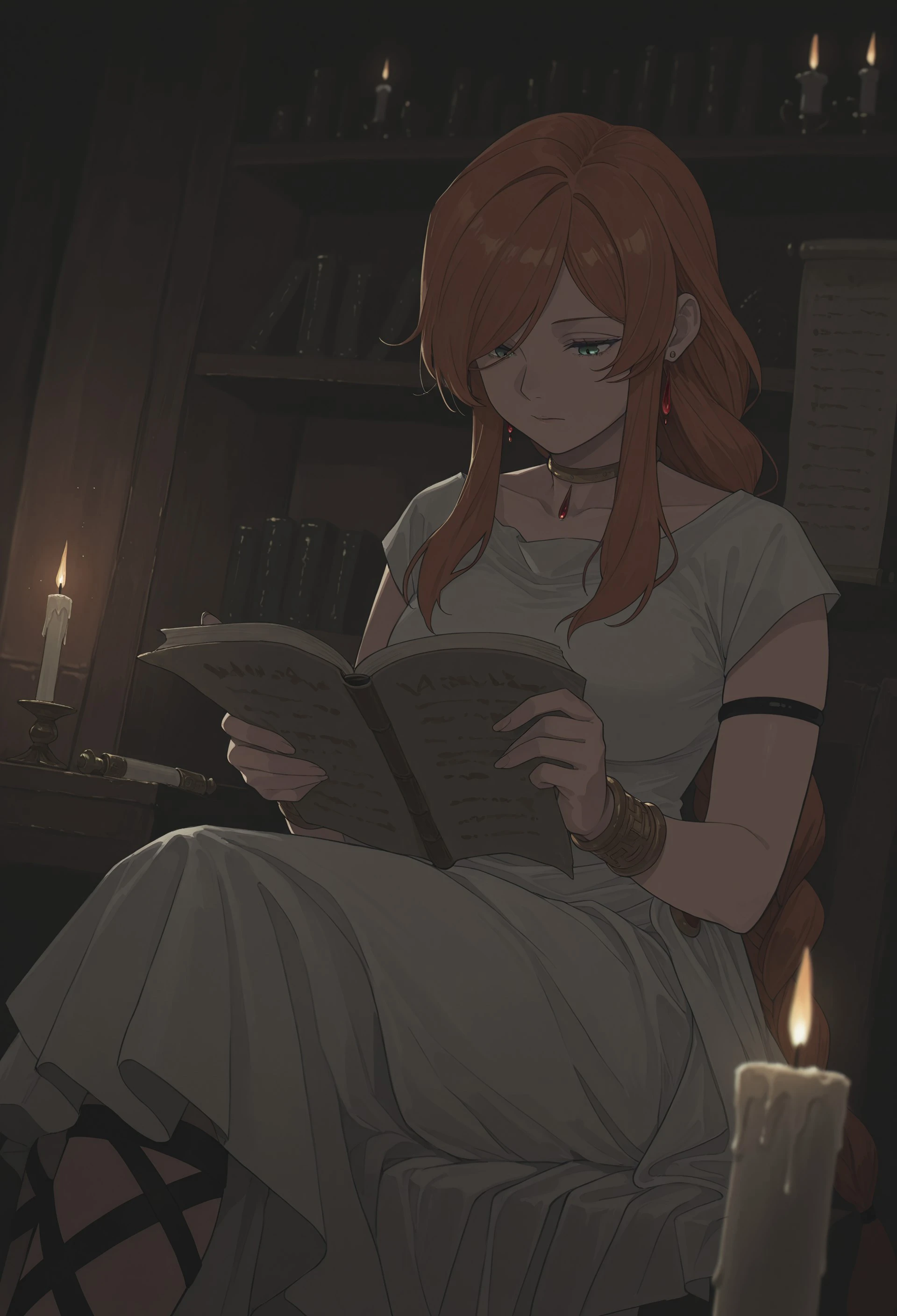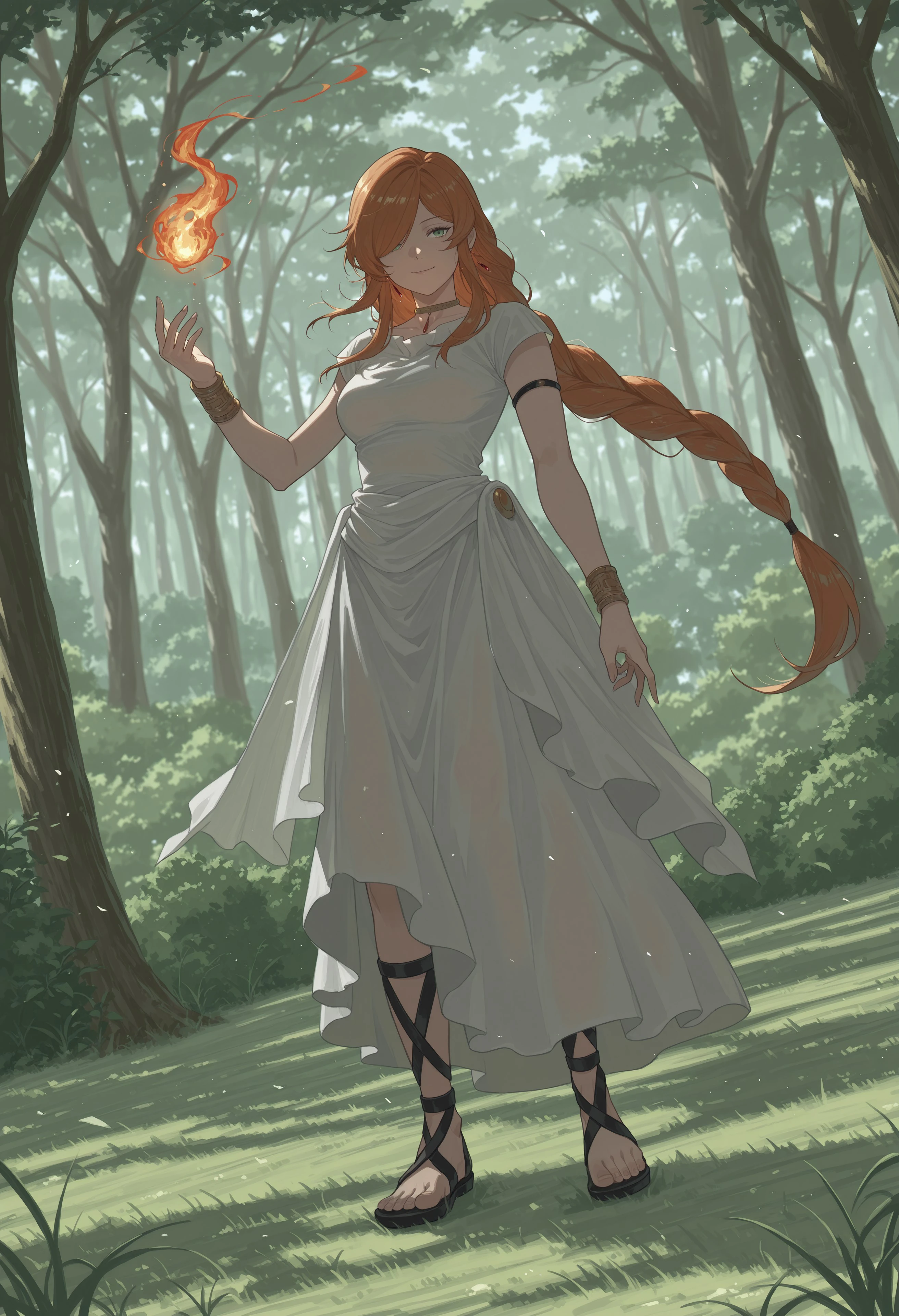 SSNFFLAMME, 1girl, orange hair, very long hair, braided ponytail, single braid, swept bangs, long sidelocks, hair over one eye, one eye covered, green eyes,