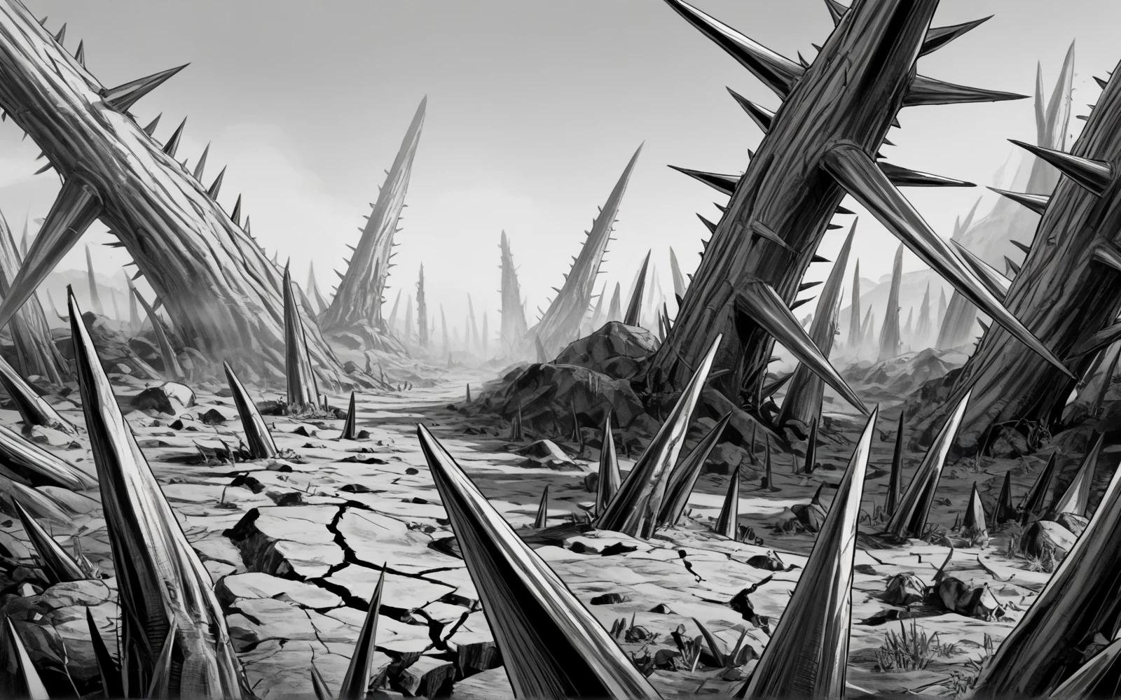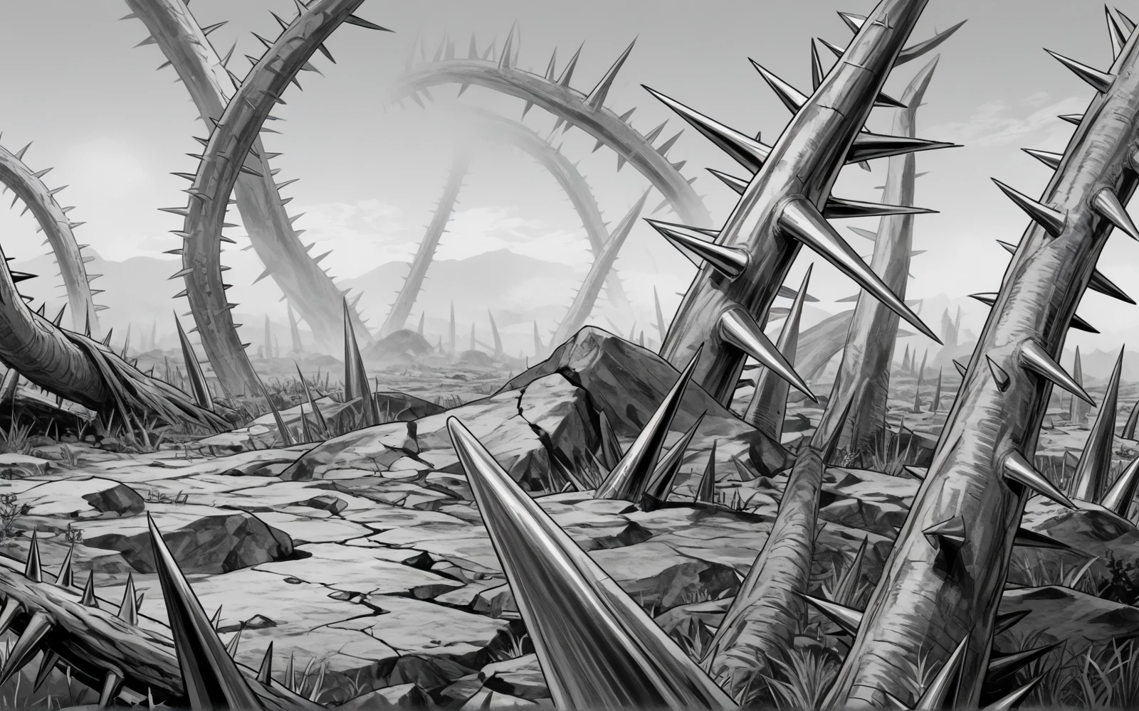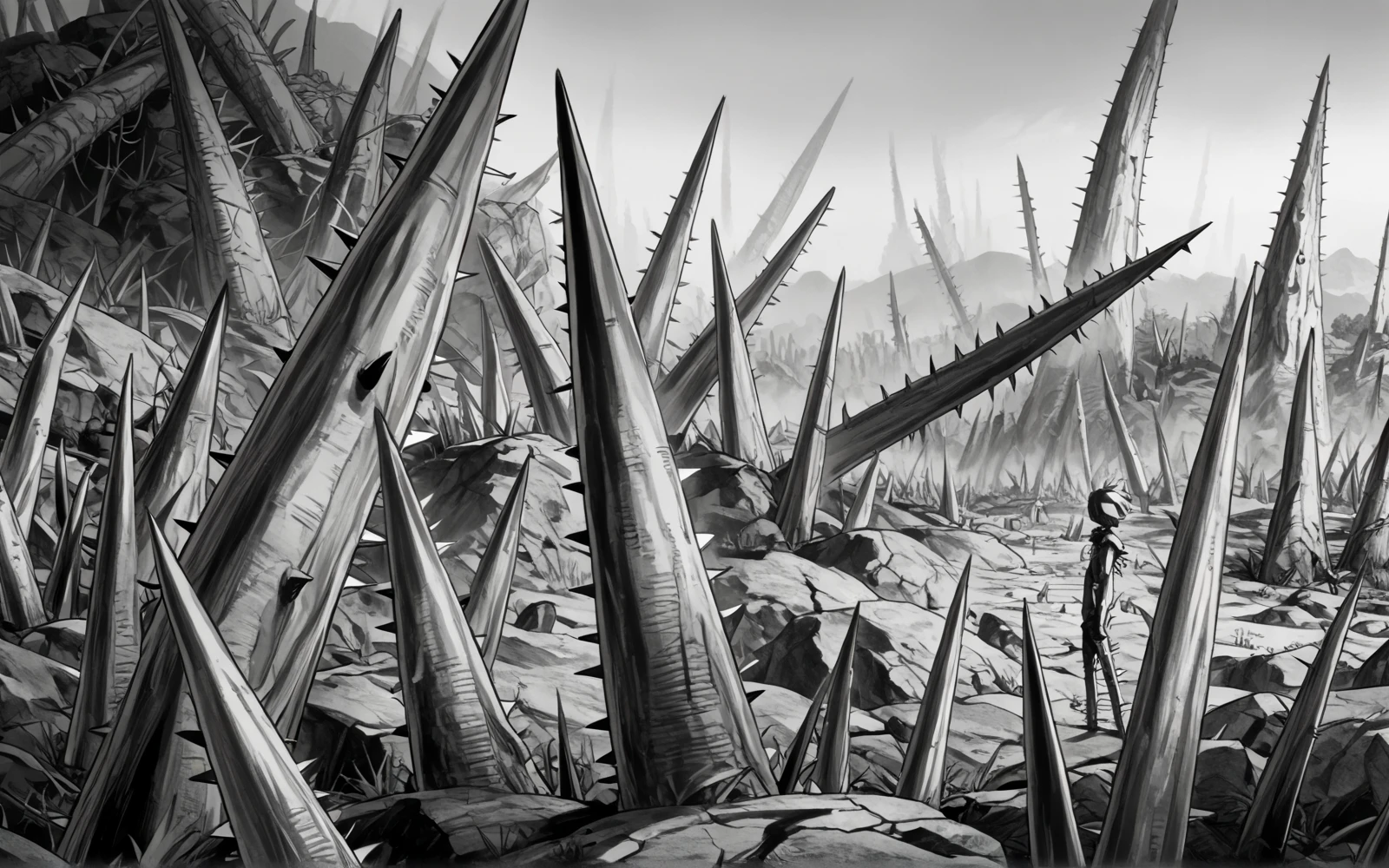 This specific LoRA focuses on hostile spike forests and thorn-filled alien terrain. It is well suited for depicting dangerous worlds, claustrophobic passages, biomechanical or organic environments, underground spike tunnels, and surreal battle locations. The style emphasizes sharp silhouettes, aggressive structures, and strong black-and-white contrast, making it ideal for dramatic and threatening scenes.